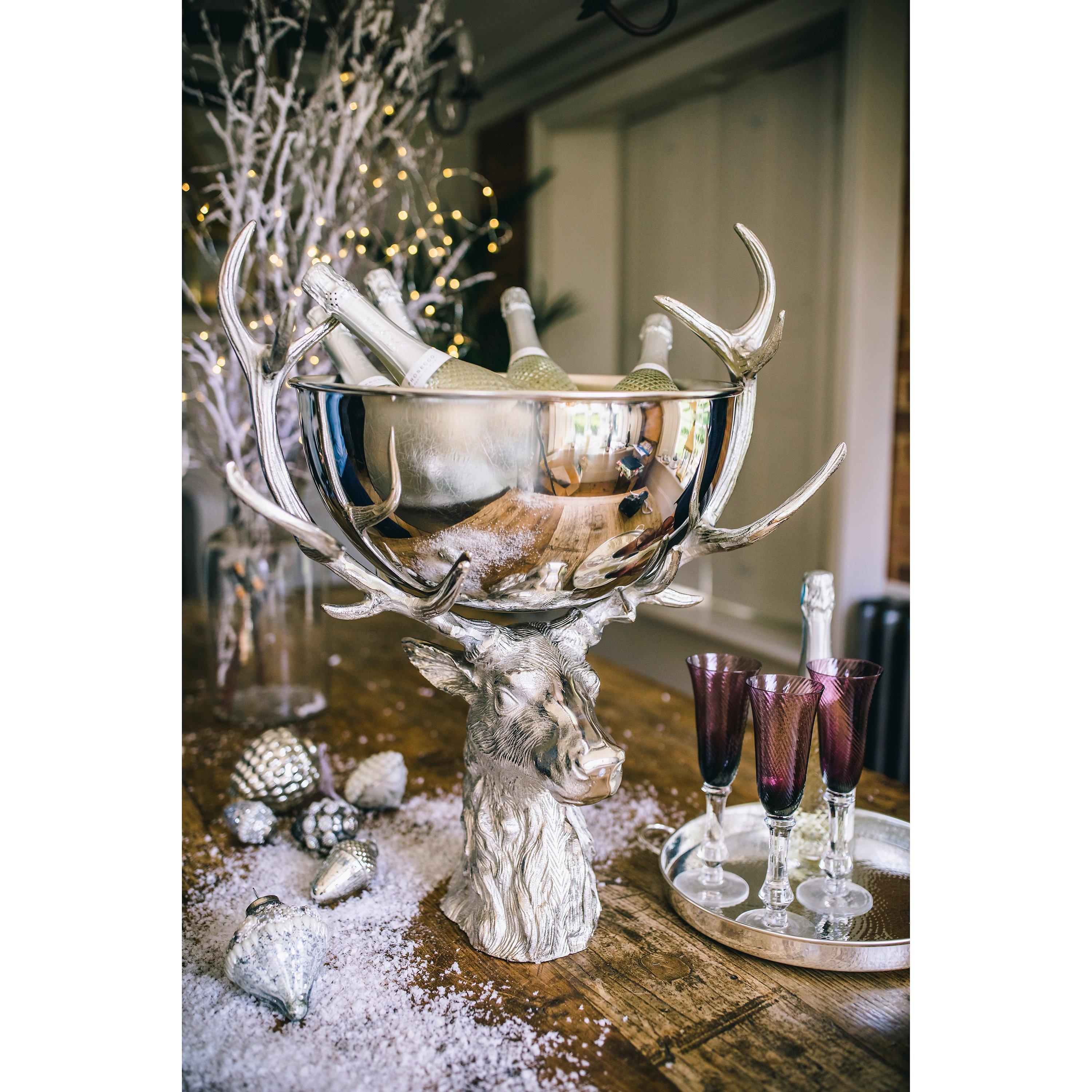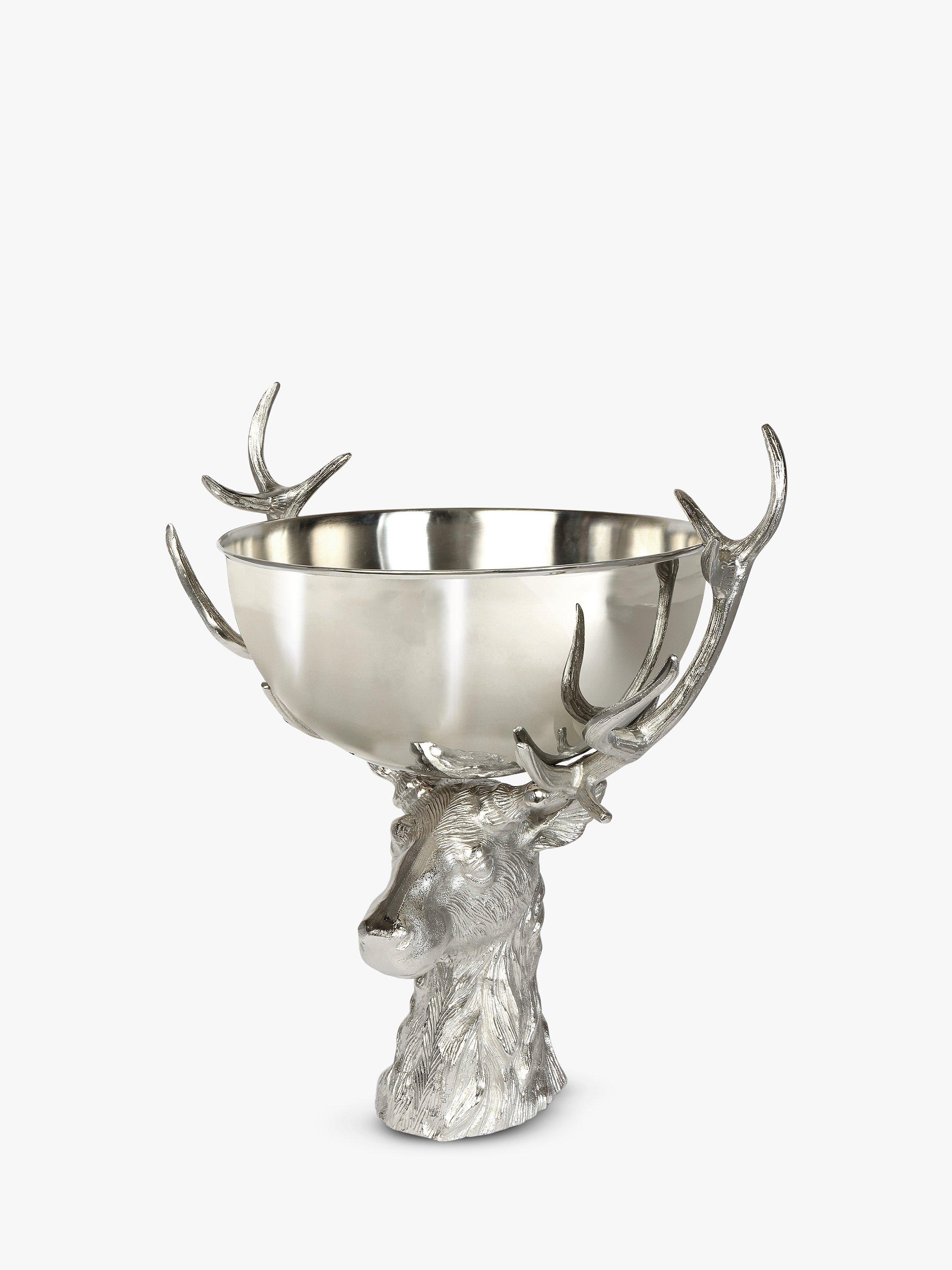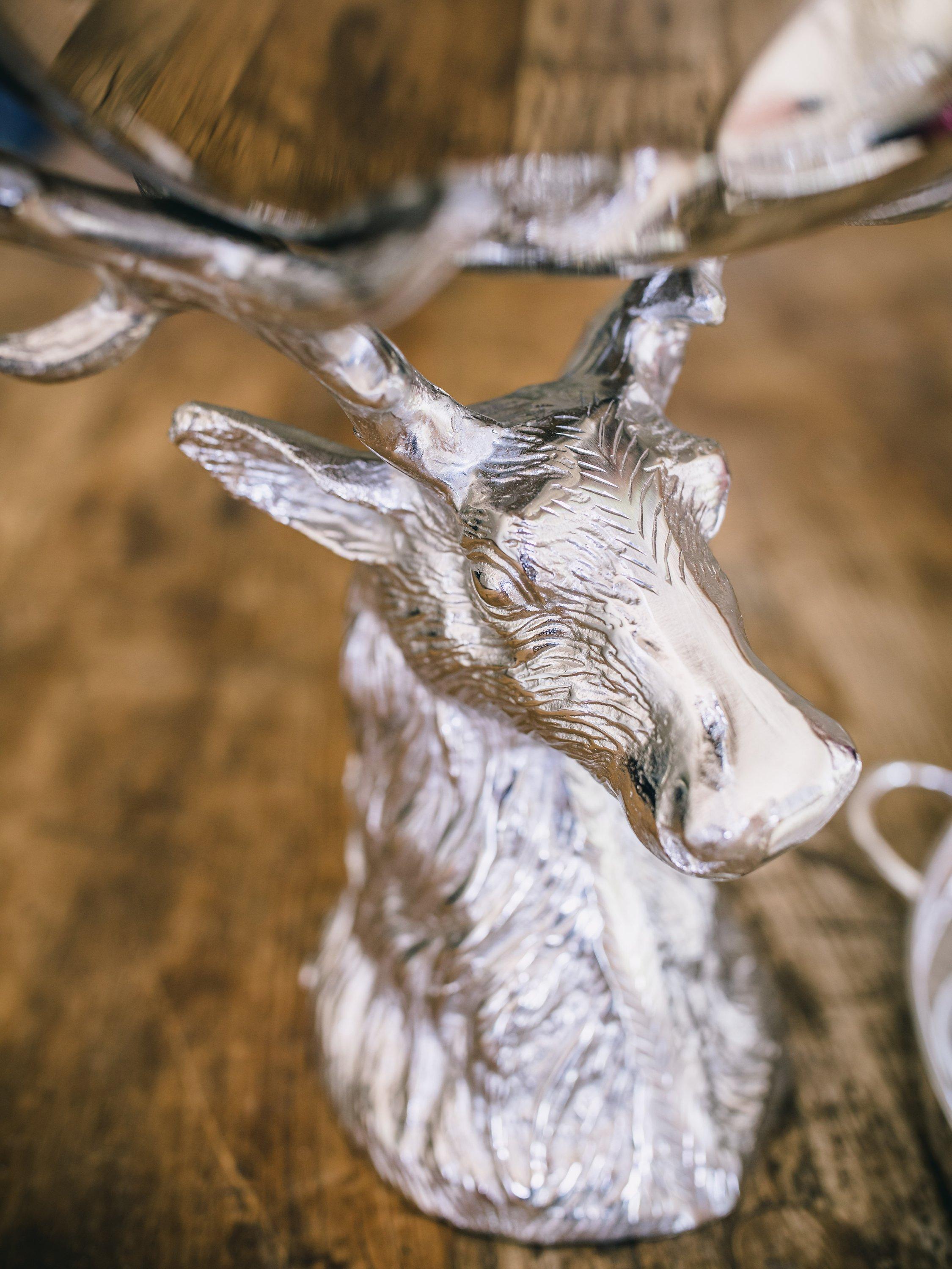 This magnificent stag head, made from Nickel Plated Aluminium, holds aloft the Stainless Steel bowl with his sturdy antlers.