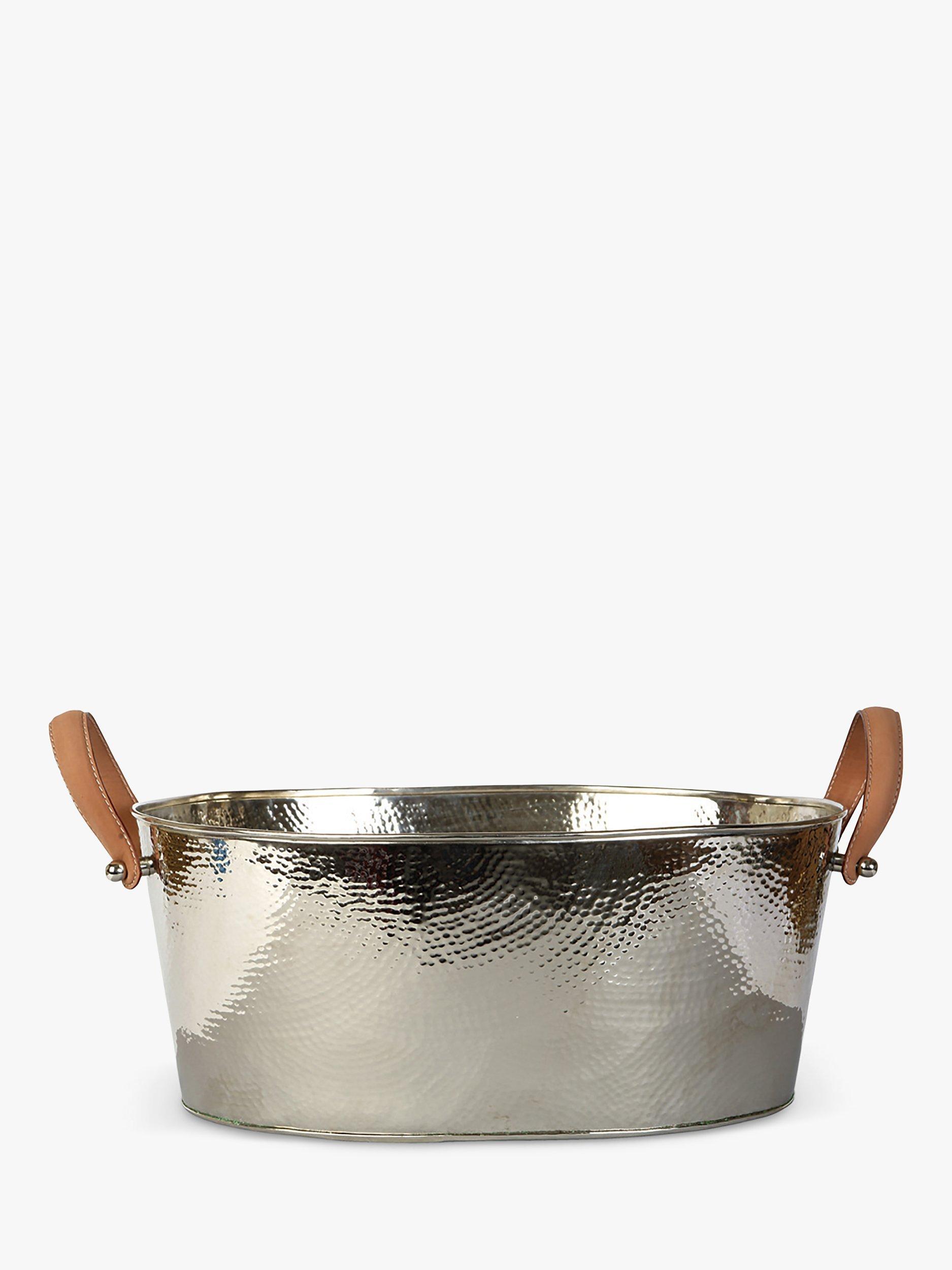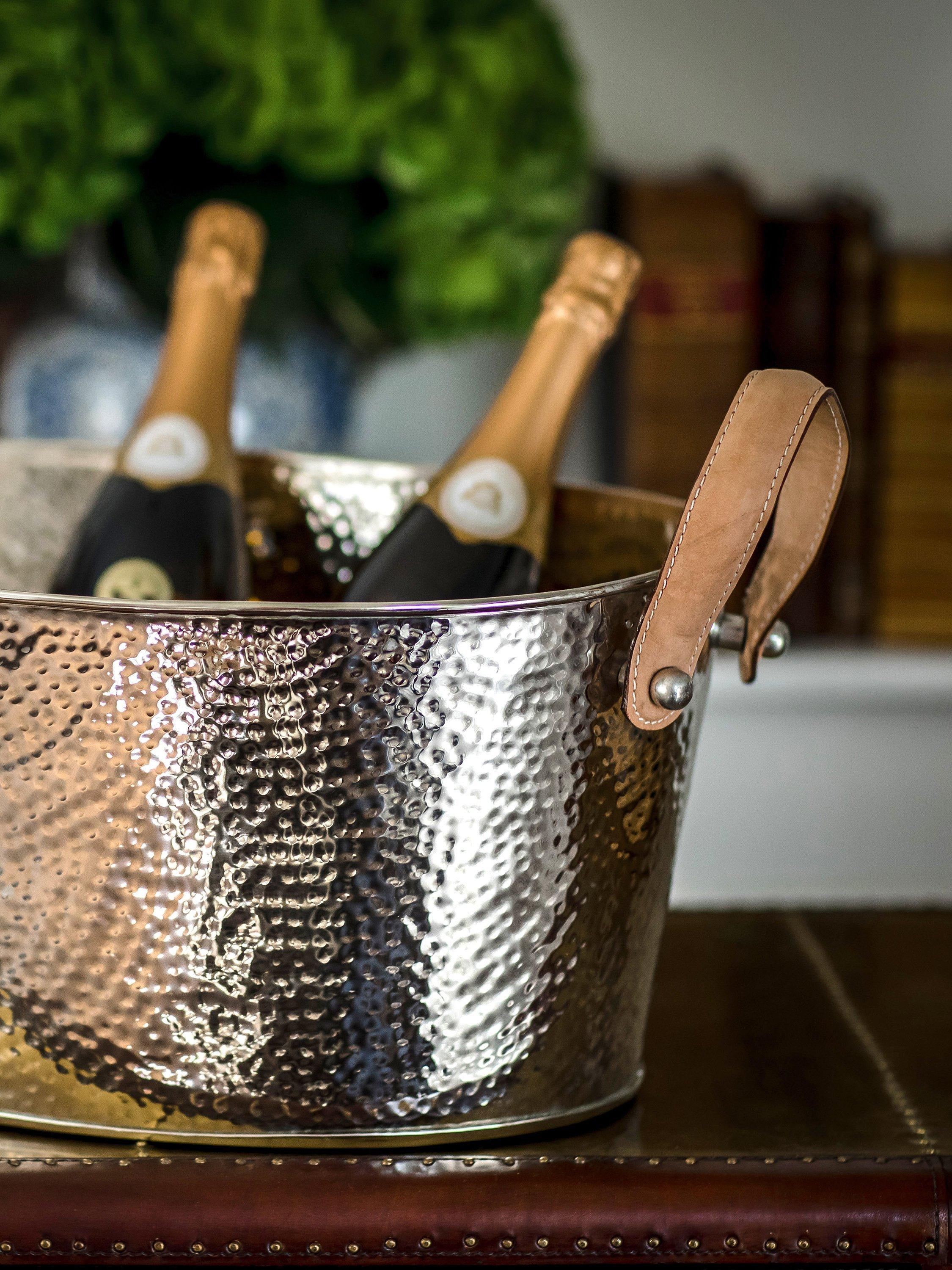 Made from nickel-plated steel it has a dimpled hammered finish and tan leather handles so you can easy move it even if full of bottles.