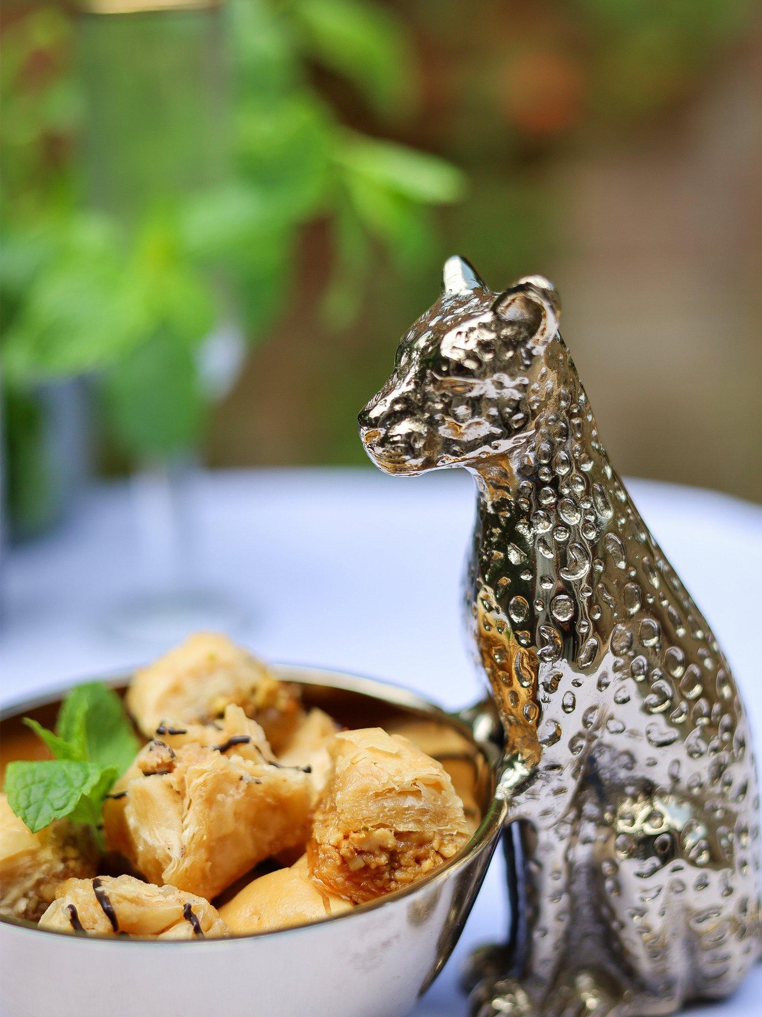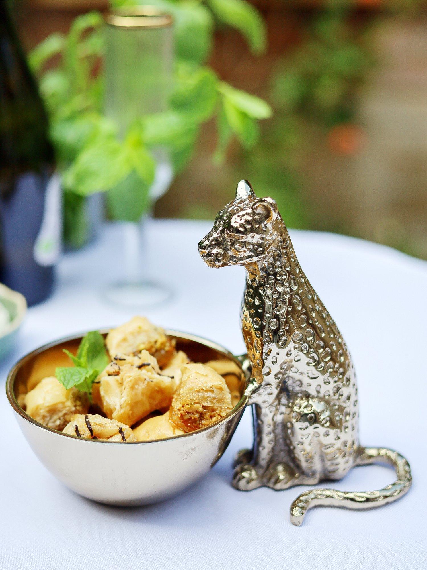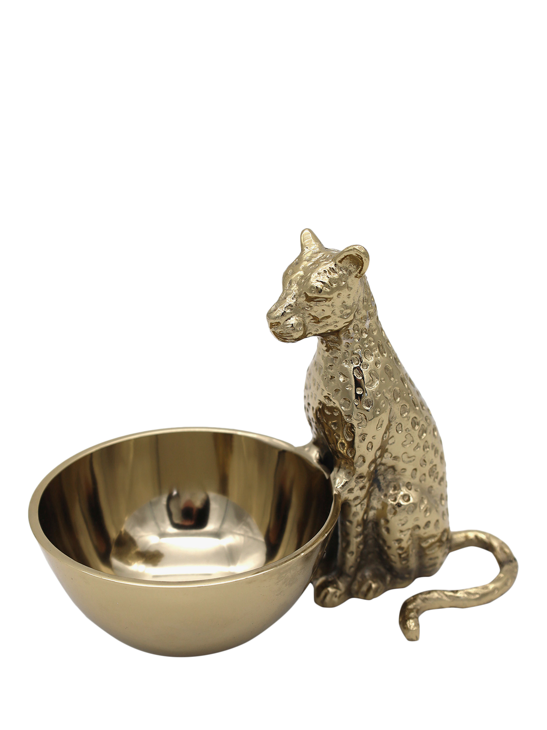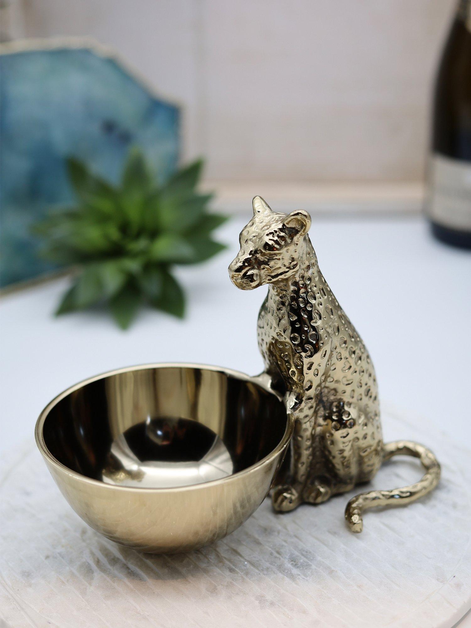 A striking way to serve snacks or dining garnishes. Finished in a gold tone with intricate detailing, the seated leopard is a watchful presence over the bowl, making it as decorative as it is practical.