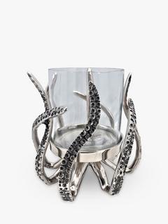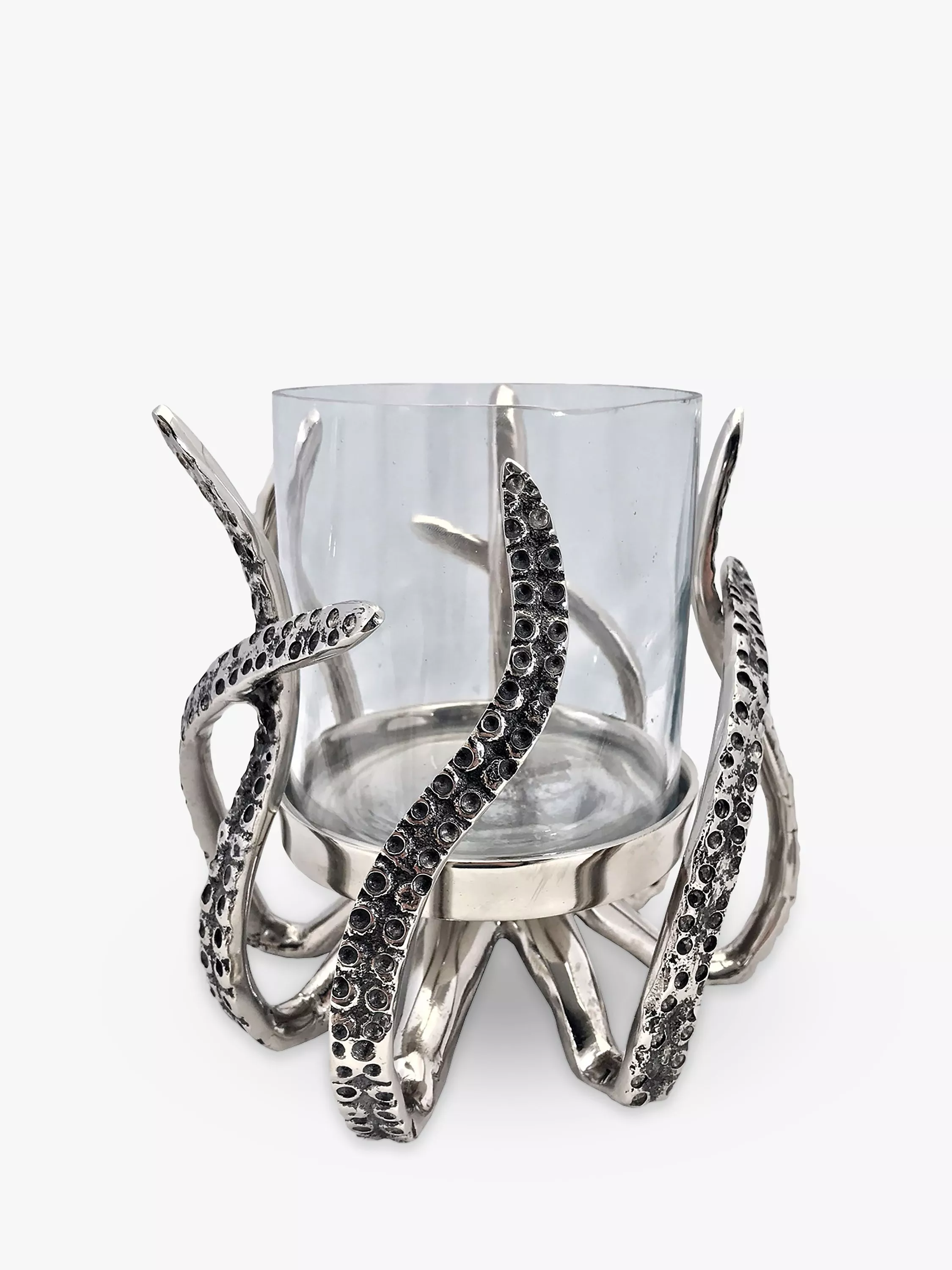 Beautifully crafted, a nickel-plated octopus holds aloft a glass hurricane lantern by its tentacles. An eye-catching candle holder from Culinary Concepts for a mantlepiece, windowsill or coffee table.