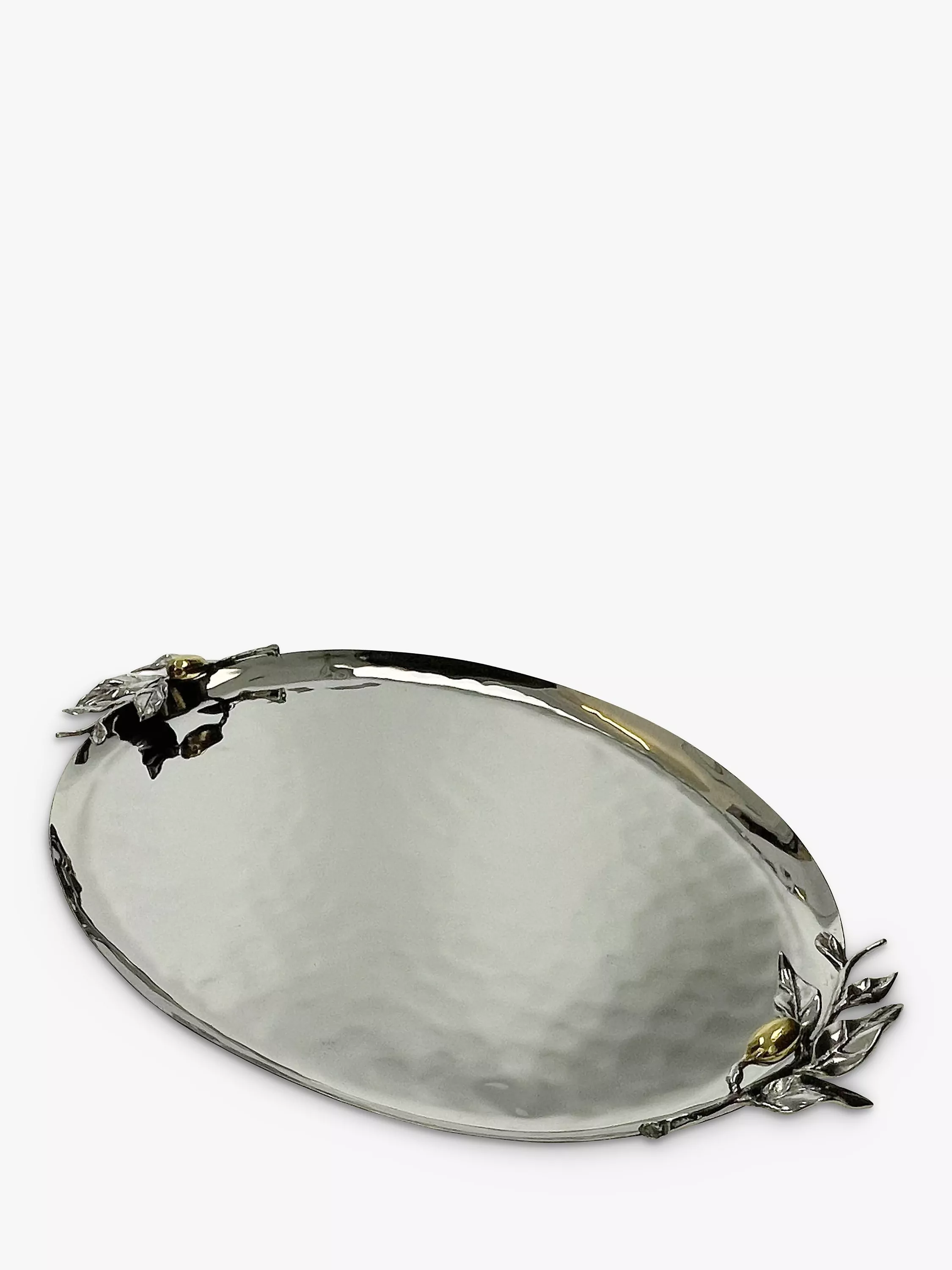 Large oval serving tray from Culinary Concepts made of subtly hammered stainless steel for texture. Mediterranean-inspired and decorated at either end with a beautiful olive leaf motif and golden olive.