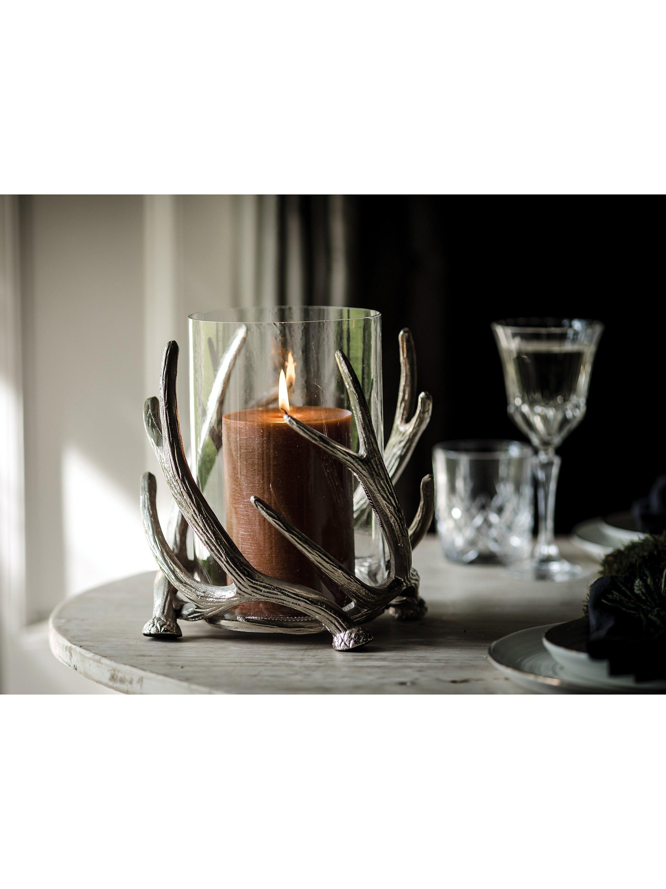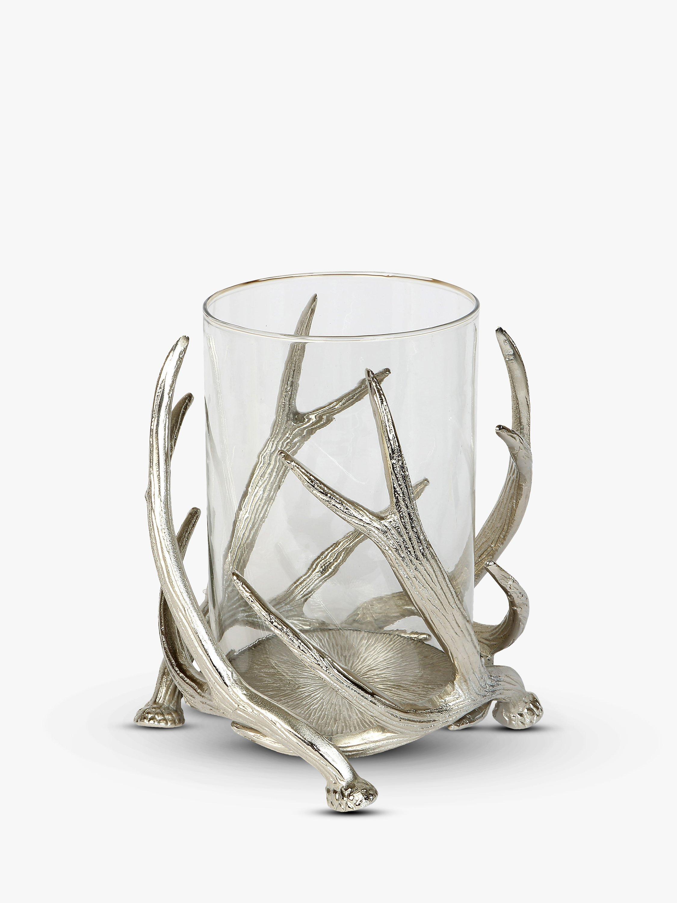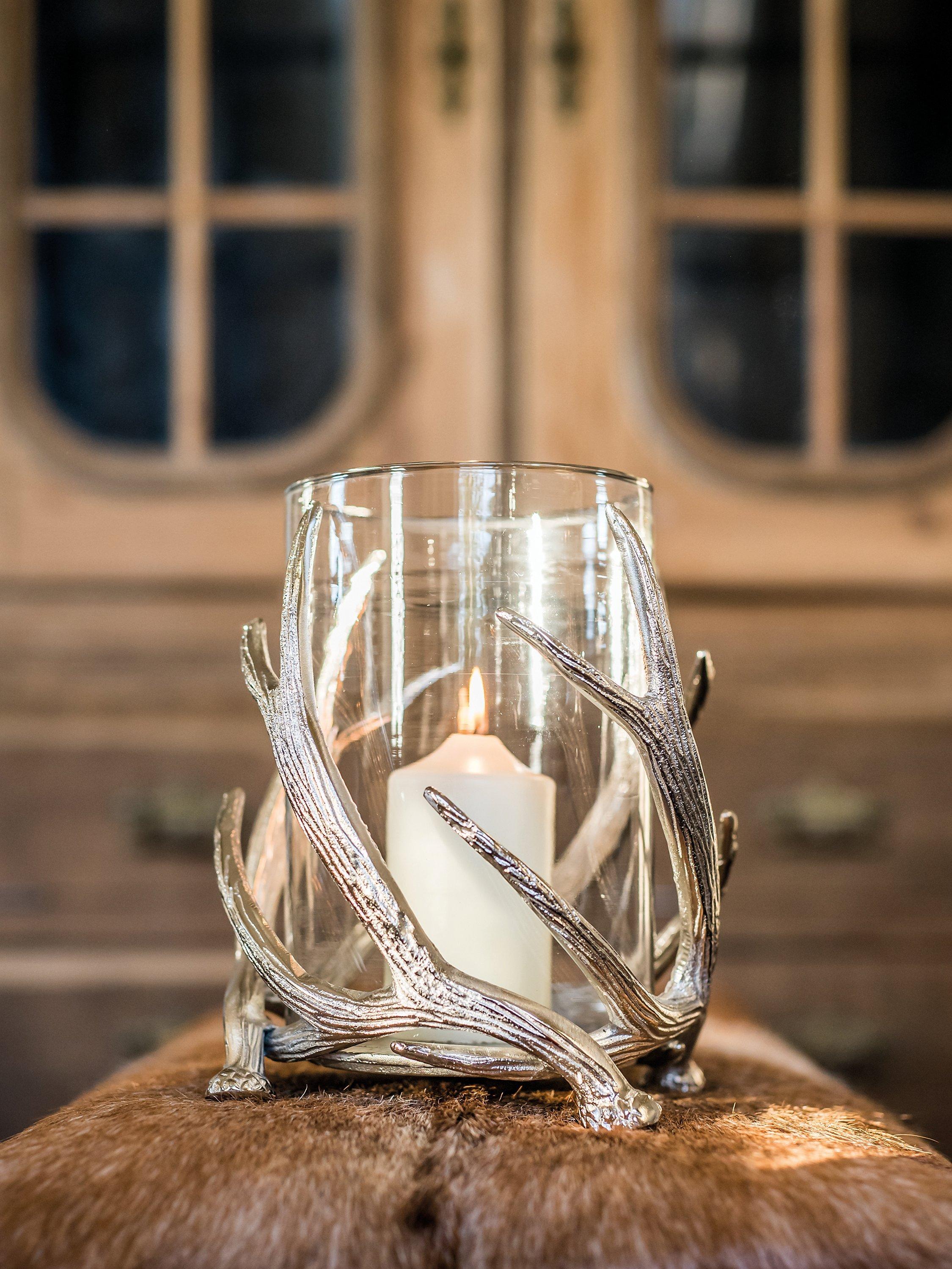 Made from quality nickel plated aluminium, the antlers entwine majestically around the removable hurricane glass to make a majestic centrepiece or mantel addition.