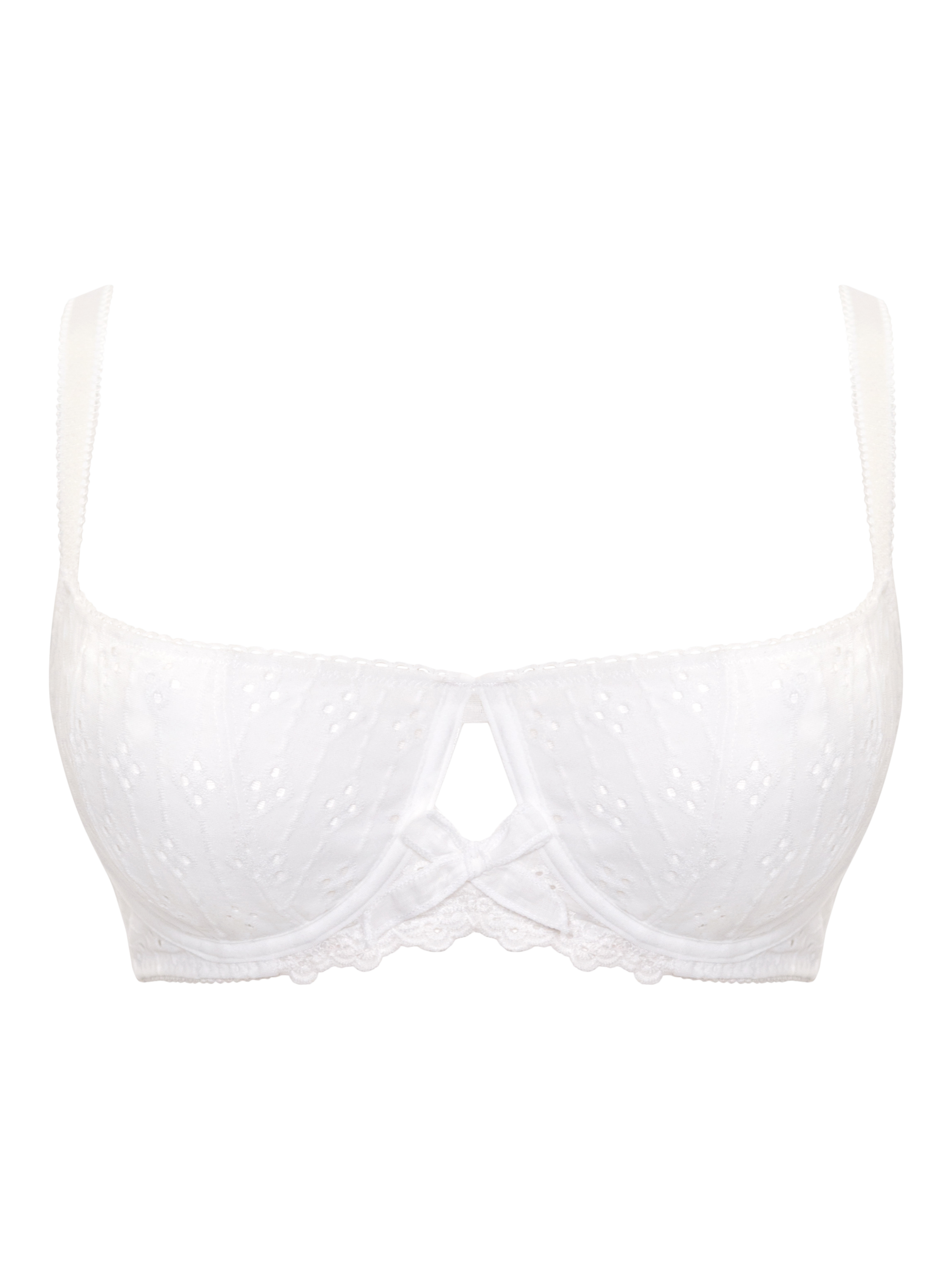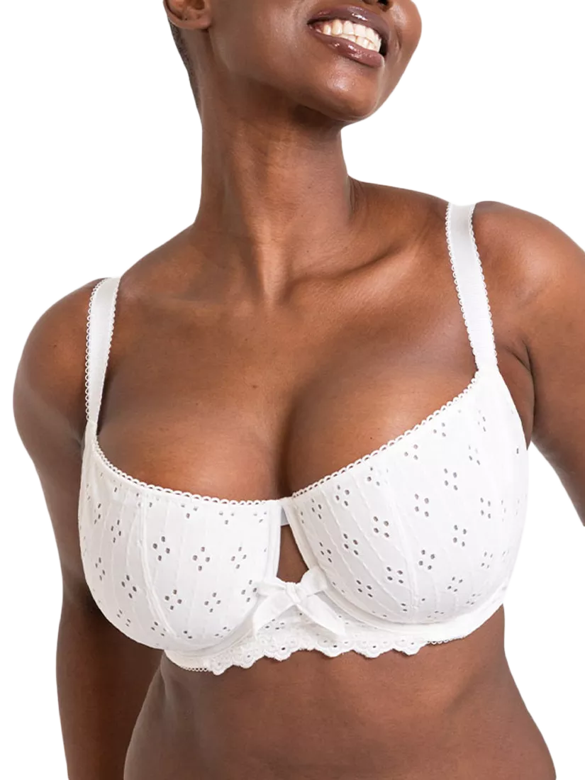The Delicate floral broderie anglaise-look material with matching trim makes this a super feminine and on-trend bra. The vertical cup seam offers a rounded cup shape, all trimmed with pretty edging and girly bows.