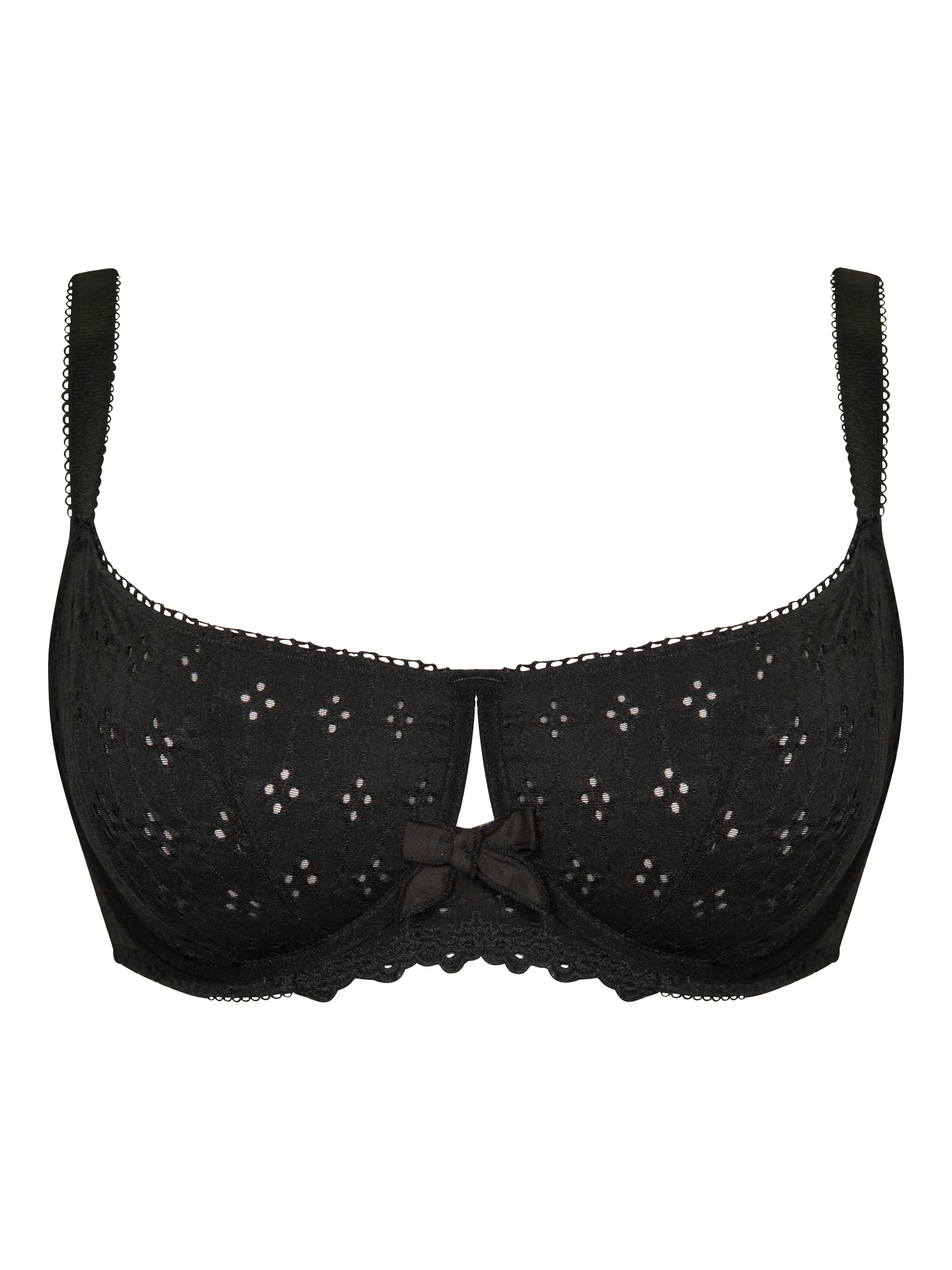 Flora features a non-padded underwired balcony shape with broderie anglaise-look fabric that enhances the cup with vertical seams for a beautifully rounded shape. Delicate edging and bows complete the feminine design. It offers both style and support for everyday wear.