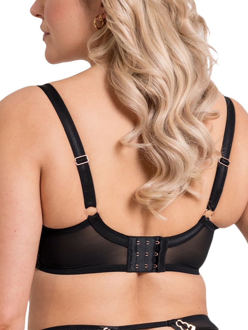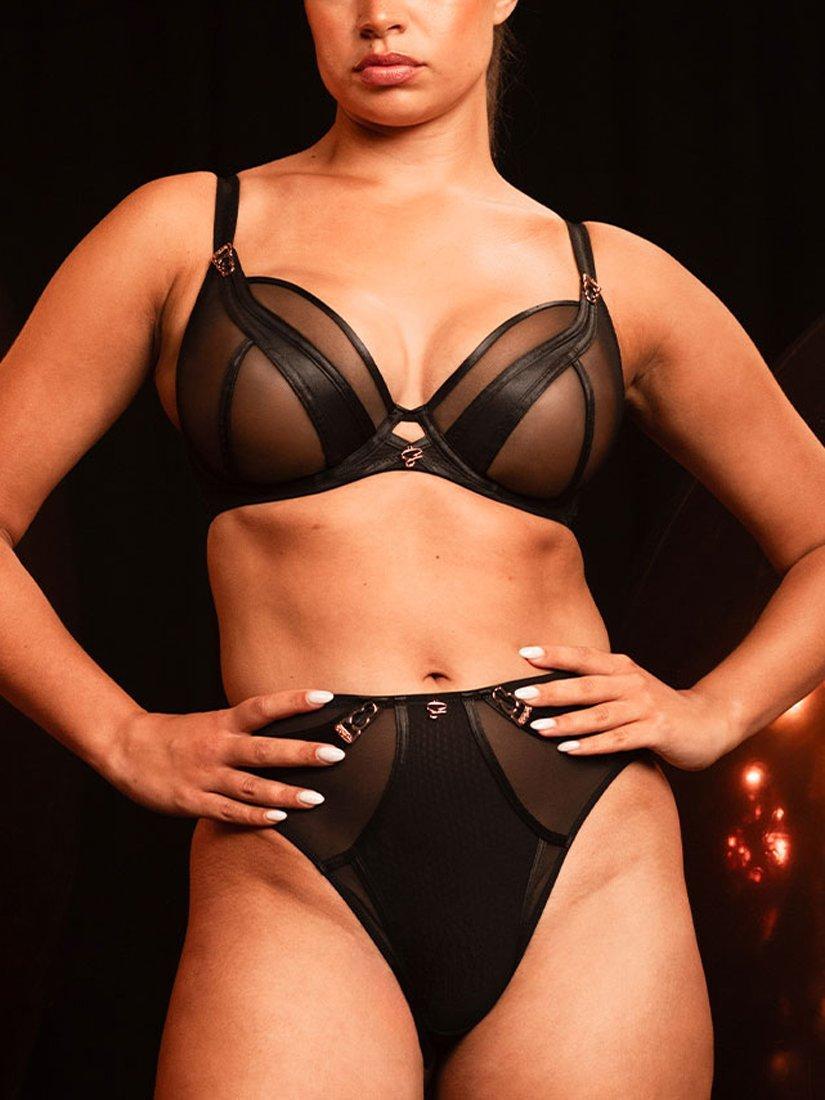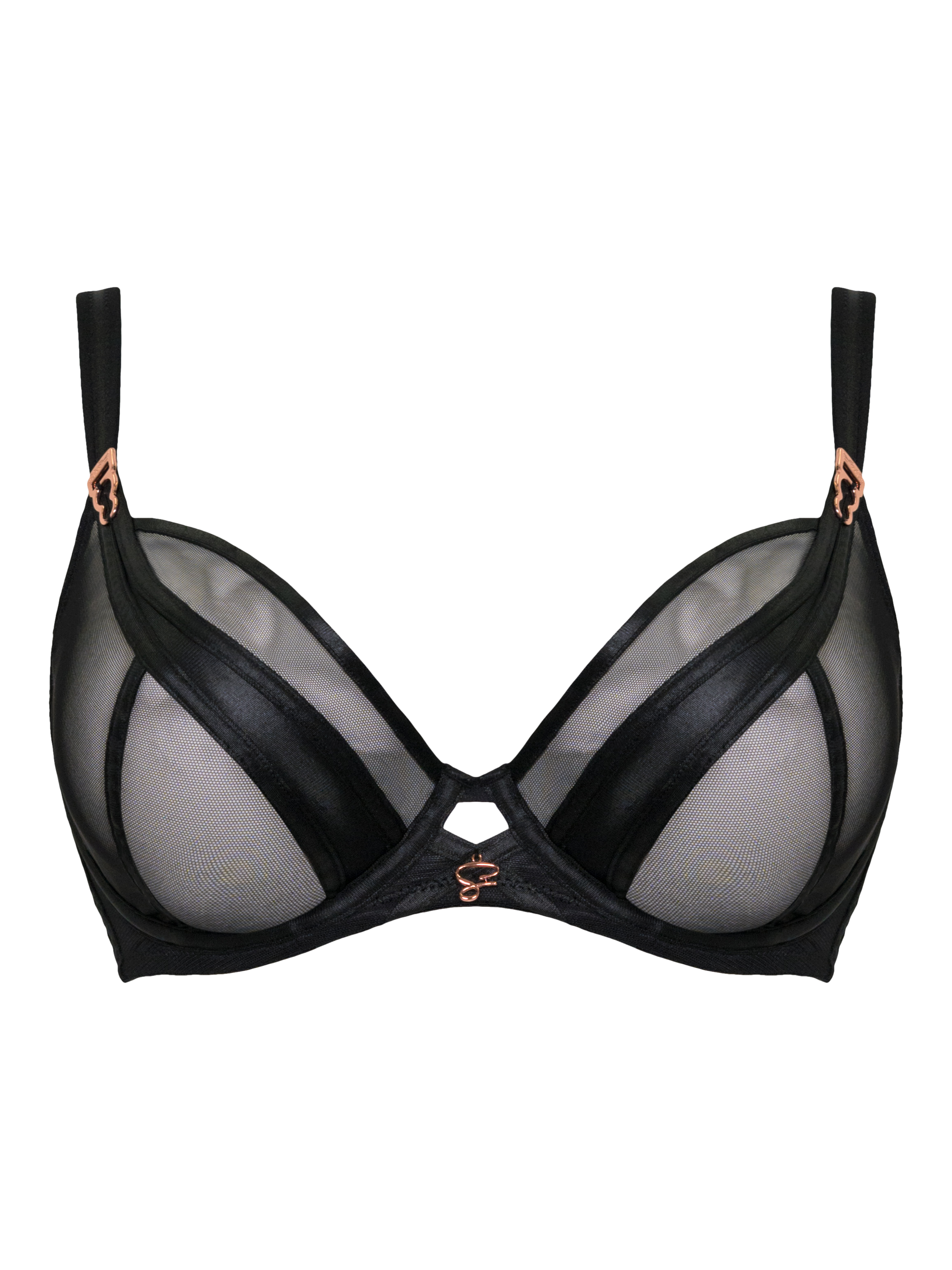 Suspense is a vintage-inspired statement range. The Plunge bra has lightweight shimmering panels applied to enhance the curves and to offer underwear as outerwear styling and includes branded rose gold suspender clip details.
