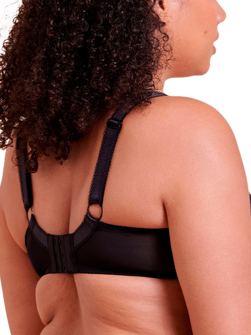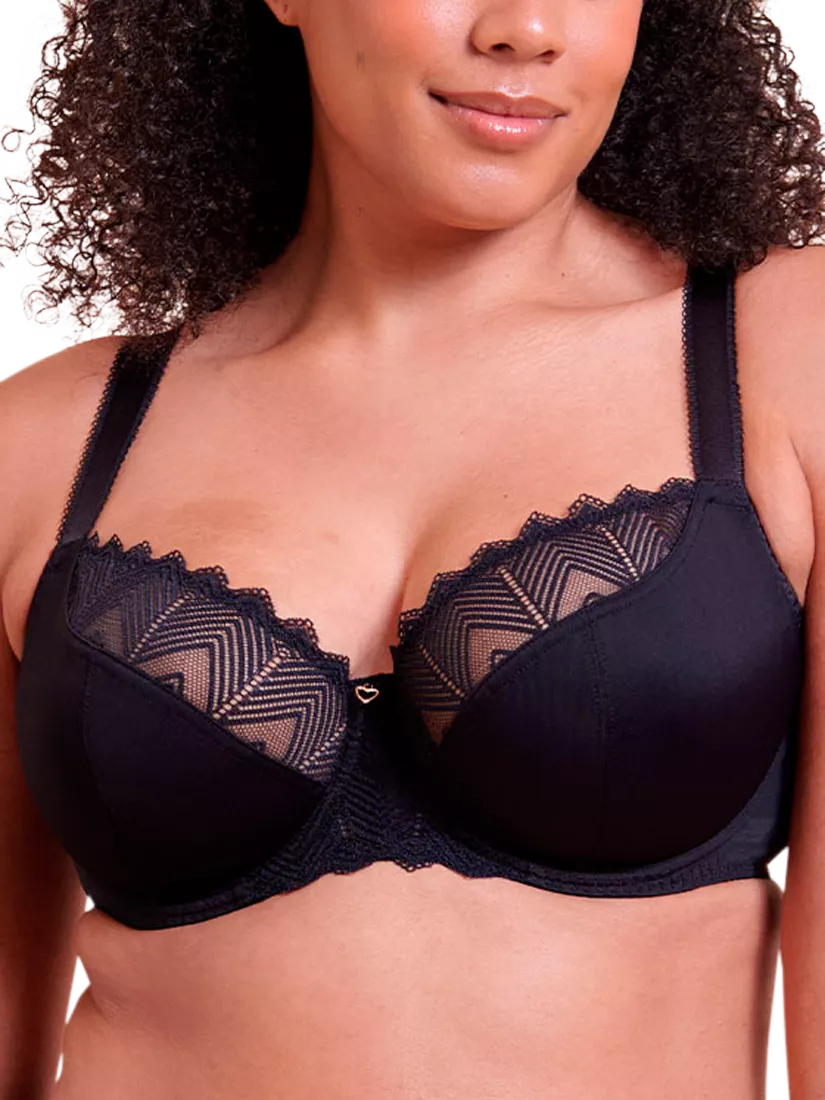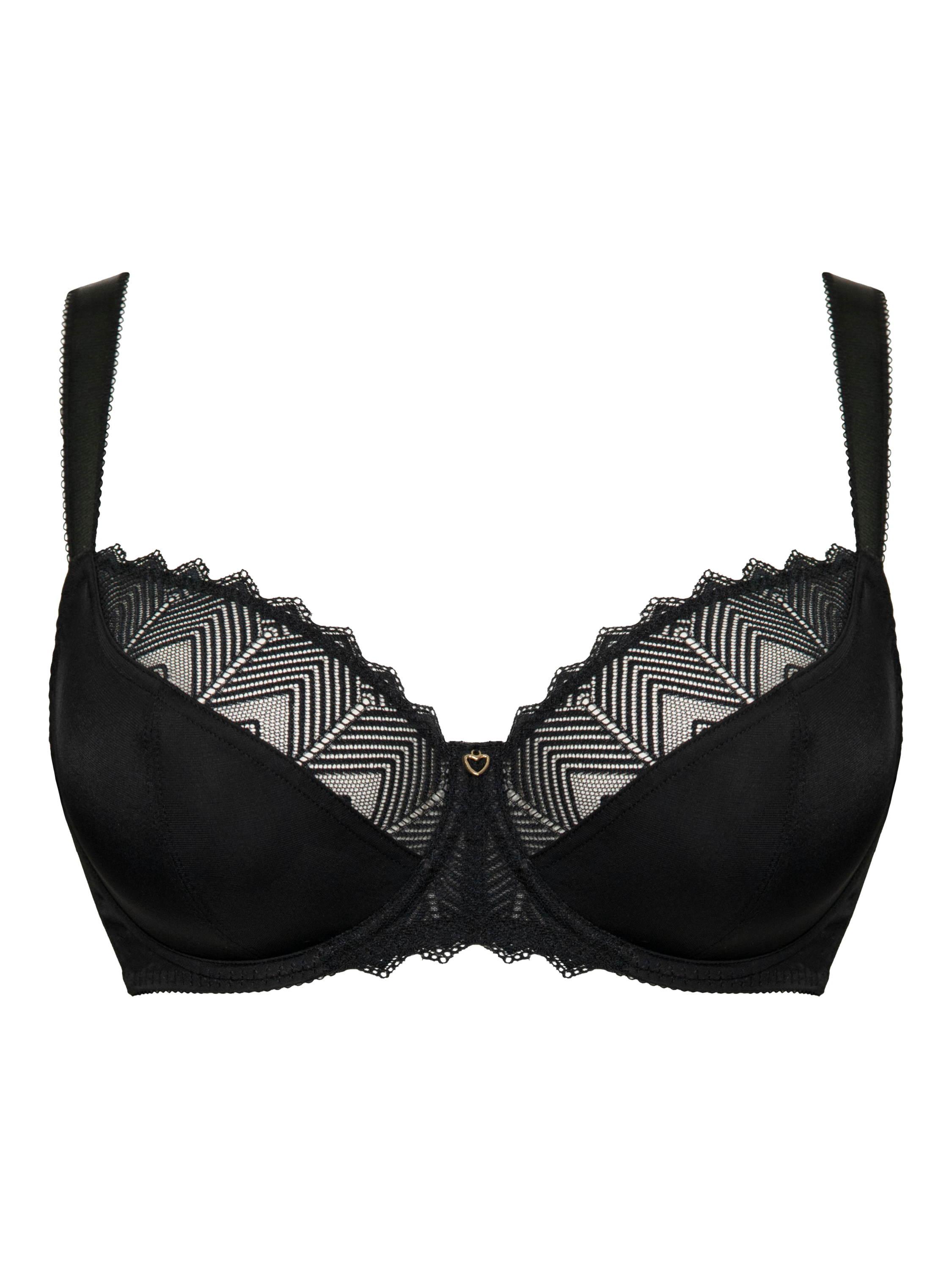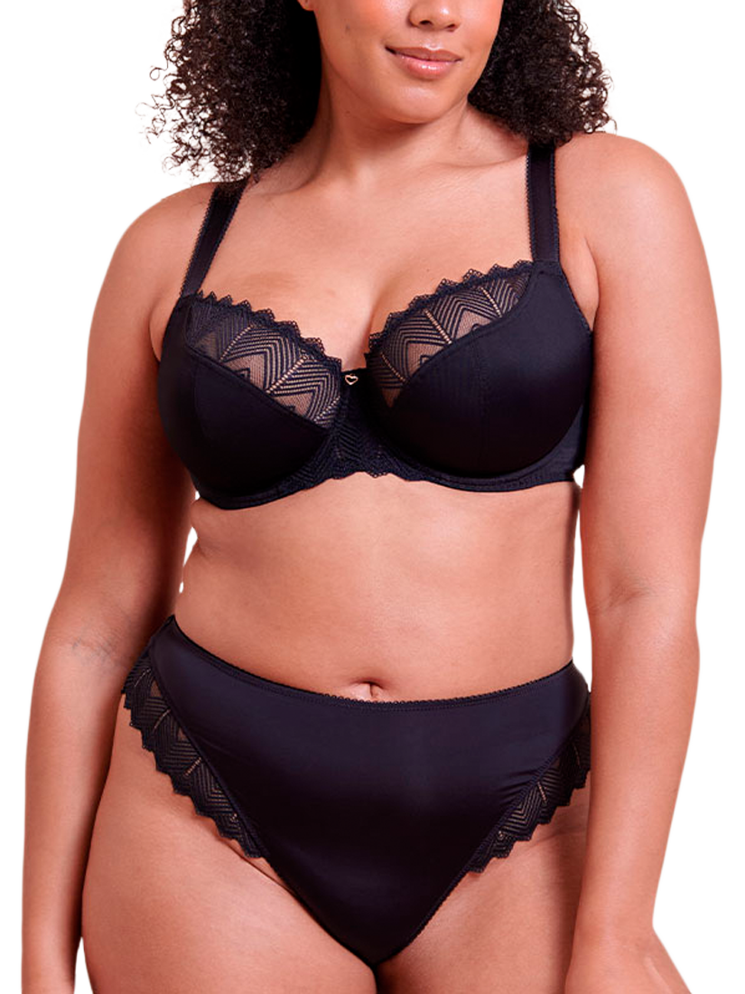 The Wild One Balcony Bra in Black offers a rounded, uplifted shape with underwired, non-padded cups and a stretch lace top cup that flexes to your unique shape. Designed to balance and support up to a K cup, this bra features striking geometric lace to contour your curves while offering all-day comfort and confidence.