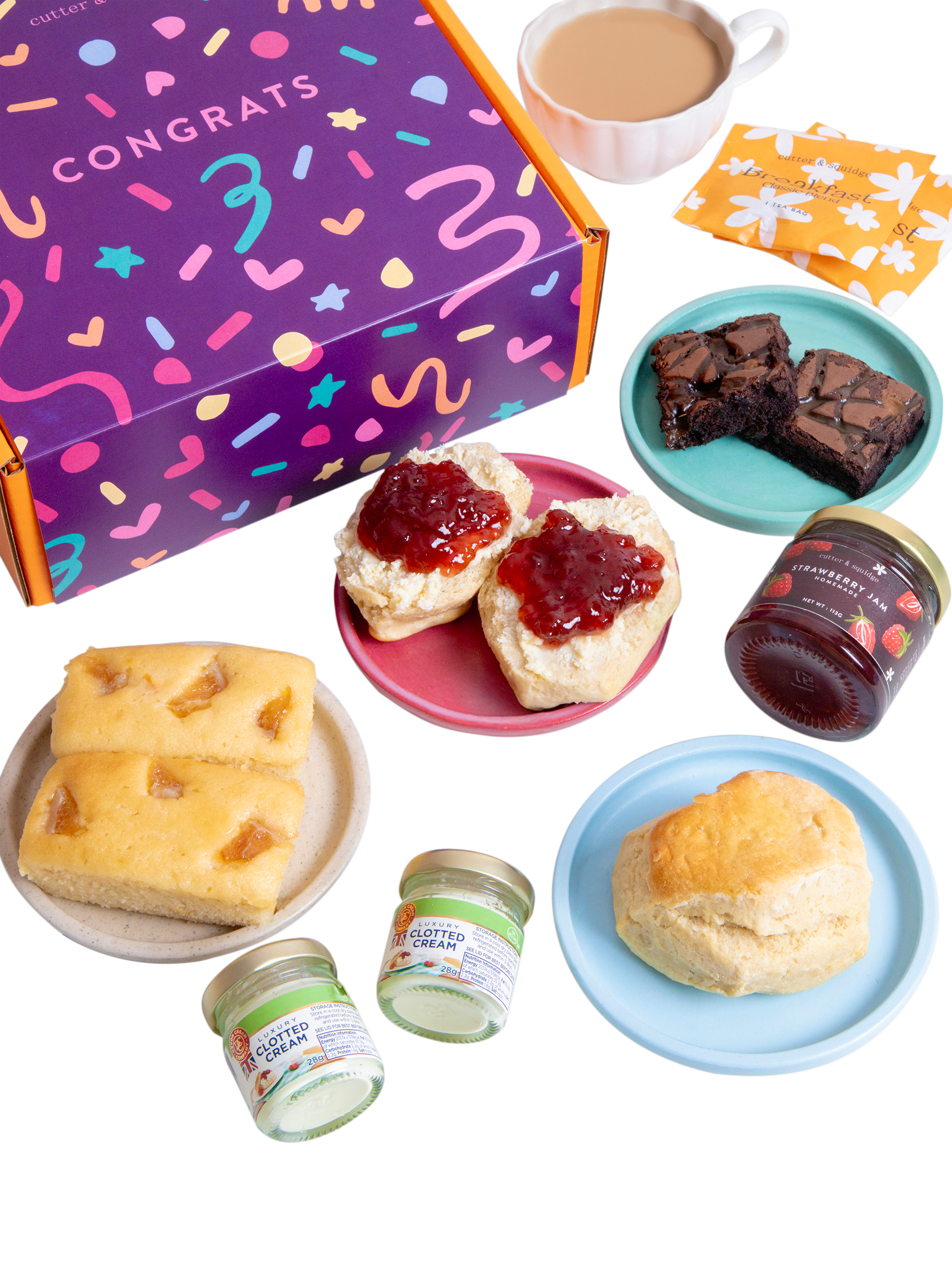 Treat yourself or a loved one to a truly scrumptious selection with a Cutter & Squidge Afternoon Tea. Unbox - signature handcrafted scones, sweet strawberry jam, clotted cream, zingy orange loaf cakes, rich salted caramel brownie bites and sachets of their breakfast blend tea. A beautifully British selection of sweet delights - ideal for gifting, hosting or a quiet afternoon indulgence. Serves 2-3.