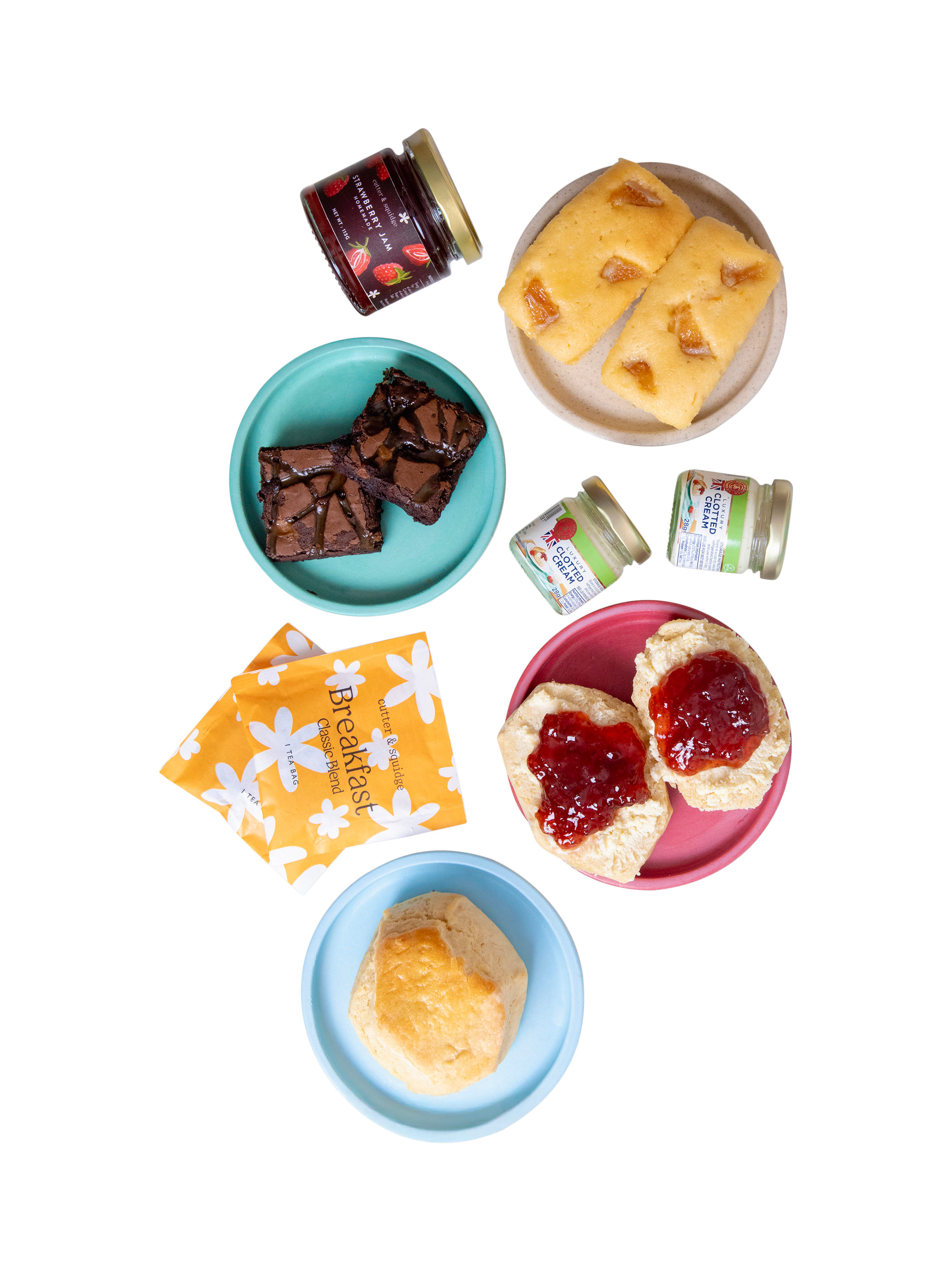 - Breakfast Tea: Blend of Assam, Ceylon and Darjeeling Black tea (Camellia sinensis) (100%). Clotted Cream: Pasteurised Cream (from Cow's MILK). Strawberry Jam: Sugar, Strawberries (48%), Gelling Agent: Fruit Pectin, Acidity Regulator: Citric Acid. Scone: Flour [WHEAT Flour (WHEAT Flour, Calcium Carbonate, Niacin, Iron, Thiamine)], Butter (MILK), Whole EGG [Free Range EGG-Pasteurised], Whole MILK (Pasteurised Cow's MILK), Sugar, Baking Powder [Raising Agents: Disodium diphosphate, Sodium hydrogen carbonate; Carrier: WHEAT flour], Vanilla Extract Mix [Water, Sugar, Glucose Syrup, Glycerine, Vanilla Pods: 100% vanilla beans], Salt: Fine Sea Salt. Orange loaf: yoghurt (natural yoghurt (MILK), live cultures, flour [WHEAT flour (WHEAT flour, calcium carbonate, niacin, iron, thiamine)], sugar, whole EGG [free range EGG-pasteurised], rapeseed oil, candied orange (3%) [orange round slices, glucose-fructose syrup, sugar, acidifier: citric acid], orange zest, baking powder [raising agents: disodium diphosphate, sodium hydrogen carbonate; carrier: WHEAT flour], vanilla extract mix [water, sugar, glucose syrup, glycerine, vanilla pods: 100% vanilla beans], orange oil. Salted Caramel Brownie: Base {Sugar, Whole EGG [Free Range EGG-Pasteurised], Dark Chocolate (sugar, cocoa mass, cocoa butter, emulsifier (SOYA lecithin),natural vanilla flavouring), Butter (MILK), Flour [WHEAT Flour (WHEAT Flour, Calcium Carbonate, Niacin, Iron, Thiamine)], Rapeseed Oil, Cocoa Powder (Alkalized Cocoa Powder (Cocoa, potassium Carbonate)), Salt: Fine Sea Salt, Whole MILK Powder (Whole MILK, Lactose)}, Salted Caramel Mix (6%) [Double Cream (Pasteurised Double Cream- MILK), Sugar, Glucose Syrup, Butter (MILK), Maldon Salt: Sea Salt Flakes], Caramel Fudge Pieces (2%) (White Granulated Sugar, Sweetened Condensed MILK (MILK, Sugar), Fondant (Sugar, Glucose Syrup, Water), Glucose Syrup, Palm Oil (sustainable palm oil), Butter Oil (MILK), Natural Flavouring). For allergens, see ingredients in capitals.