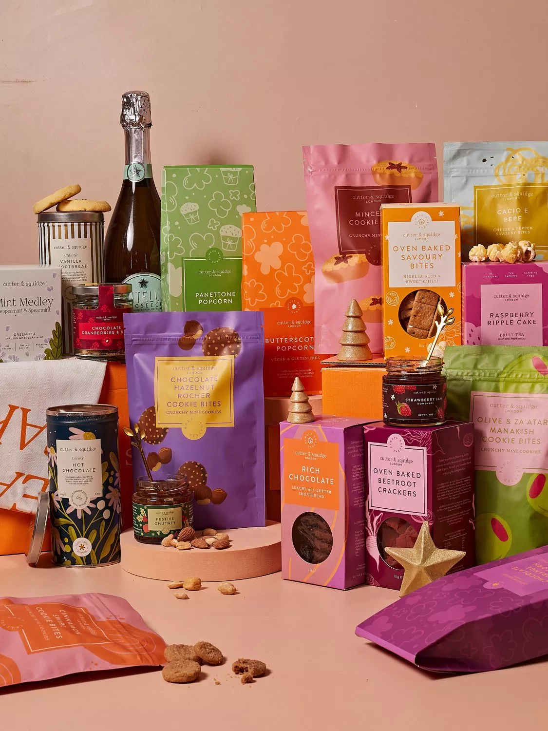 Indulge in Cutter & Squidge's most generous hamper yet — packed with festive sweet and savoury favourites. Enjoy a variety of cookie bites including chocolate rocher, mince pie, Cacio e Pepe and cinnamon swirl. Tuck into crackers, chutneys, strawberry jam and buttery shortbread, alongside rich chocolate shortbread and panettone popcorn. Two premium teas and a luxury hot chocolate tin make it extra cosy, and a bottle of Vitelli Prosecco adds sparkle. Finished with the brand's signature tea towel for a final touch.