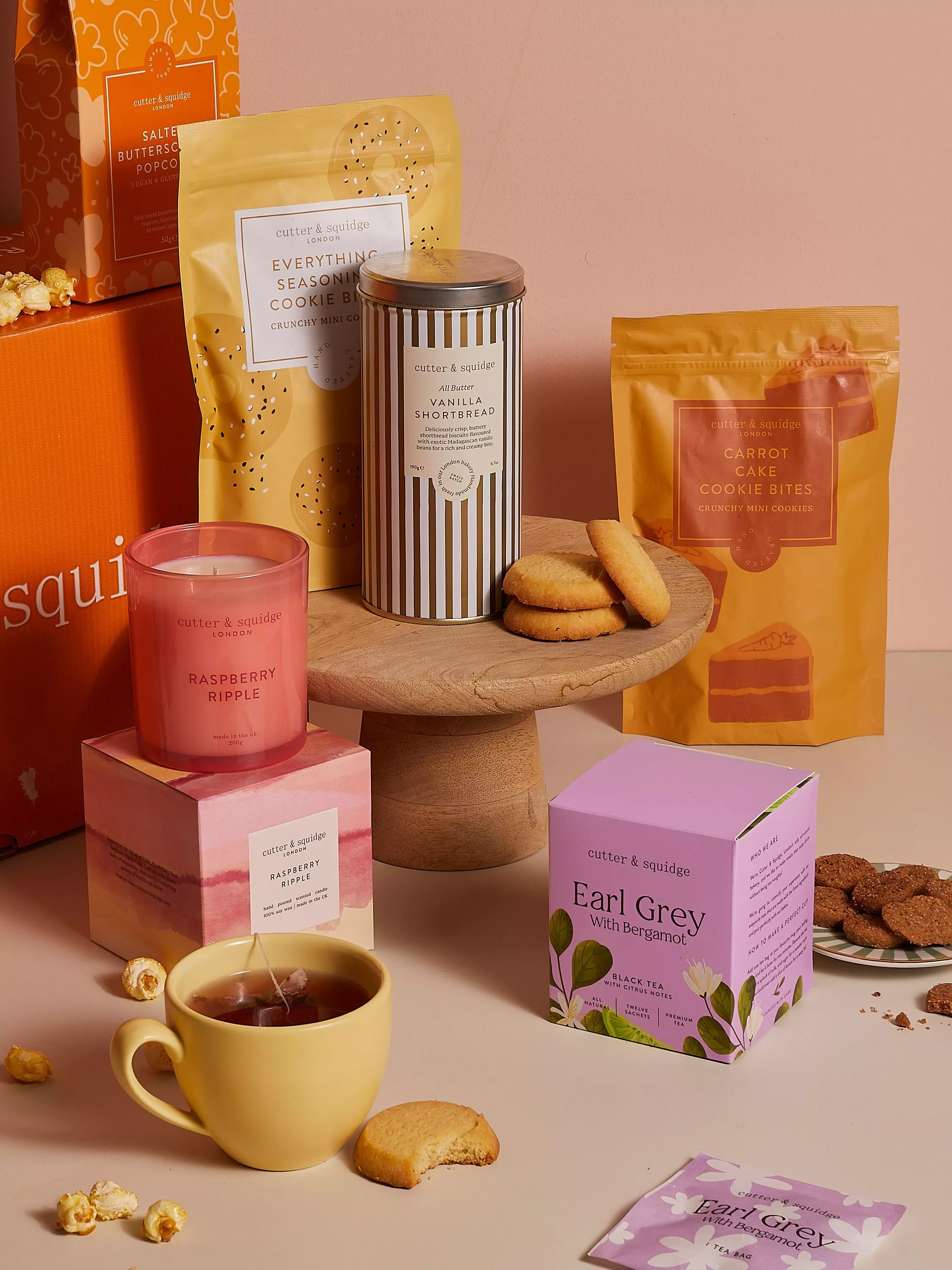 A little luxury for a cosy afternoon. Light the Raspberry Ripple candle, then enjoy delicately spiced carrot cake cookie bites and buttery vanilla shortbread. Everything Seasoning cookie bites bring a savoury edge, balanced with sweet butterscotch vegan popcorn. Brew a cup of Earl Grey with bergamot and unwind with a treat that feels extra special.