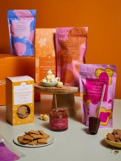 A delicious selection of indulgent vegan treats. Enjoy savoury Nigella Seed Crackers, paired with a jar of gently spiced Tomato Chutney. A trio of vegan-friendly cookie bites features Sweet and Jammy Jam on Toast, warmly spiced Cinnamon Swirl and chocolatey, flaky Pain au Chocolat. Buttery, caramel-like Butterscotch Popcorn and a chocolatey, fruity and creamy Chocolate Orange Hot Chocolate Spoon complete this indulgent hamper.