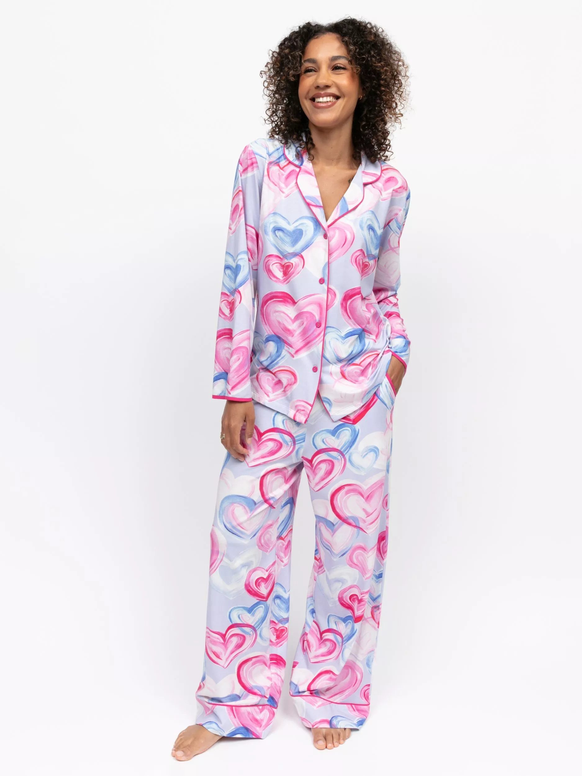 The perfect pyjama set to make staying in feel like a celebration. The Chloe Heart Printed Pyjama Set is built for any kind of downtime. Cut from a super-soft blend of 52% cotton, 41% modal and 7% elastane, this pyjama set is as kind on the body as downtime is on your soul. The long sleeve shirt is finished with piping, neat buttons, and a revere collar, while the wide-leg bottoms bring a relaxed silhouette, side pockets, and a drawstring waist that lets you get comfy your way.