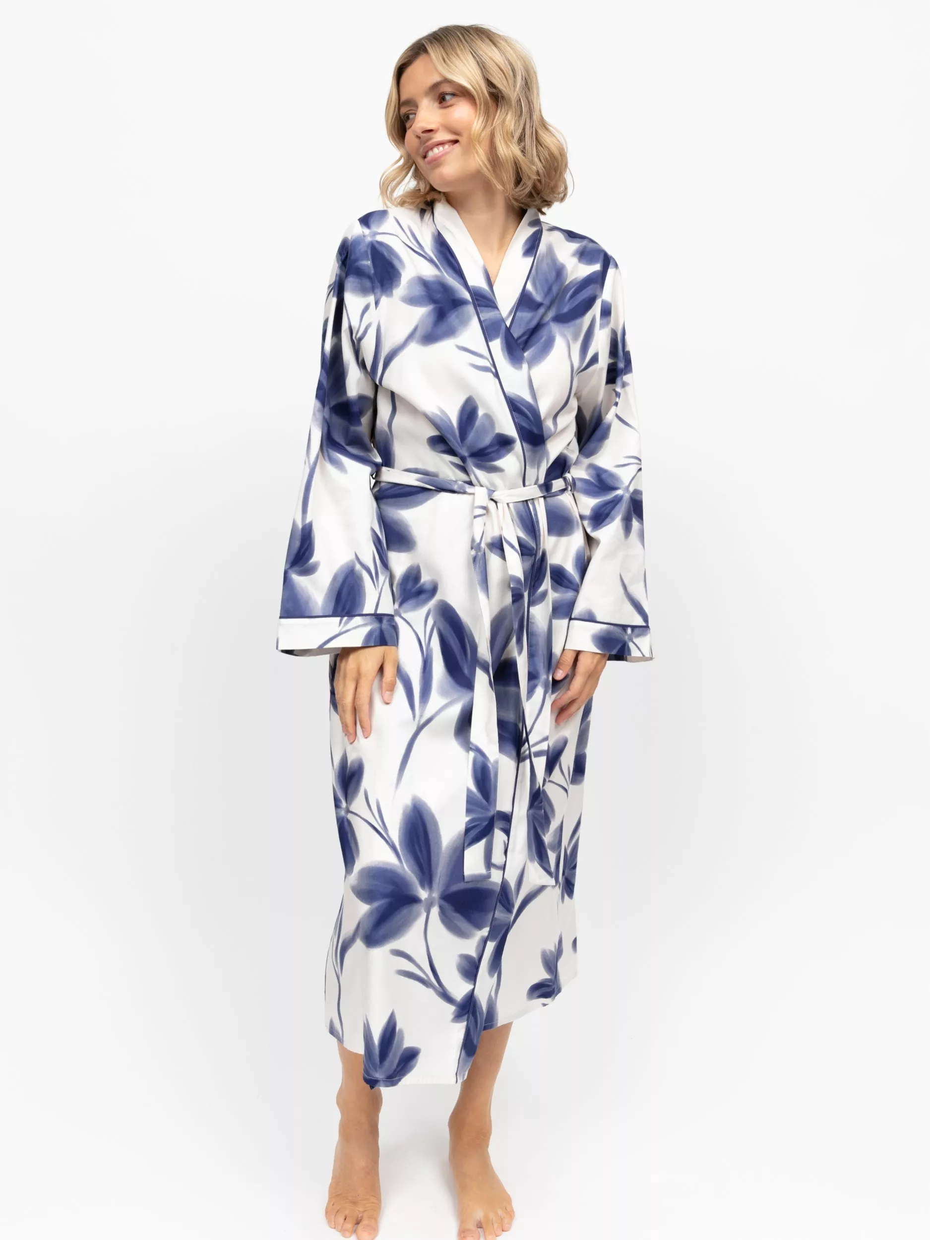 Crafted from A super-soft 60% cotton and 40% modal blend, this long-sleeve gown feels weightless yet comforting against the skin. Painted with petals and finished with modal piping, it carries a floral energy to let your evenings blossom at their own pace. Long cuffed sleeves and a kimono-style wrap front give it presence without restricting movement, while a self-fabric belt lets you define your shape.