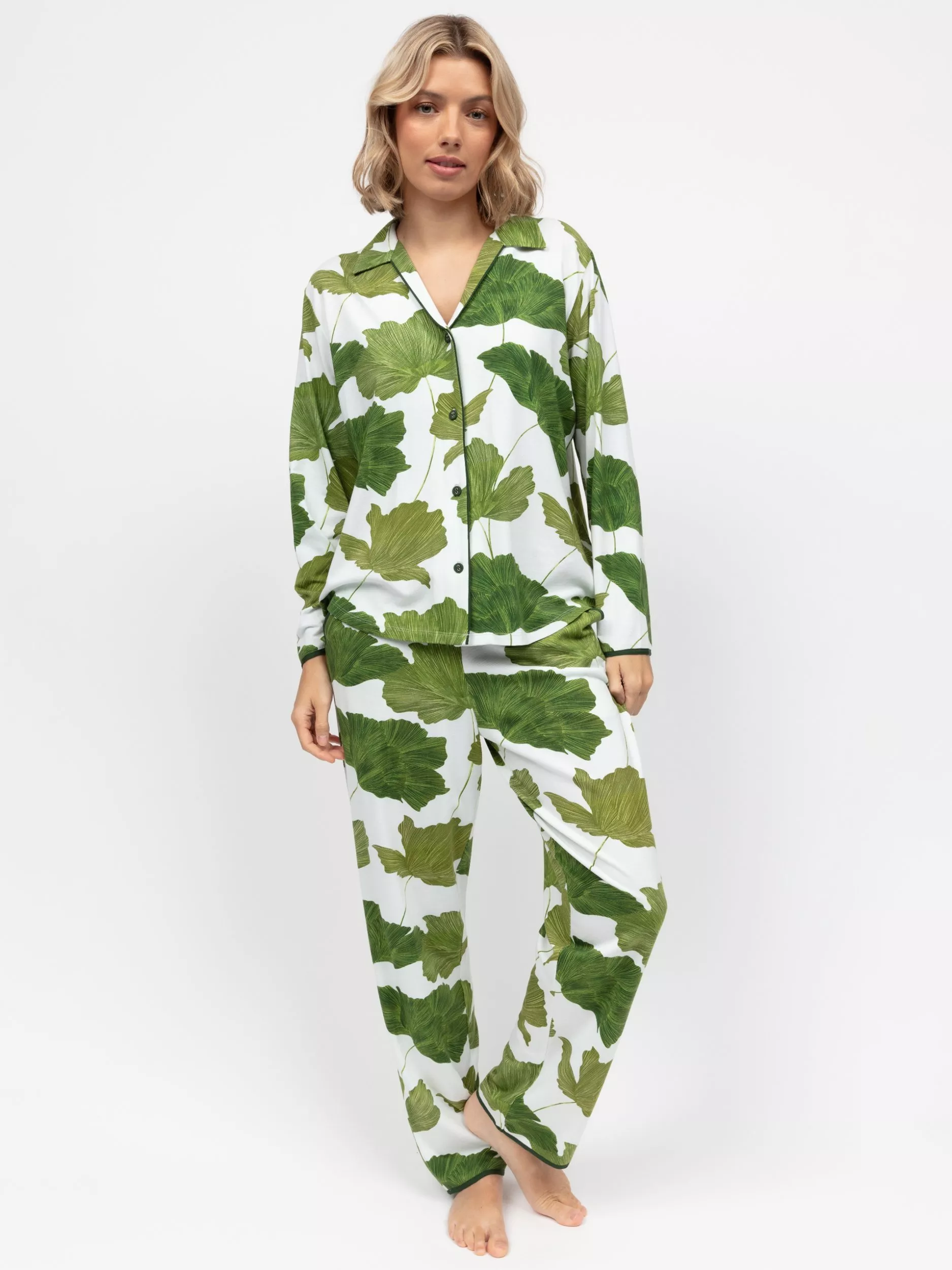 Relax in style with the super-soft cotton-modal-elastane pyjama set, featuring a leafy print and modal trim. The top has a one-piece pointed collar, long sleeves, modal-covered buttons, and a shaped bottom hem. The bottoms offer a flat front, elasticated back waist, adjustable drawstring, and two side pockets, finished with a straight bottom hem for a sleek, comfortable fit.