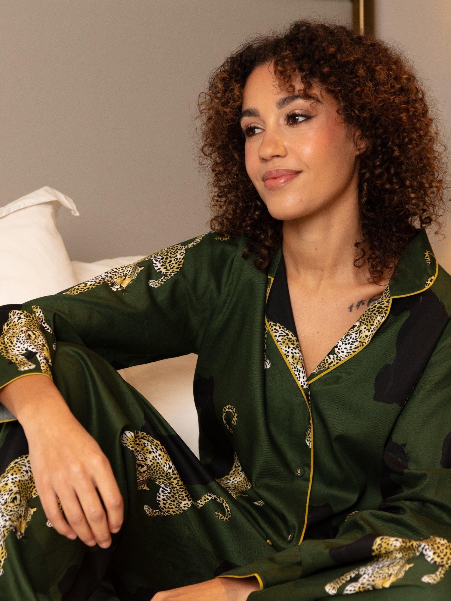 Indulge in comfort and style with this super-soft cotton-modal pyjama set, featuring a bold leopard print and modal trim. The top has a revere collar, long sleeves, modal-covered buttons with stitching, and a shaped bottom hem. The wide-leg bottoms offer a flat front, elasticated back waist, adjustable drawstring, and two side pockets, finished with cuffed hems for a chic, relaxed fit.