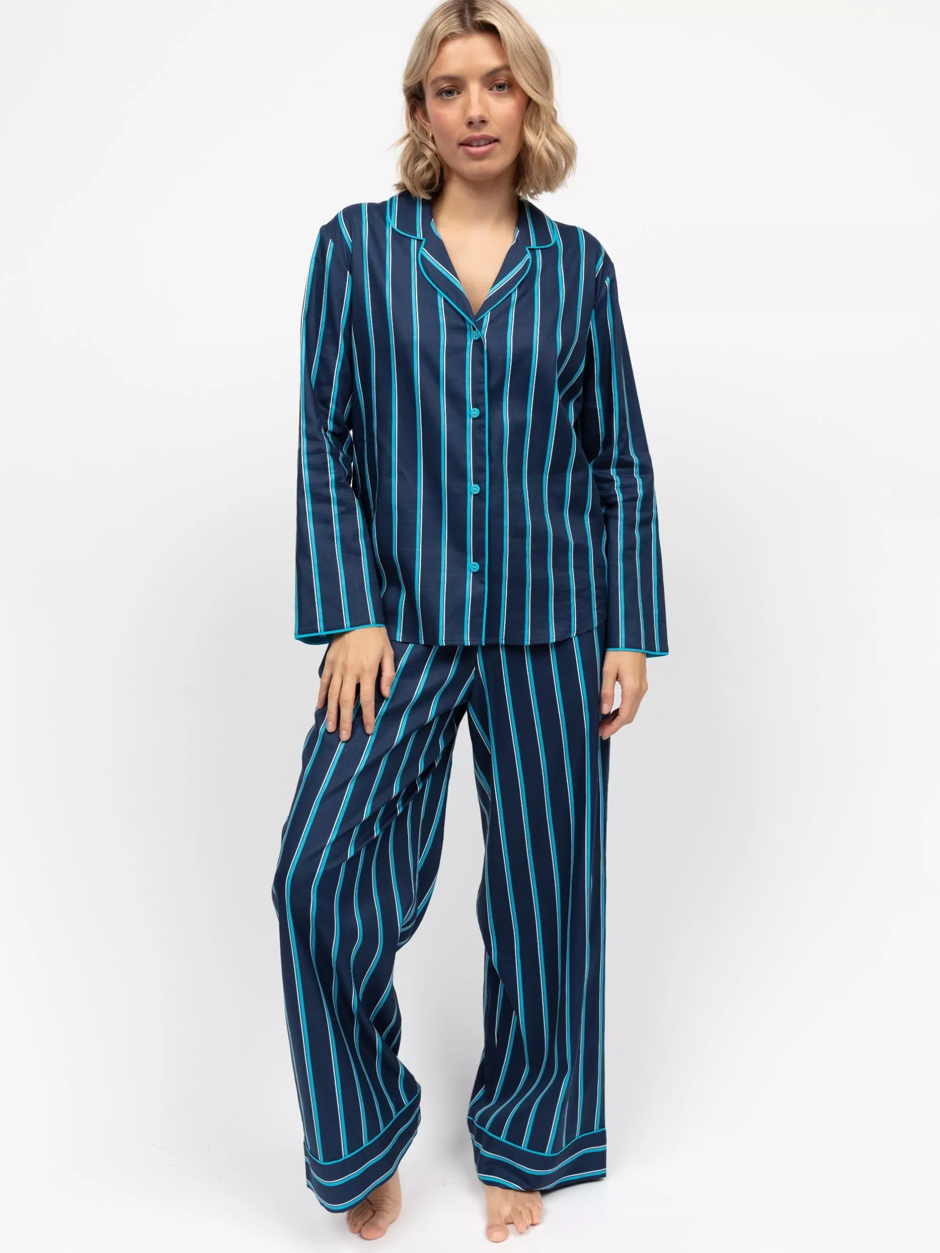 Unwind in style with this super-soft cotton-modal pyjama set, featuring a chic striped print and trim. The top is designed with a revere collar, long sleeves, modal-covered buttons, and a shaped bottom hem. The wide-leg bottoms offer a flat front, elasticated back waist, adjustable drawstring, and two side pockets, finished with cuffed hems for a relaxed yet polished look.