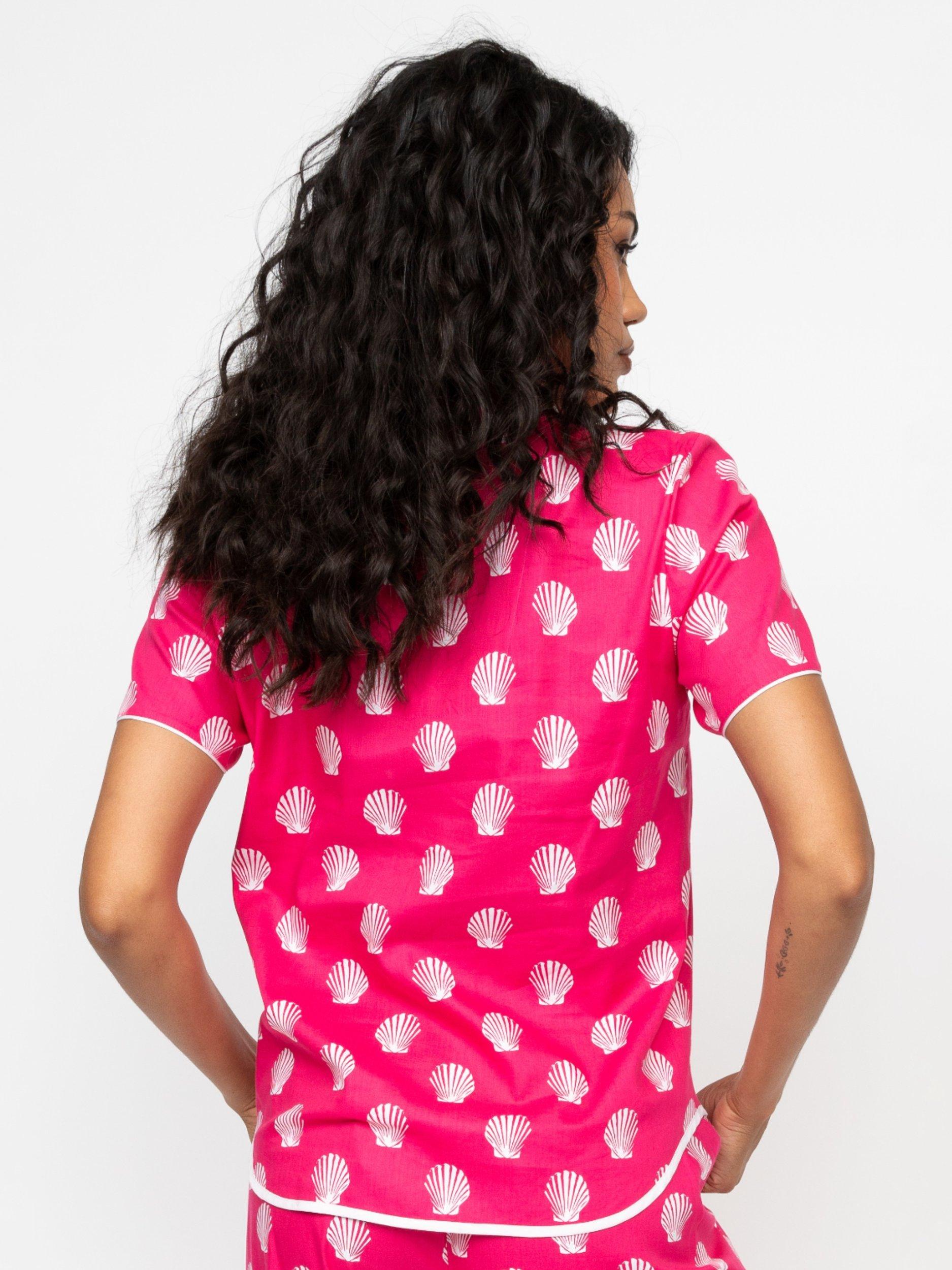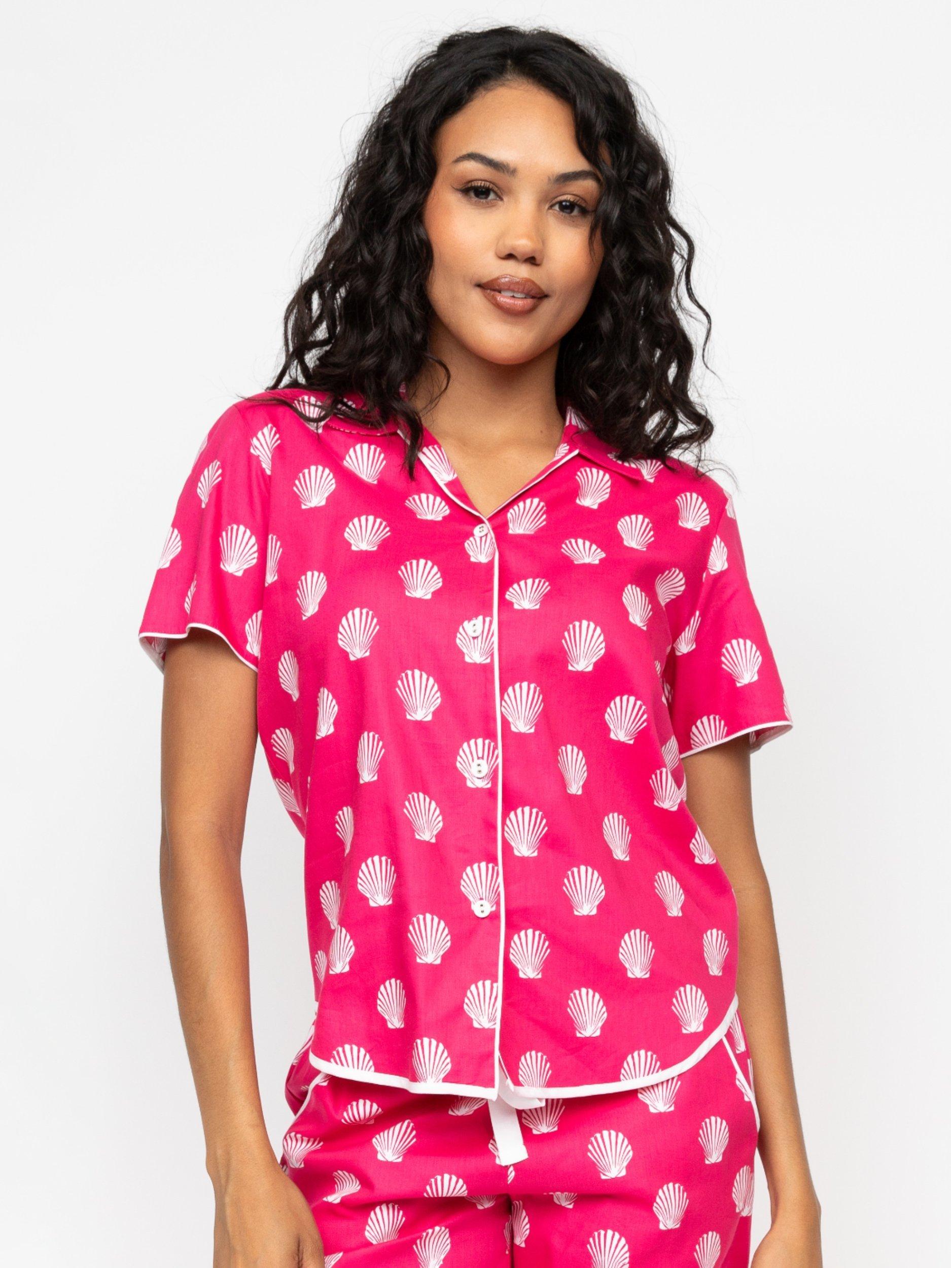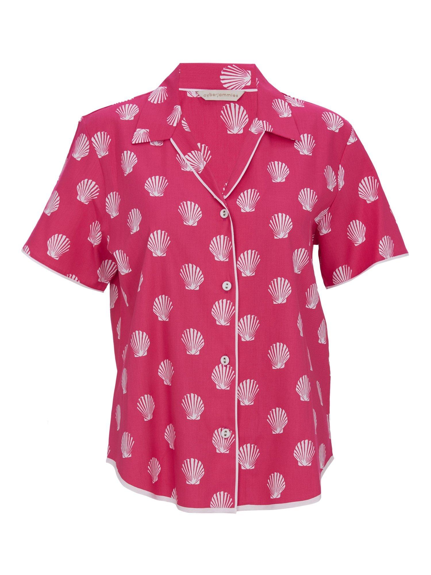 Take yourself on a sunny summer holiday each and every time you unwind with the comfy stylings of the Sofia Shell Print Short Sleeve Pyjama Top. This short-sleeved pyjama top rocks a simple pattern of shells against a bright background for a stylish boost to your evening wear.