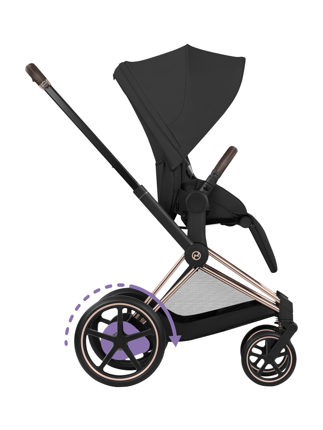 This bundle includes the Foldable Cot, which folds in half while still attached to the frame, transforming the e-PRIAM into a space-saving companion that fits neatly into car boots, without sacrificing newborn comfort.