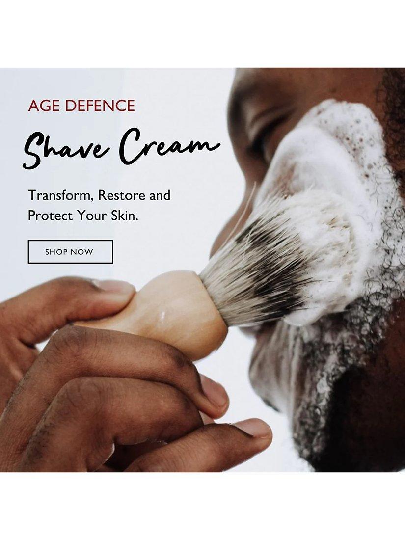 Our rich Age Defence Shave Cream provides a smooth glide and luxurious lather to soften the skin.