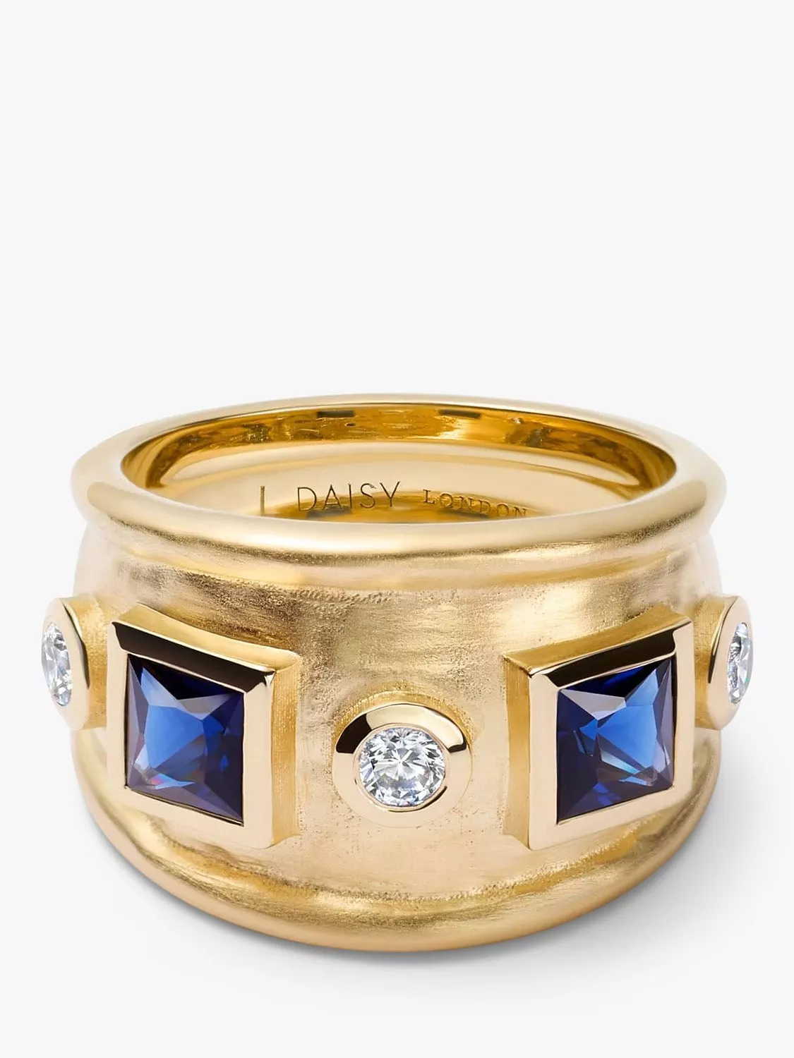 A real treasure brought to life. This 18ct gold plated brass ring features blue and white gemstones on a brushed think band. The only statement ring you'll need for this season.