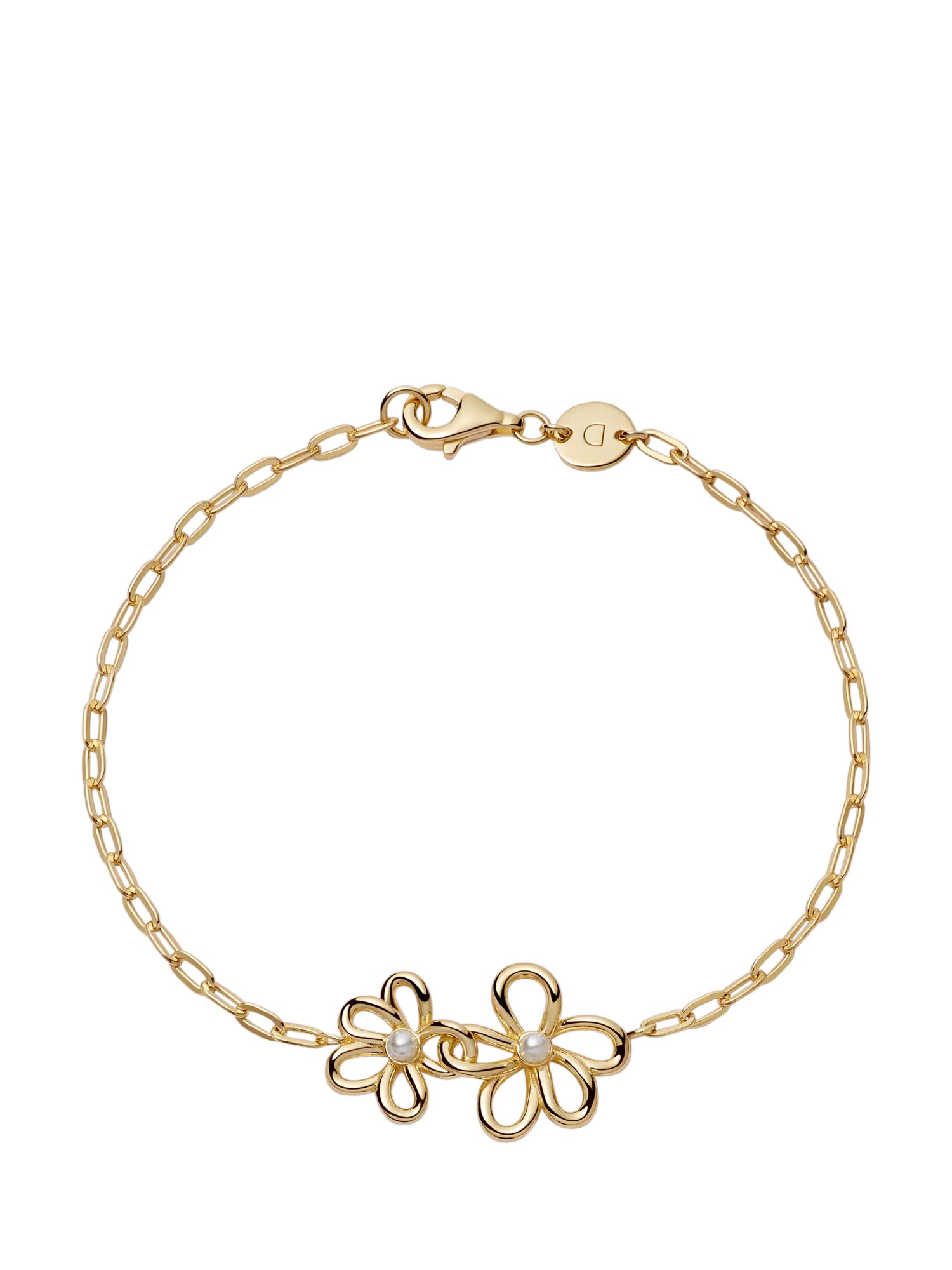 Featuring two linked daisy-inspired bows, each with a freshwater pearl in the centre and hung on a link chain, this 100% recycled sterling silver bracelet looks great solo or layered up with your favourite chains.