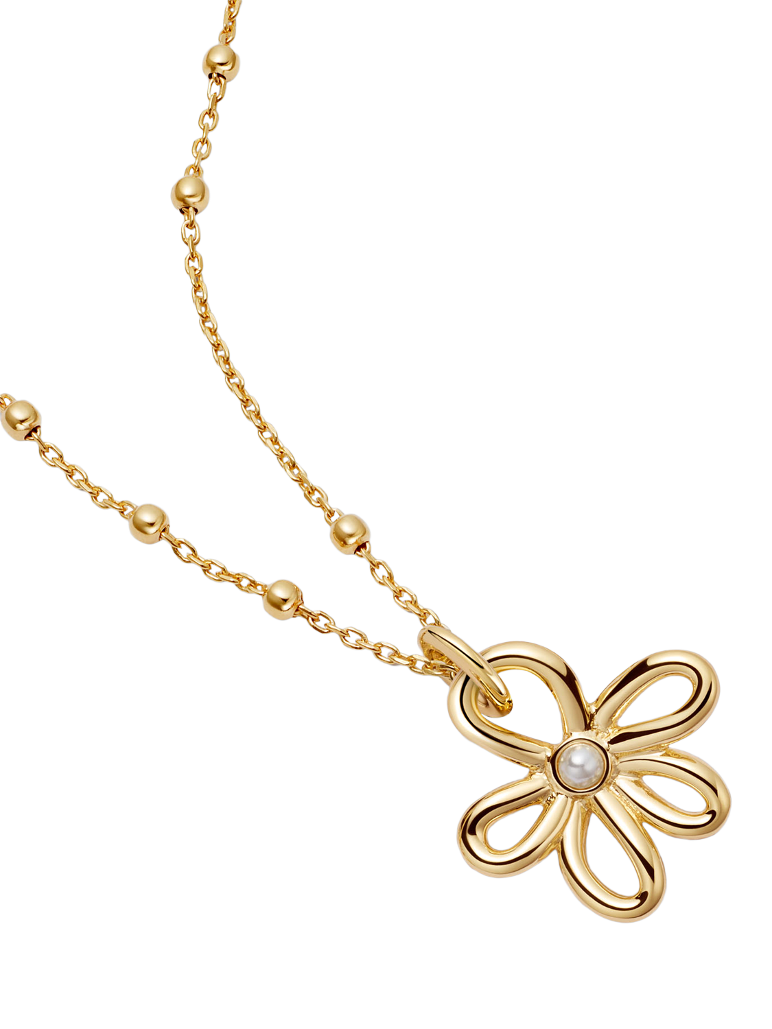 Featuring a daisy inspired bow pendant with a freshwater pearl at the centre and hung on a classic bobble chain, style it with chunky layering chains for an impactful look.