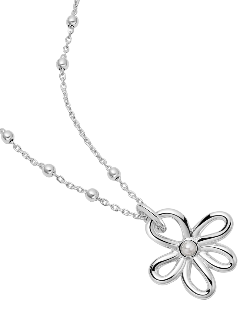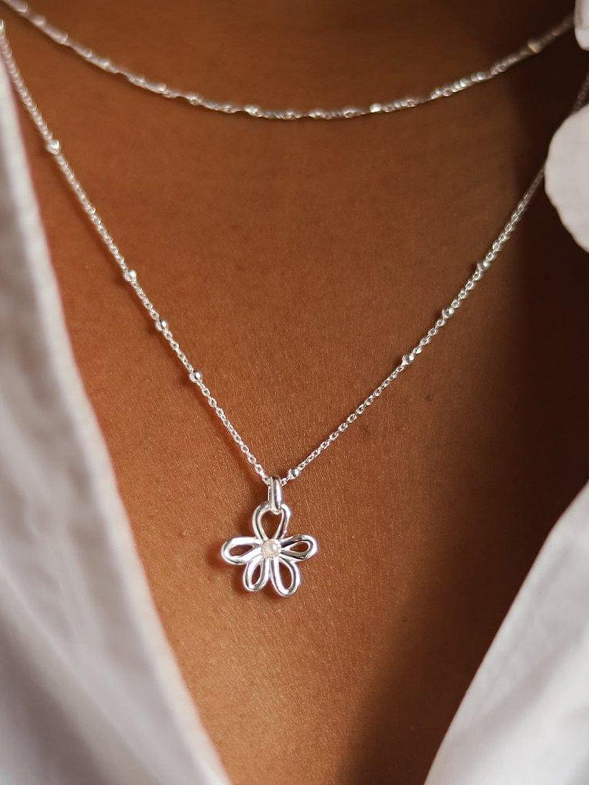 Featuring a daisy inspired bow pendant with a freshwater pearl at the centre and hung on a classic bobble chain, style it with chunky layering chains for an impactful look.