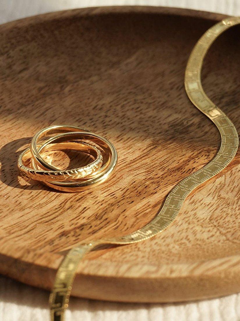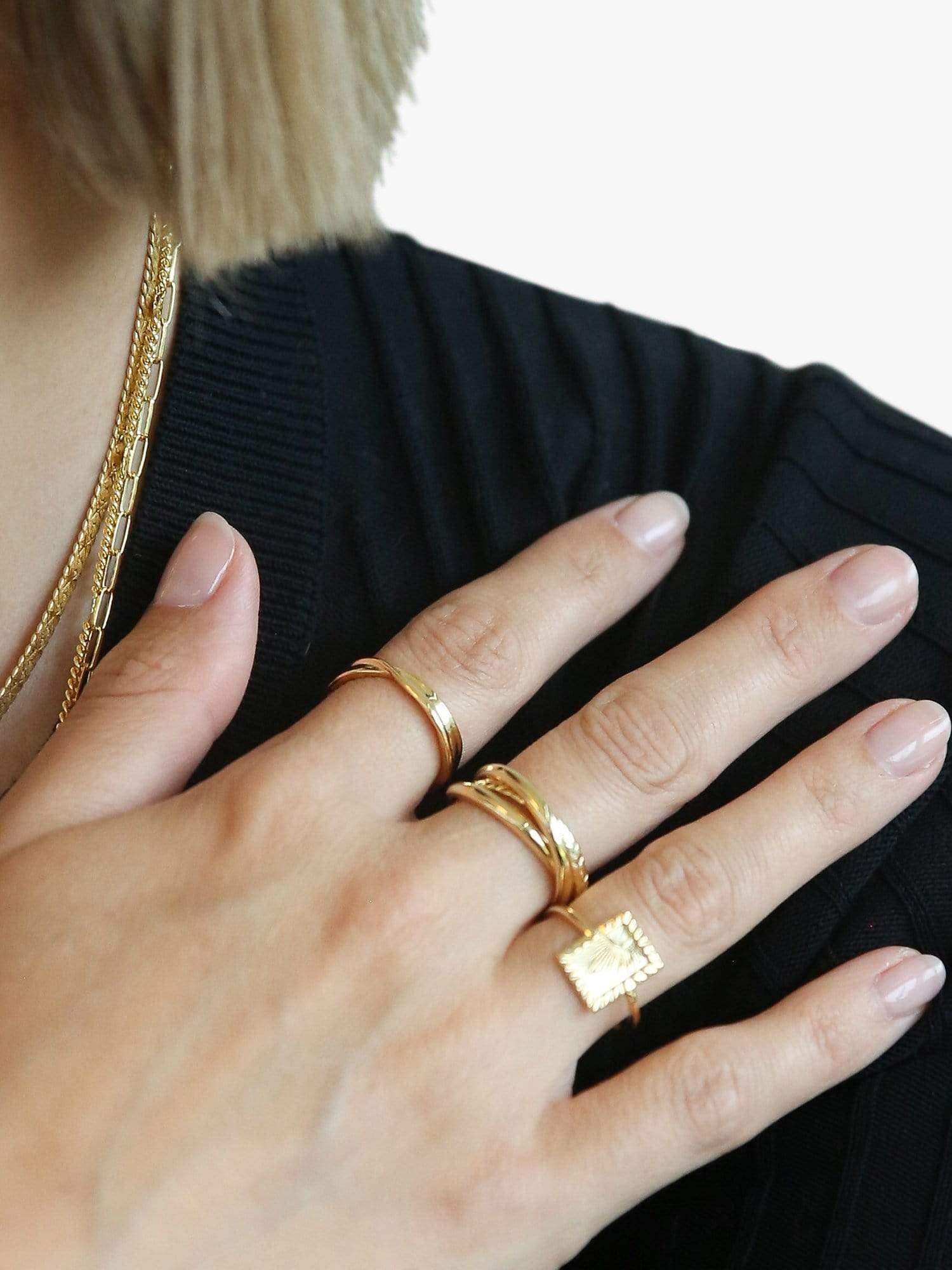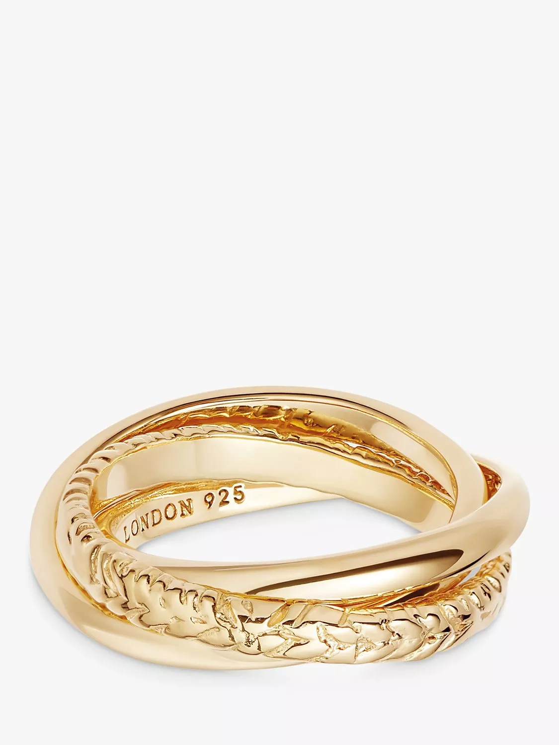 The ring you didn't know you needed until now. Daisy London's contemporary take on a classic, the Estée Lalonde Trinity ring is handcrafted in 18ct gold plated sterling silver and features three entwined rings to truly make a statement each time you wear it. jewellery size P Band Width: 5mm