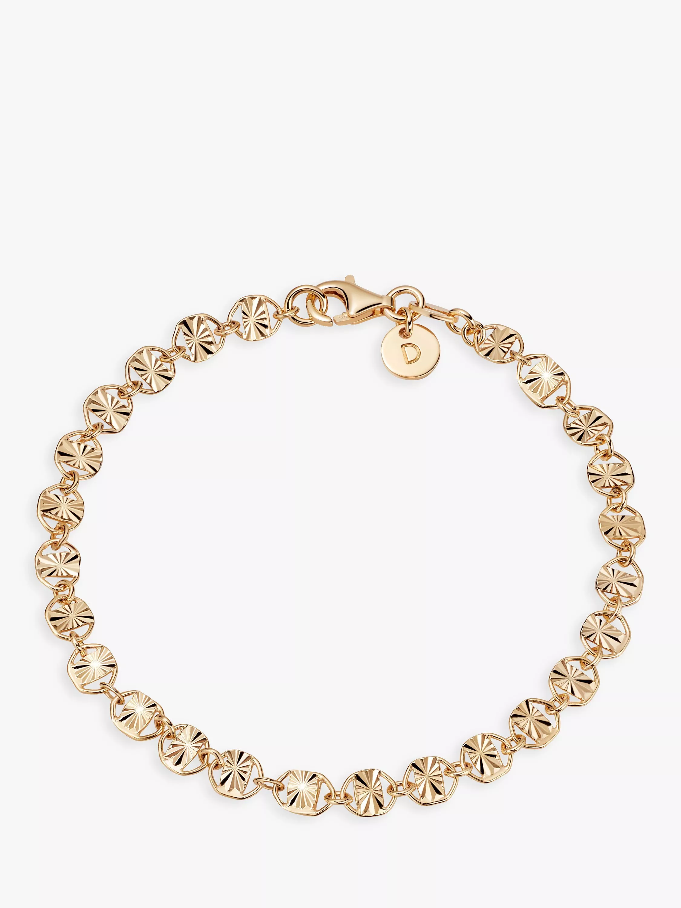 Inspired by the sun, each link of this chain bracelet has a unique sunray design. The delicate style looks great on its own but can also be used as part of a layered look with other styles.