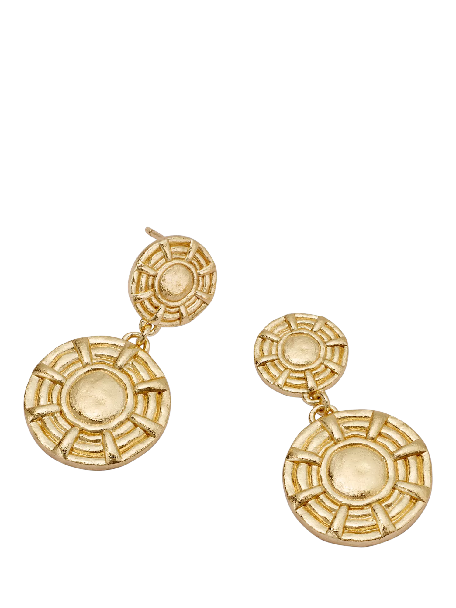 A fusion of warmth, protection, and vintage charm, these earrings from Daisy London instantly lift any look. Featuring textured discs with intricate solar detailing, they catch the light from every angle. Sitting on post fittings, they are suitable for pierced ears only.
