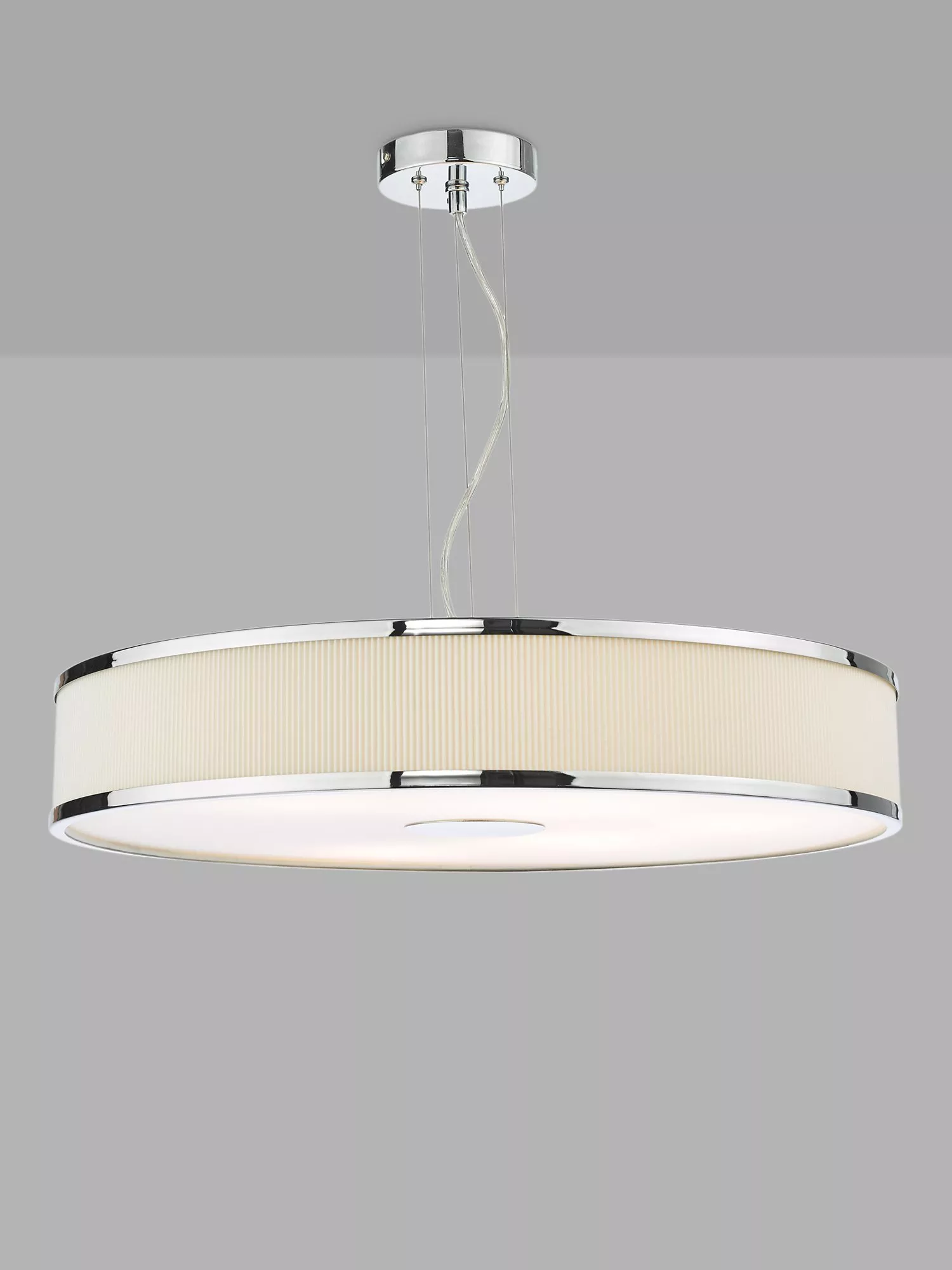Sleek, slender and carefully designed to reduce glare, this ceiling light has a frosted diffuser at the top and bottom of the shade. Not only does it soften the glow and radiate a warm and even wash of light, it also keeps dust out and makes this a great choice for hanging low over a table or high in a bedroom. The lampshade is made from tightly pleated cotton in a selection of colours and it's accented with metal detail in an antique or polished finish. Plus, it's suspended from a height-adjustable cable, requires six LED bulbs and it's also available in a smaller size.