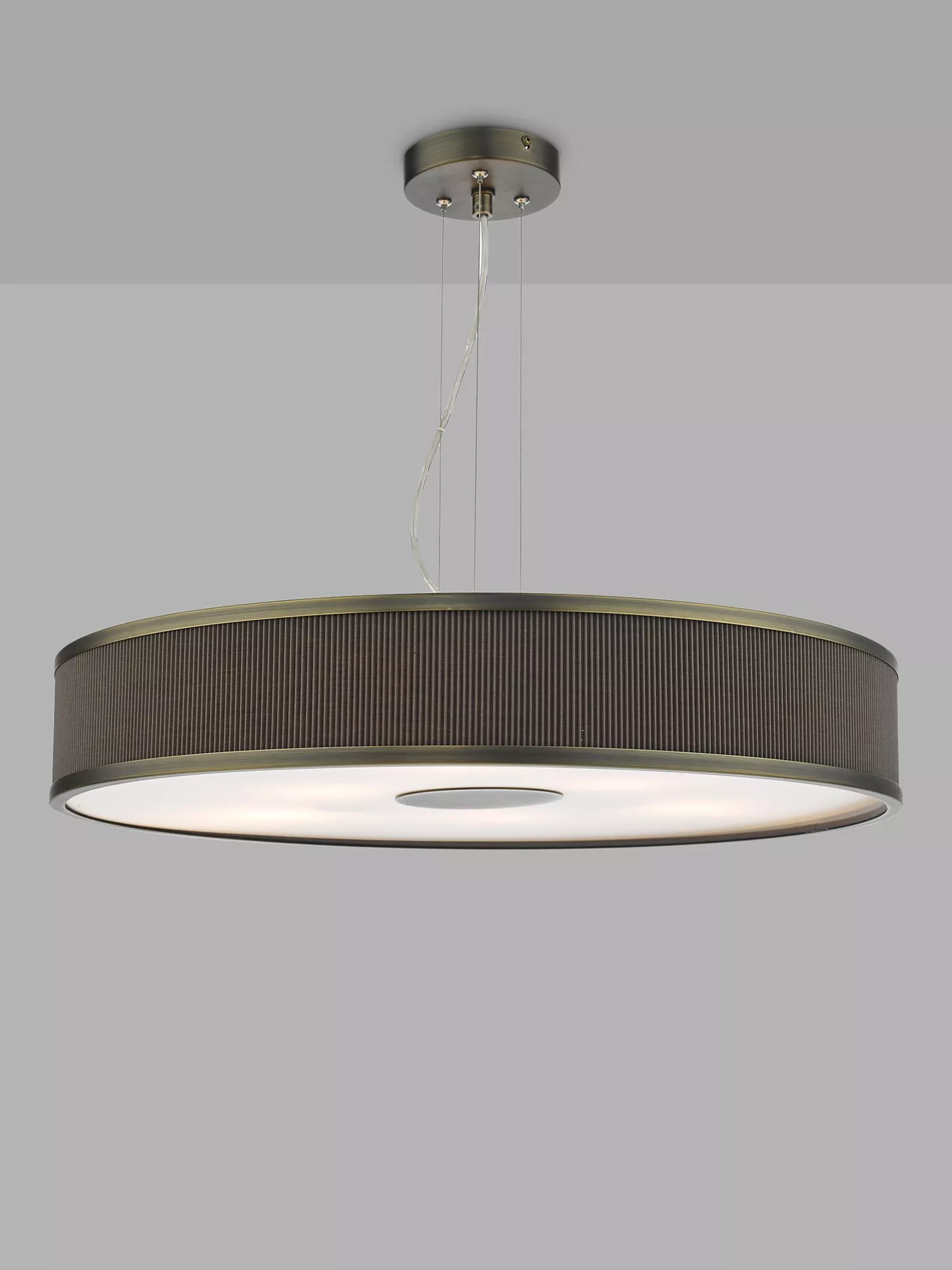 Sleek, slender and carefully designed to reduce glare, this ceiling light has a frosted diffuser at the top and bottom of the shade. Not only does it soften the glow and radiate a warm and even wash of light, it also keeps dust out and makes this a great choice for hanging low over a table or high in a bedroom. The lampshade is made from tightly pleated cotton in a selection of colours and it's accented with metal detail in an antique or polished finish. Plus, it's suspended from a height-adjustable cable, requires six LED bulbs and it's also available in a smaller size.