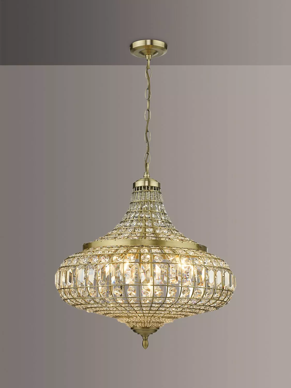 Taking inspiration from the shapes of ancient Moroccan lanterns, this ornate ceiling light is formed from faceted crystals on an antique brass-finished metal background. The chain cable is height adjustable at the point of installation.