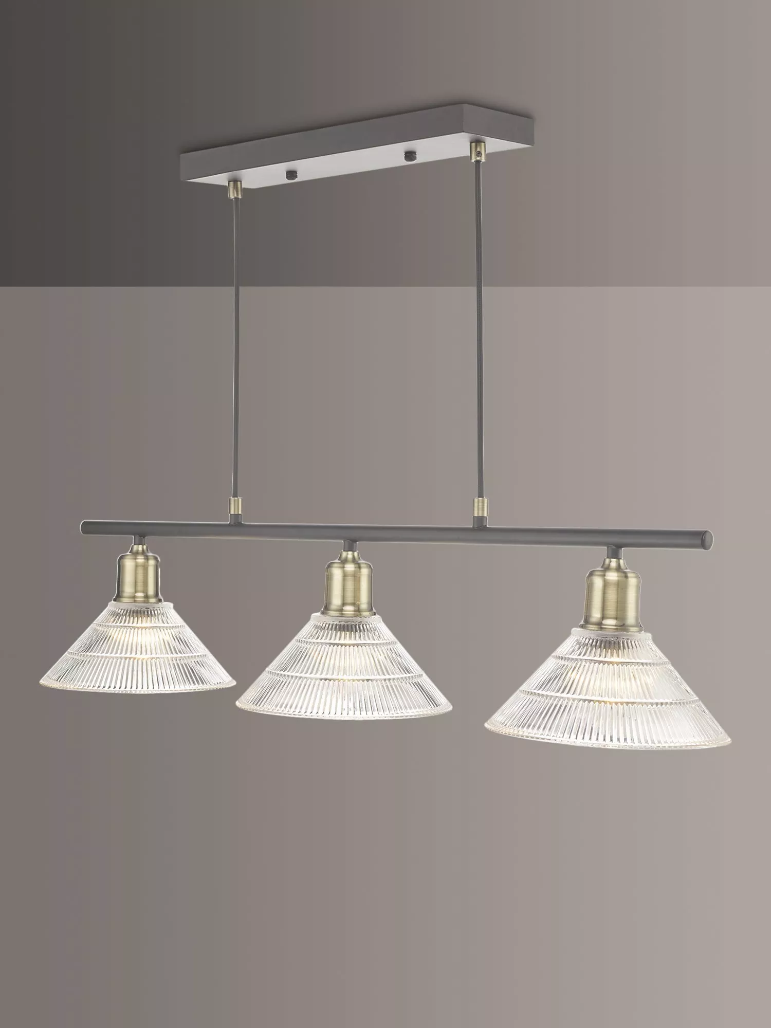 With a subtle, industrial look, this ceiling bar features three prismatic glass shades which are accented with brass-finished detail. It offers a functional spread of direct light and will look impressive when installed directly above dining tables or kitchen bars. The cable is height adjustable upon installation and it's also suitable for sloped ceilings.