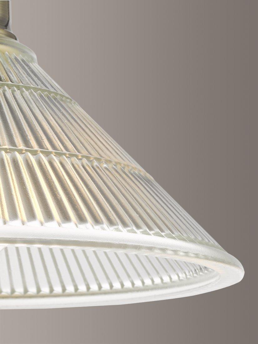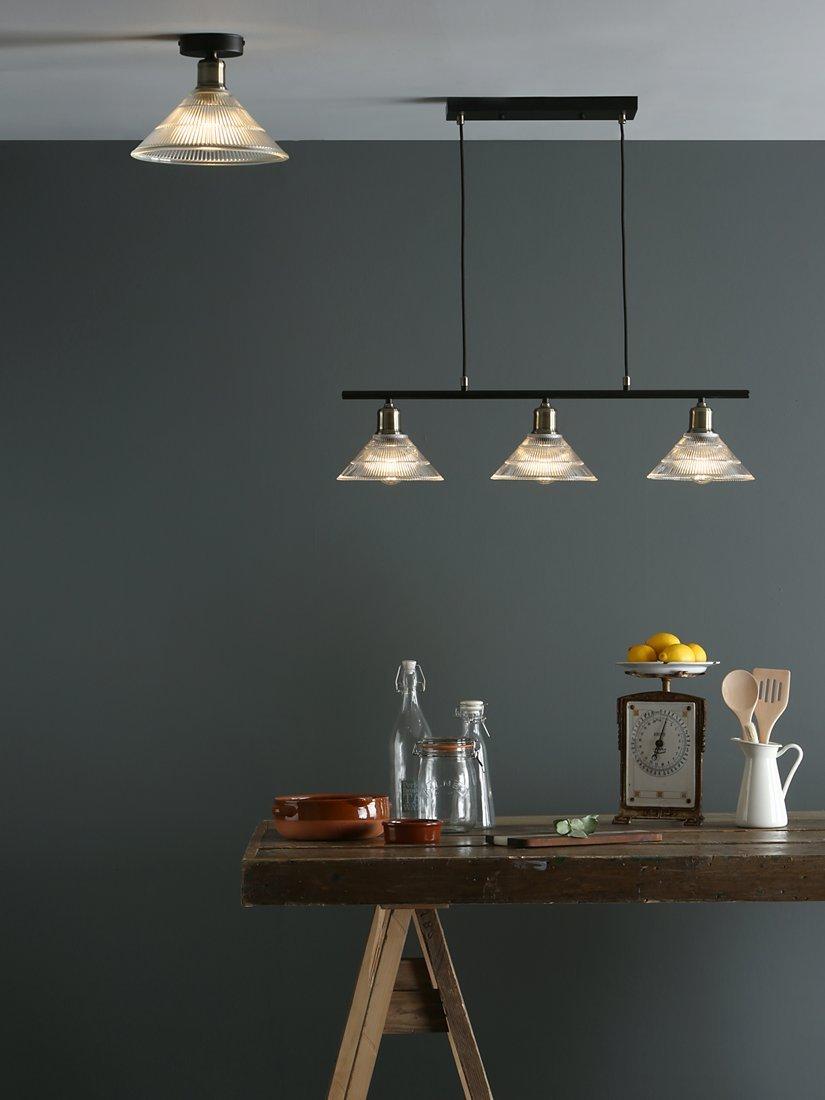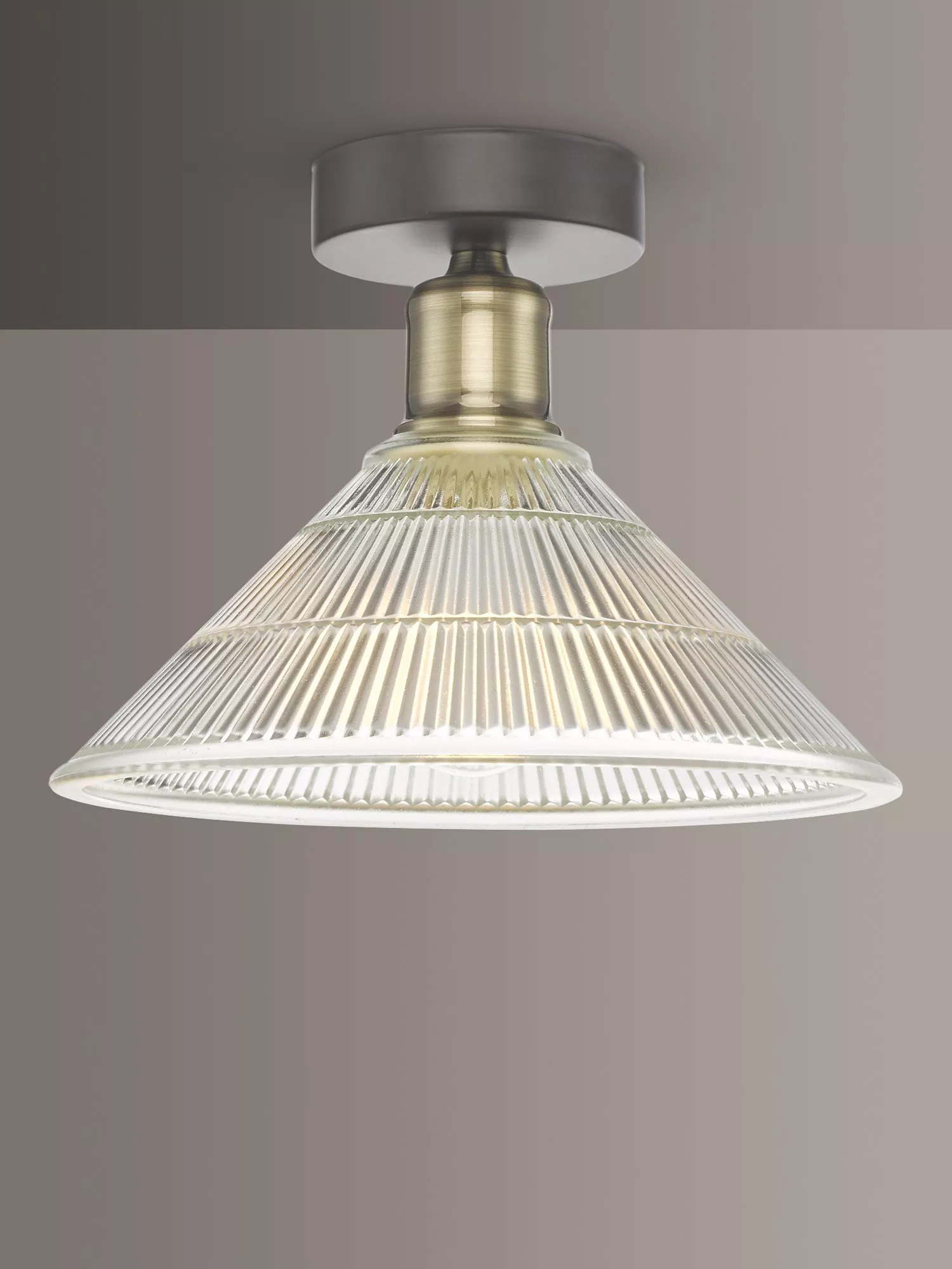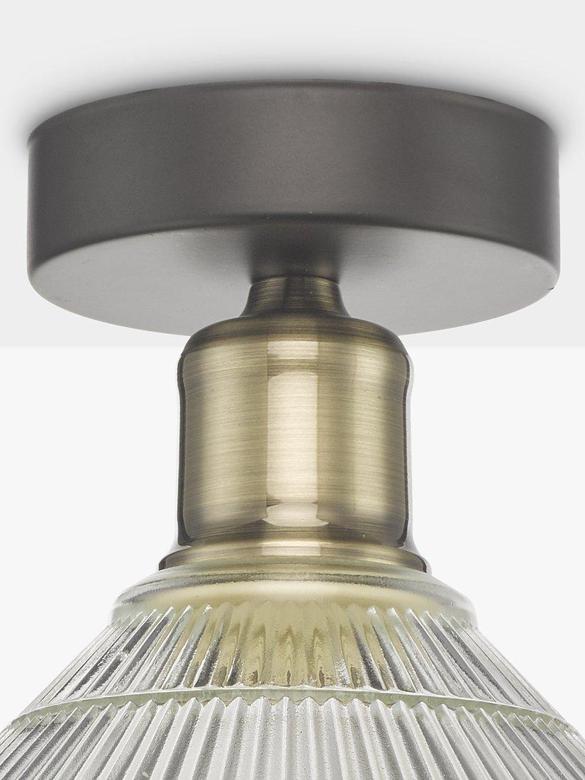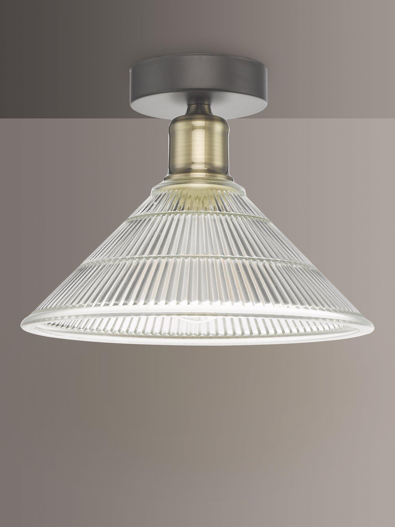 With a subtle, industrial look, this ceiling light is made with a prismatic glass shade and brass-finished detail. Smaller in size, it's ideal for rooms with low ceilings thanks to its semi-flush design and it offers a warm glow of light. Install one independently for a functional style or install in multiples for a more statement look.