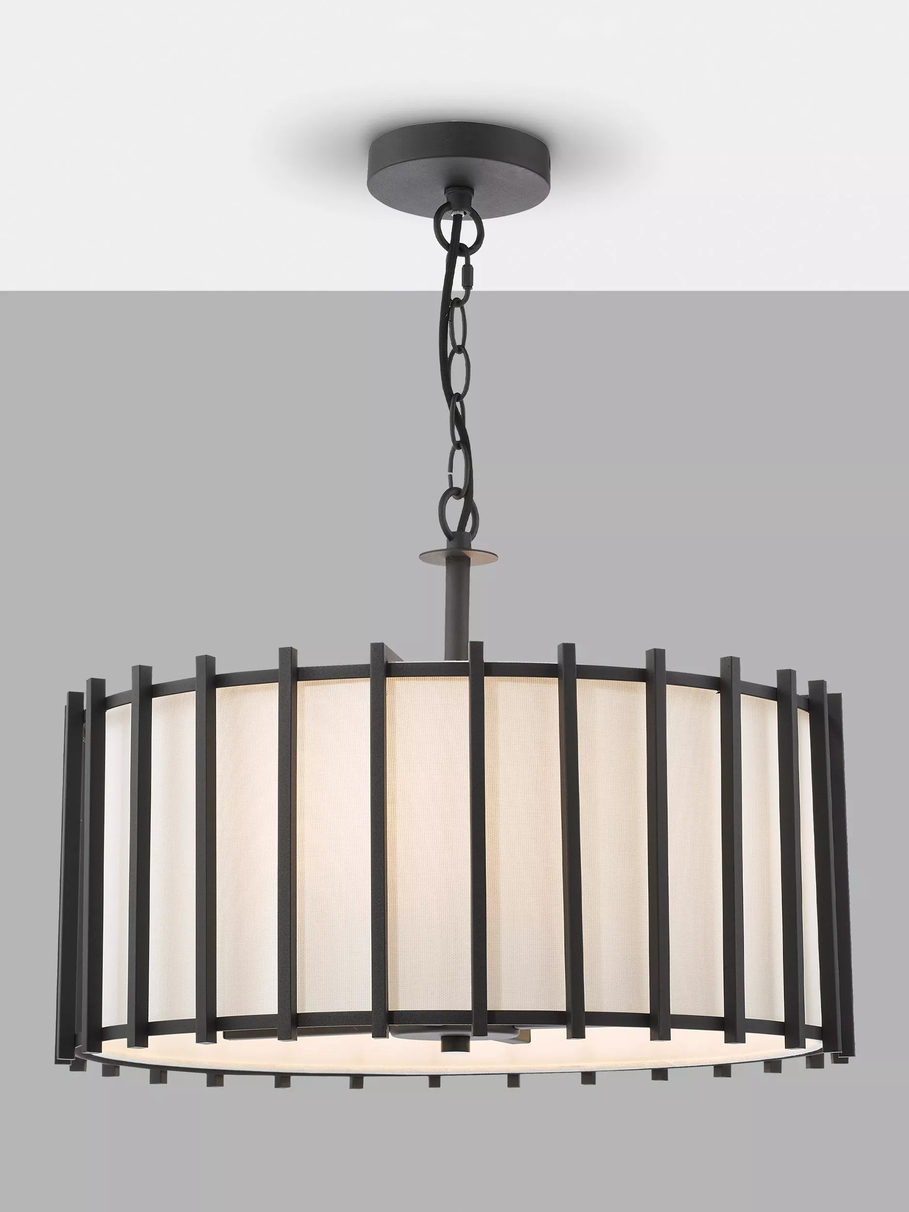 Elevate your space with the Cagliari 4 Light Pendant Light, a stylish black ceiling light that marries contemporary design with timeless elegance. This drum ceiling light features a sleek matt black caged frame, creating a striking contrast against its textured ivory linen shade. The result? A sophisticated pendant that casts a warm, inviting glow in any room.