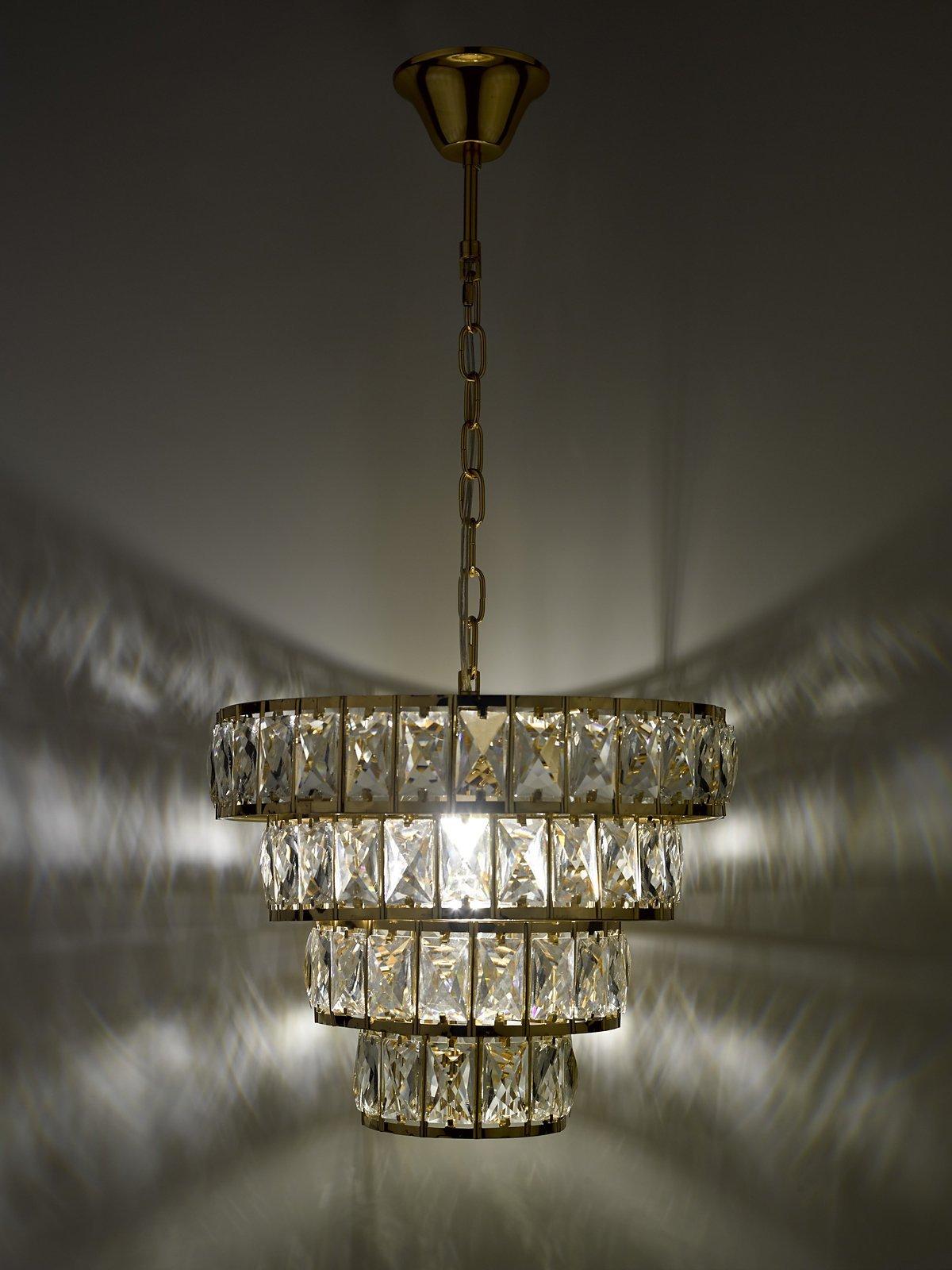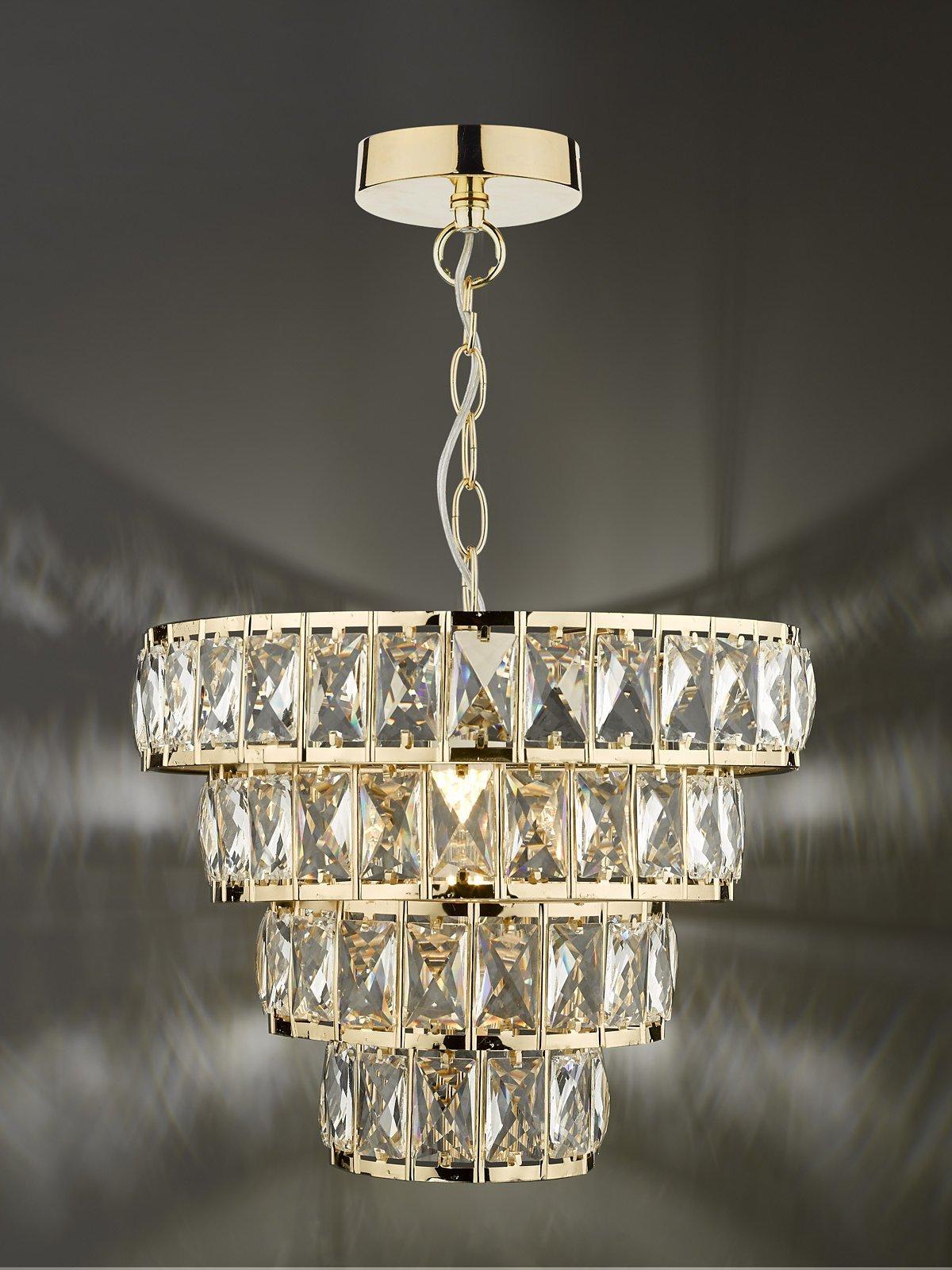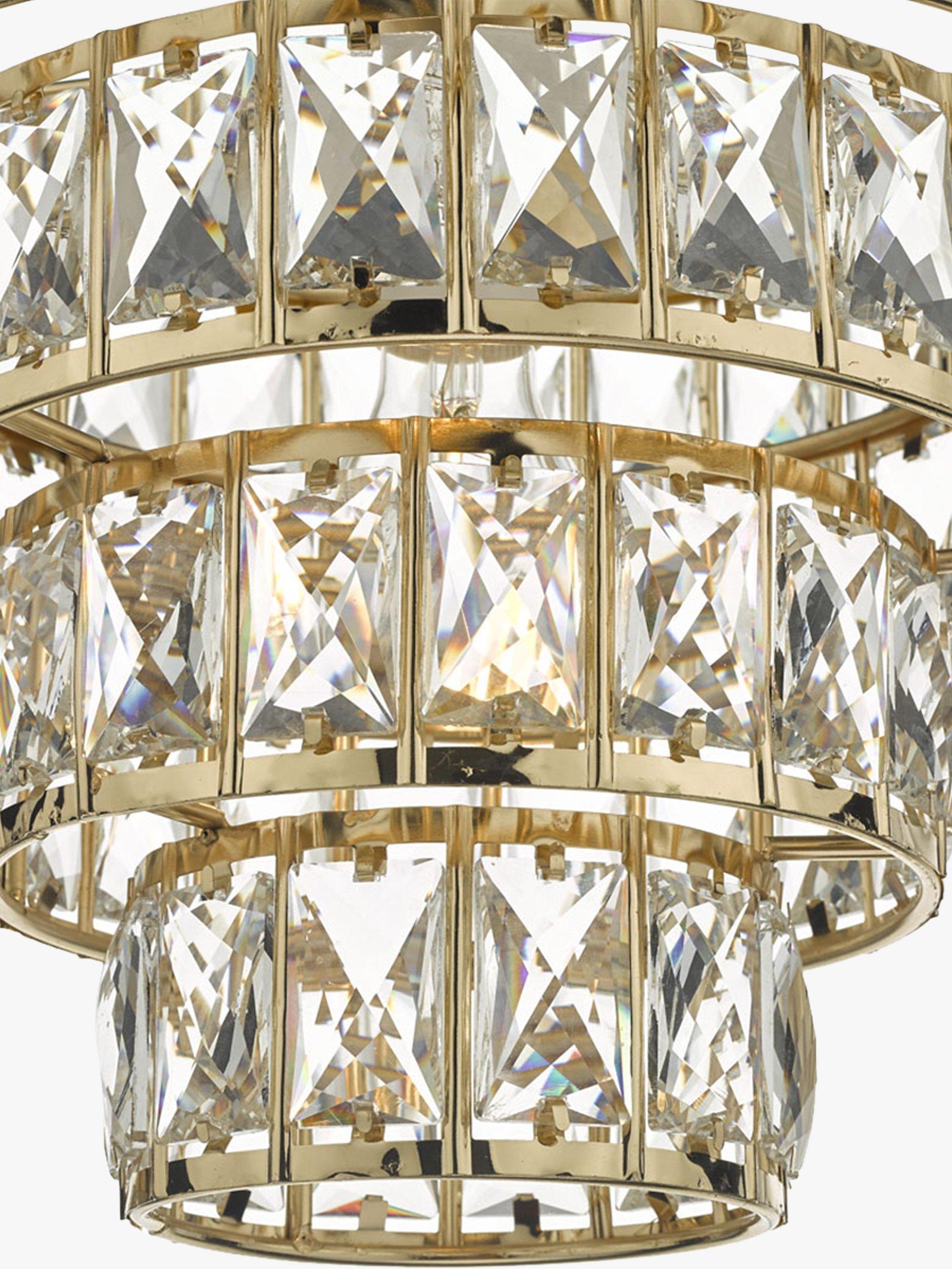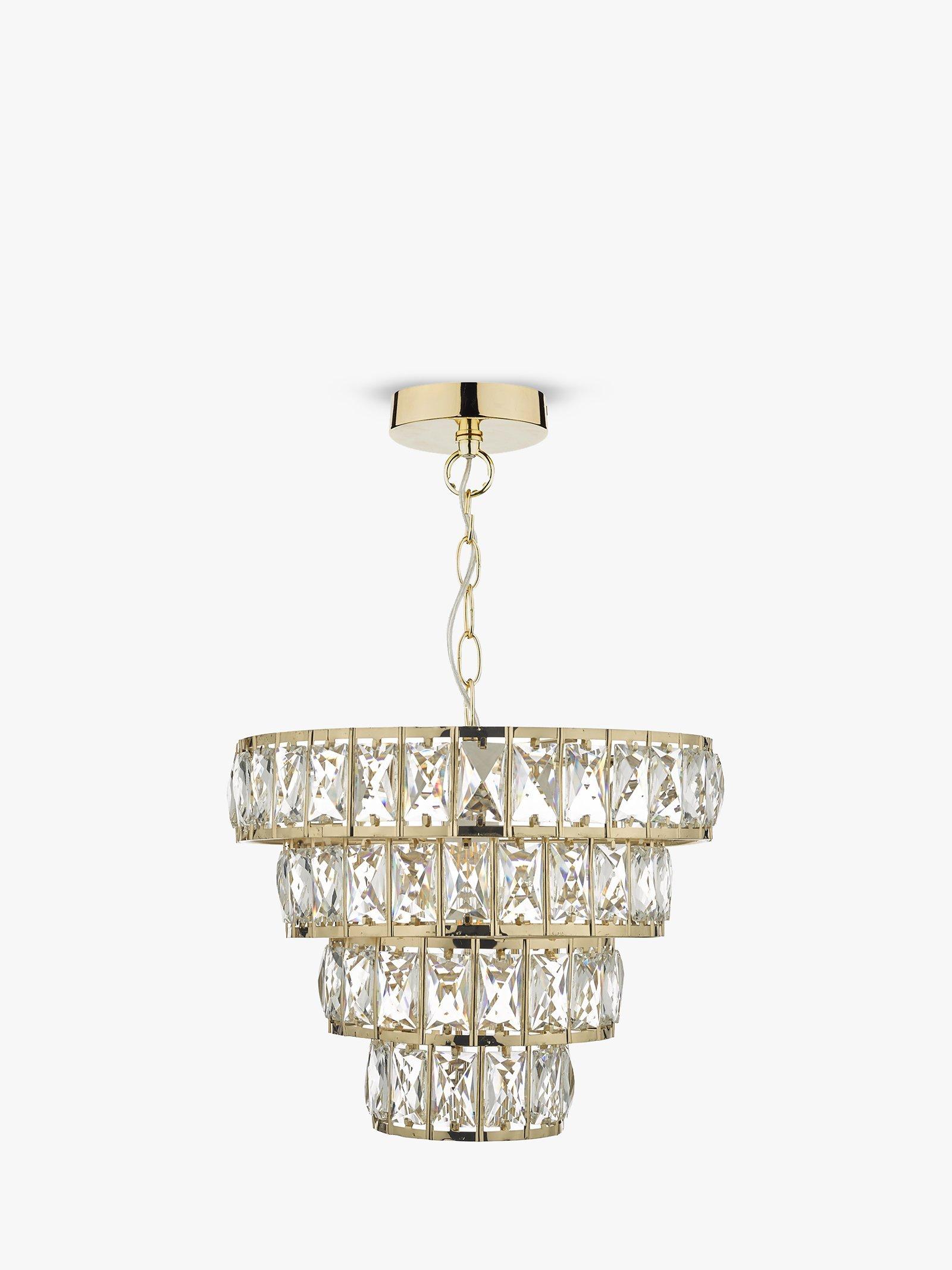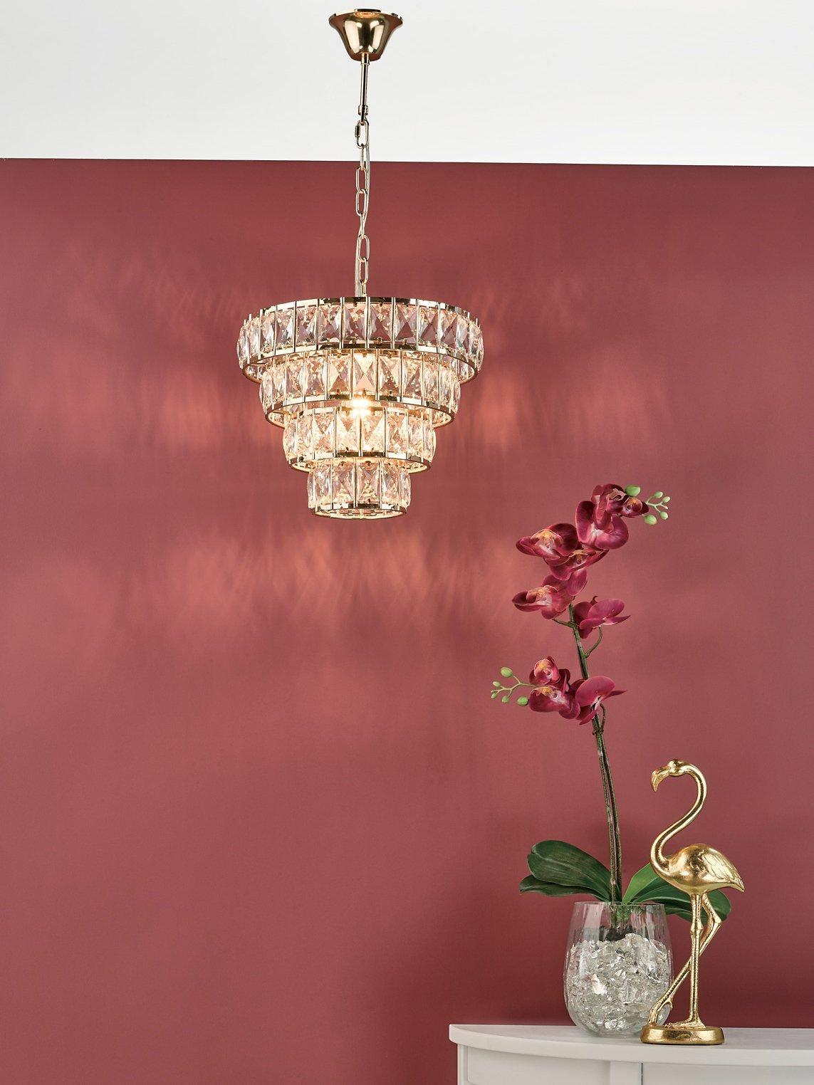 Formed from large lozenge-shaped glass crystals in a tapered formation, this dazzling chandelier will give your room a statement finish. The frame has a smart, polished finish and it's suspended from a height-adjustable chain. When lit, you'll enjoy an eye-catching pattern of light on nearby walls.
