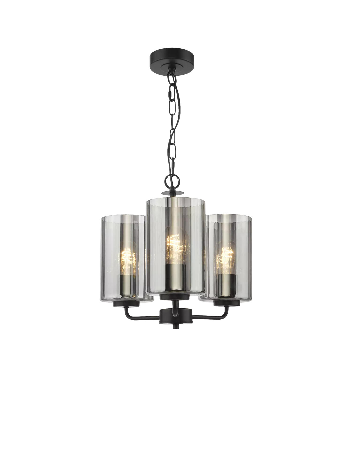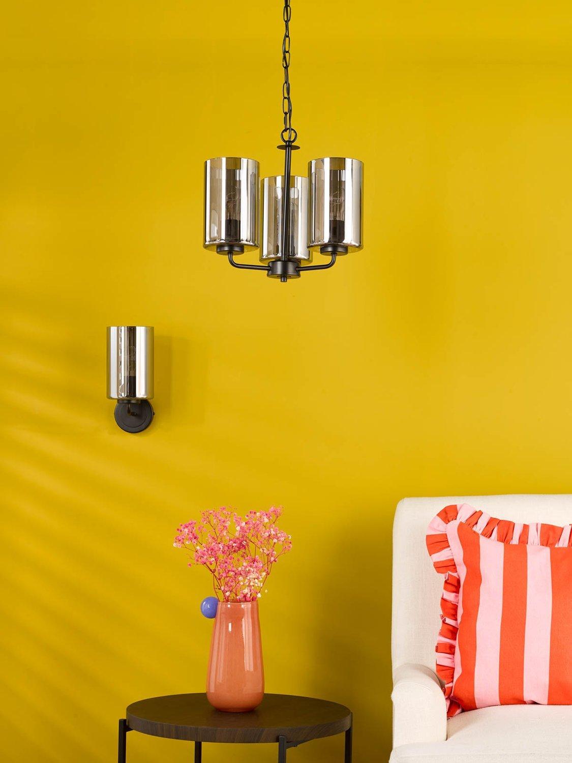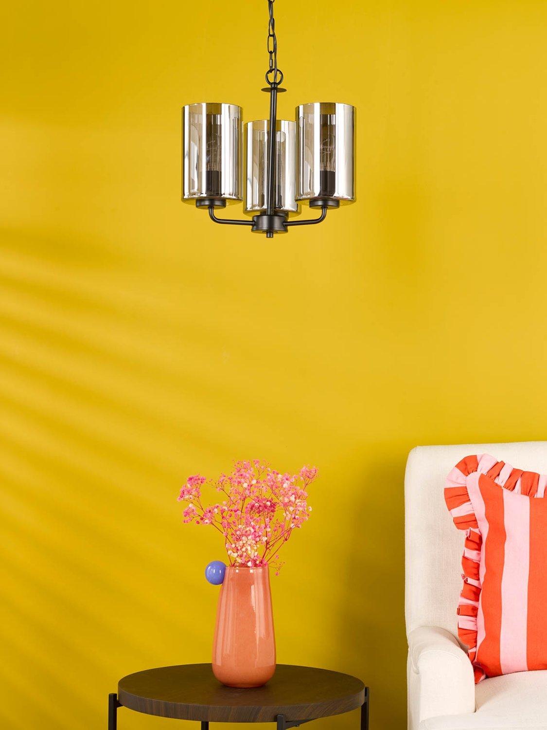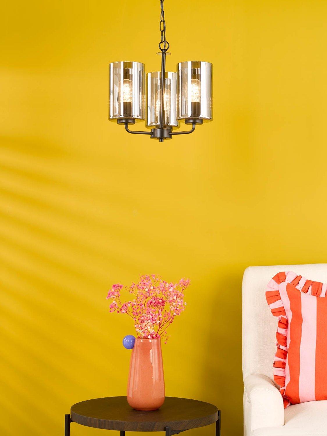 The Daylin three-arm pendant light in muted satin black brings modern glamour and sleek simplicity to larger spaces. Crafted from powder-coated steel with a luxury braided cable, it features three oversized smoked glass shades with a subtle rippled texture, casting a soft, lustrous glow.