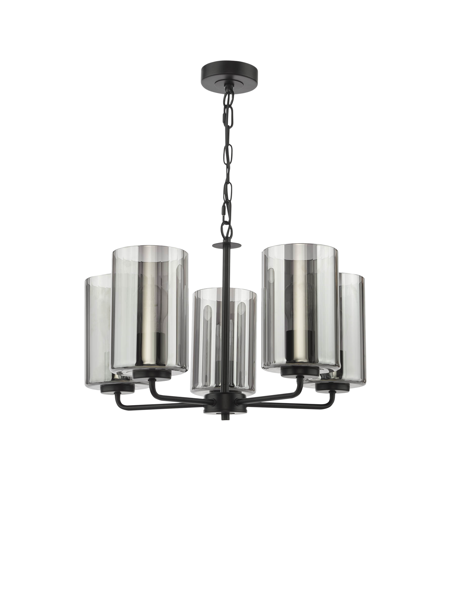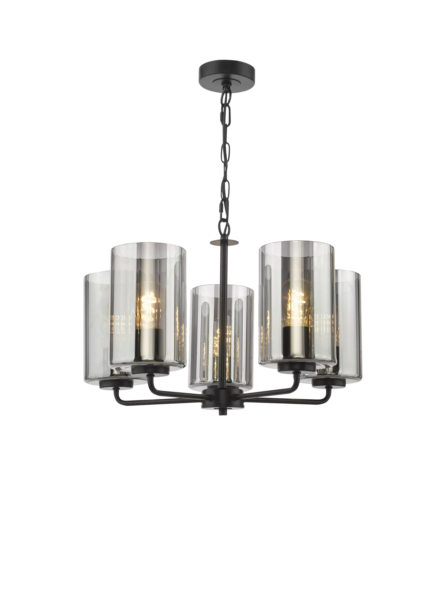 The Daylin five-arm pendant light in muted satin black brings modern glamour and sleek simplicity to larger spaces. Crafted from powder-coated steel with a luxury black braided cable, it features five oversized smoked glass shades with a subtle rippled texture, casting a soft, lustrous glow.