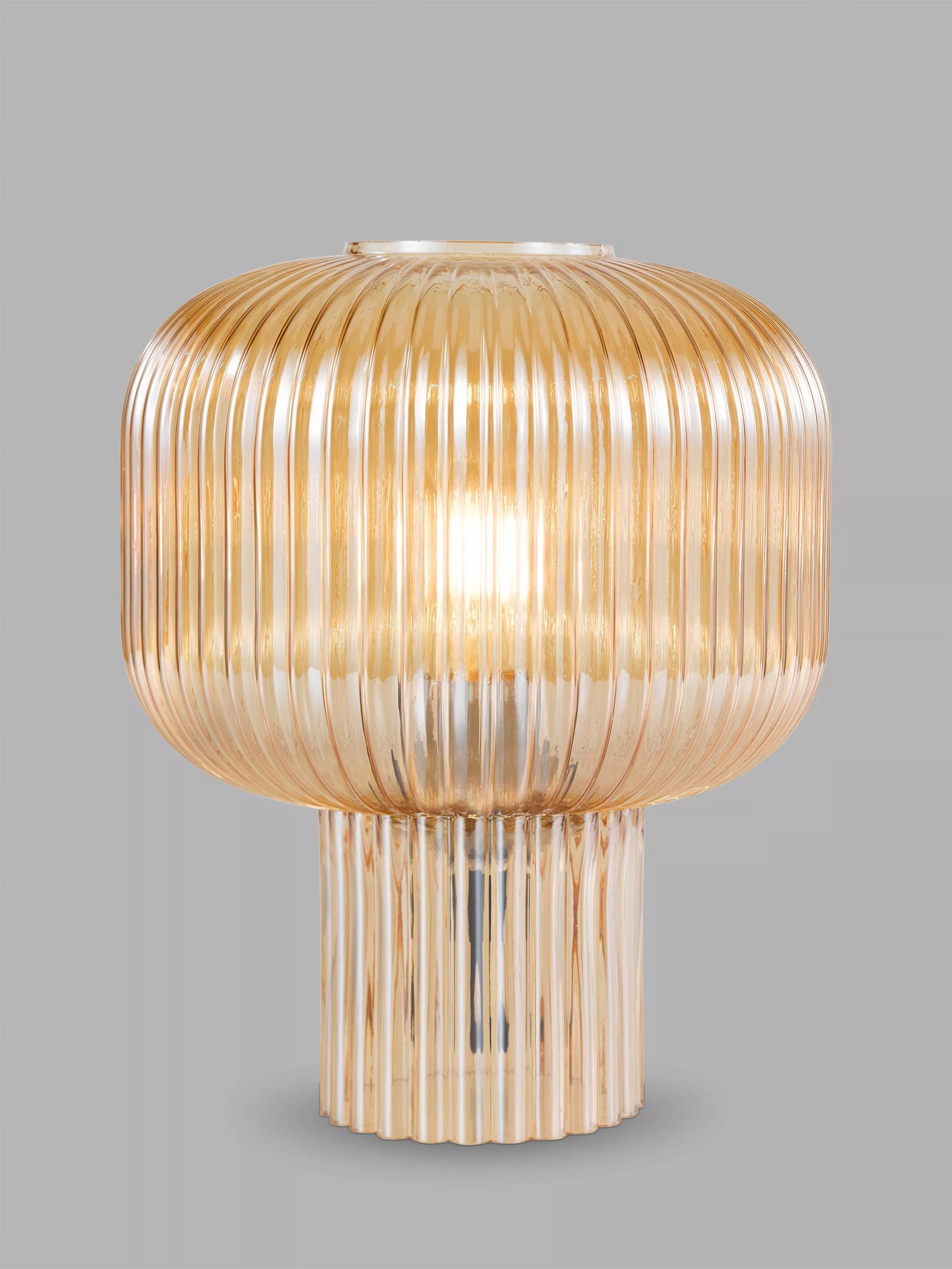 The coordinating ribbed glass base creates a cohesive look. Ideal for modern interiors, this ribbed glass table lamp casts a warm, diffused glow. Whether placed on a bedside table or as a statement piece in your living room, this versatile lamp effortlessly blends form and function.