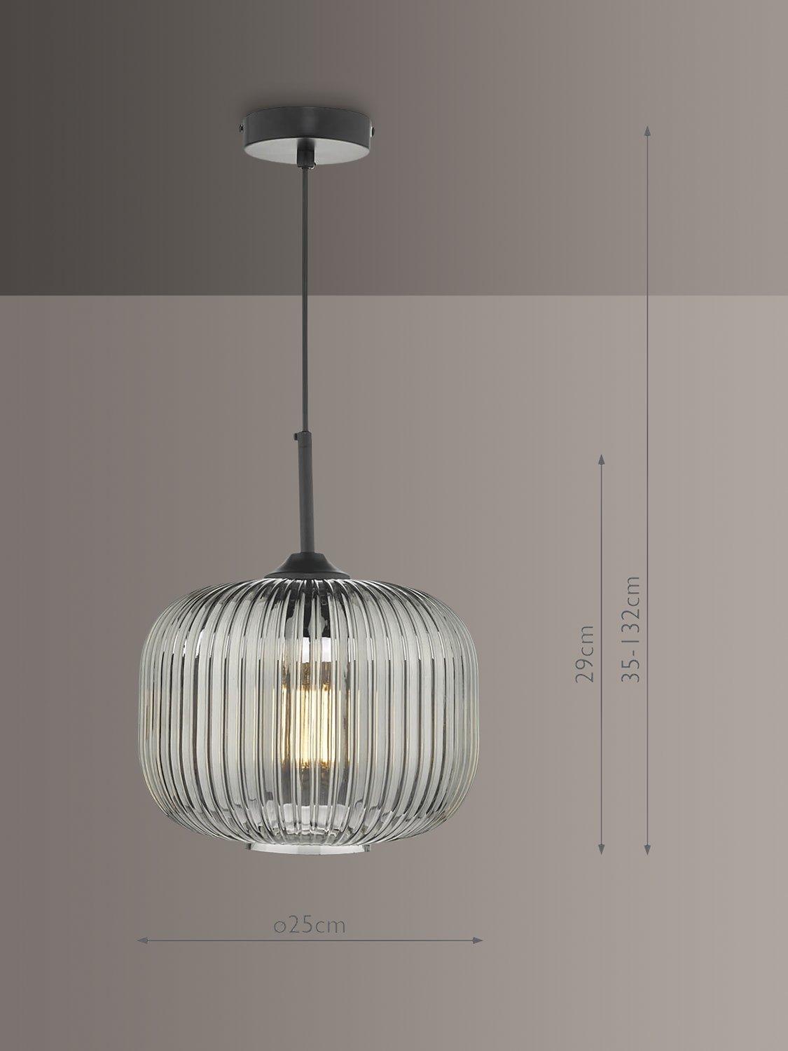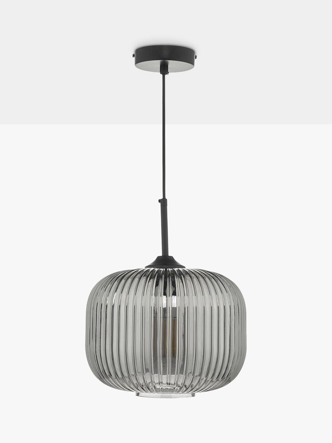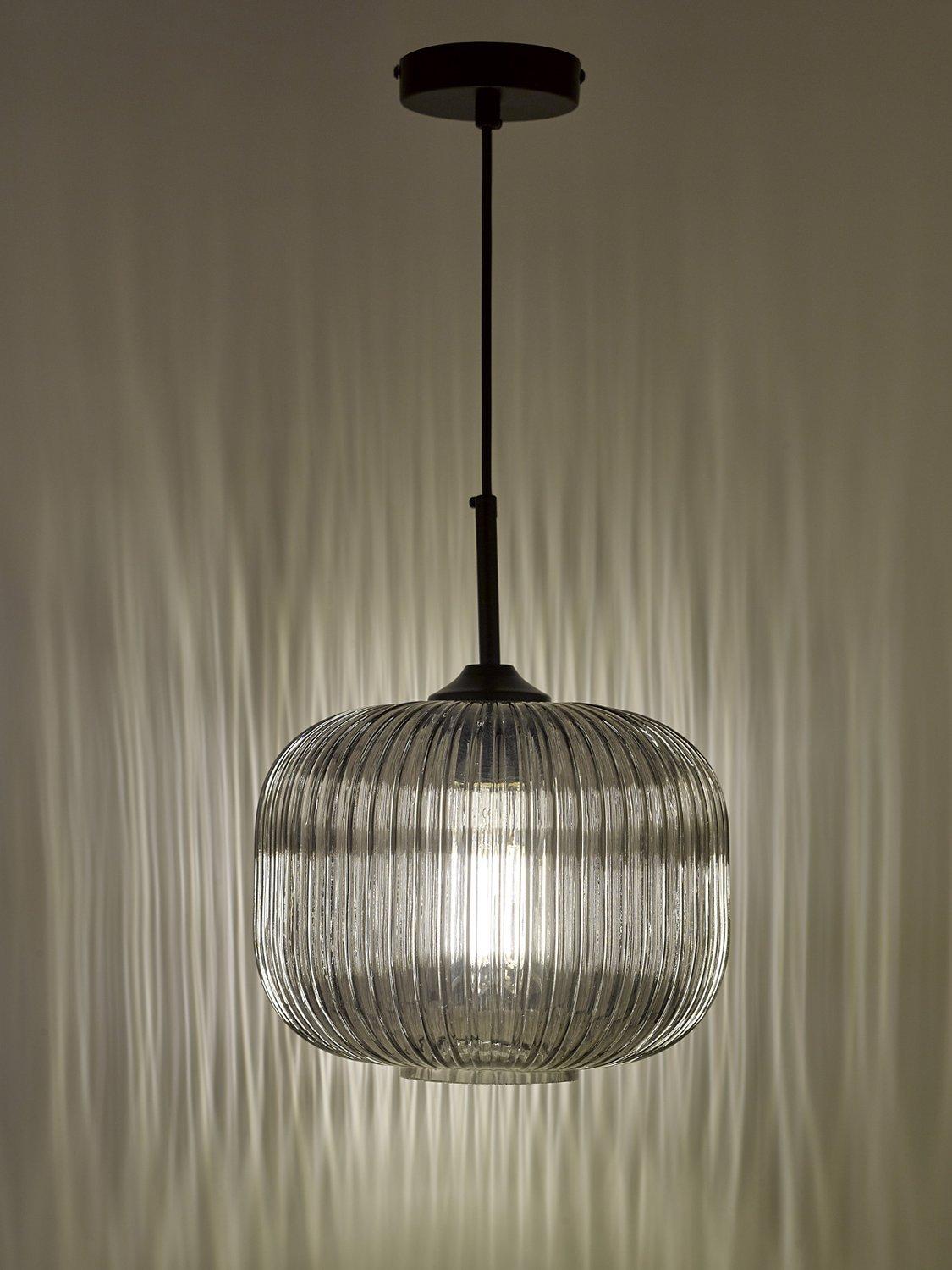 Made from ribbed glass in a smoked finish, this ceiling light has a modern-retro look that will draw the eye in your space. When illuminated, it will create a distinctive pattern of light on nearby walls and enhance a warm glow. Suspended from a height-adjustable braided cable.