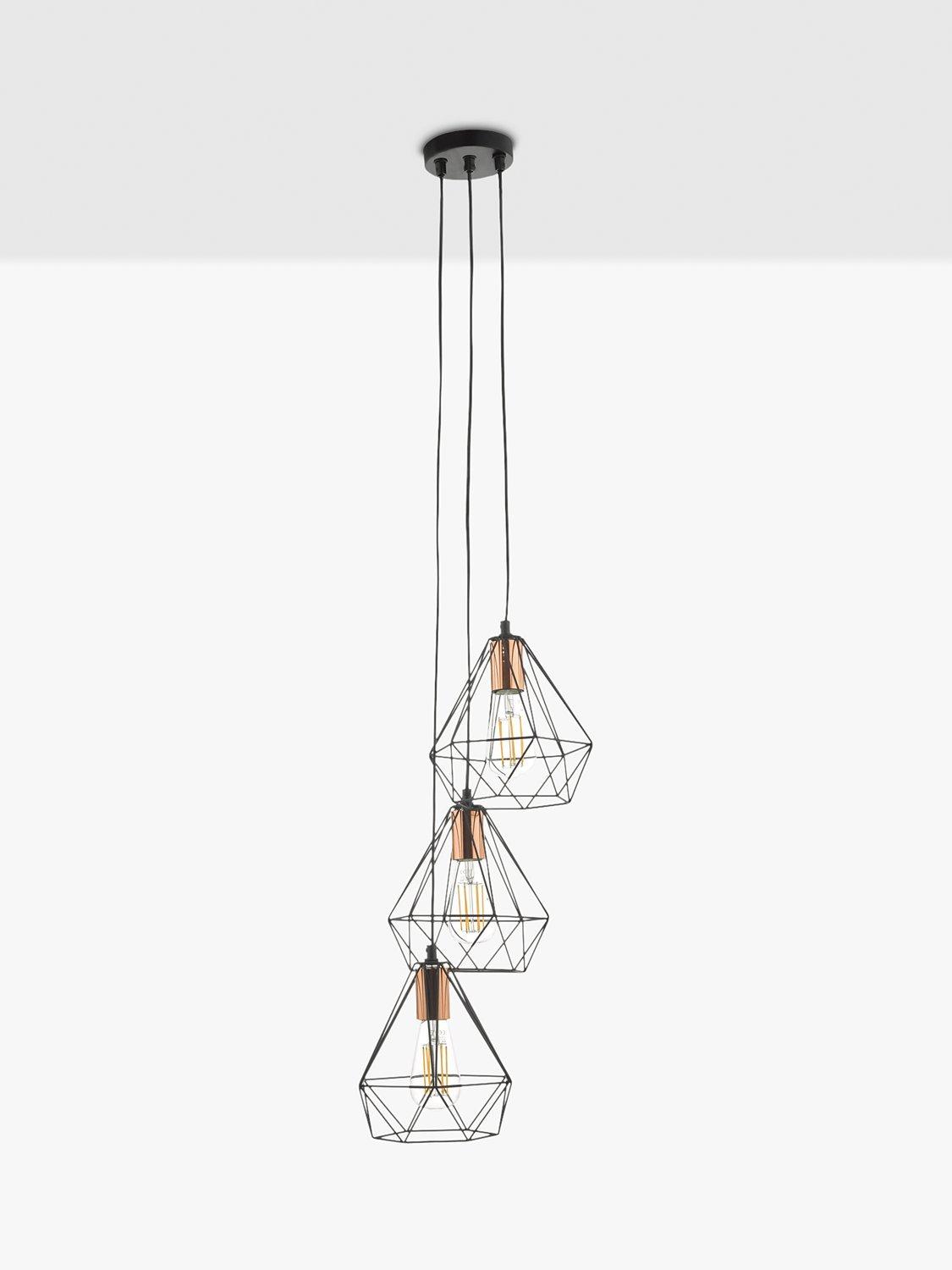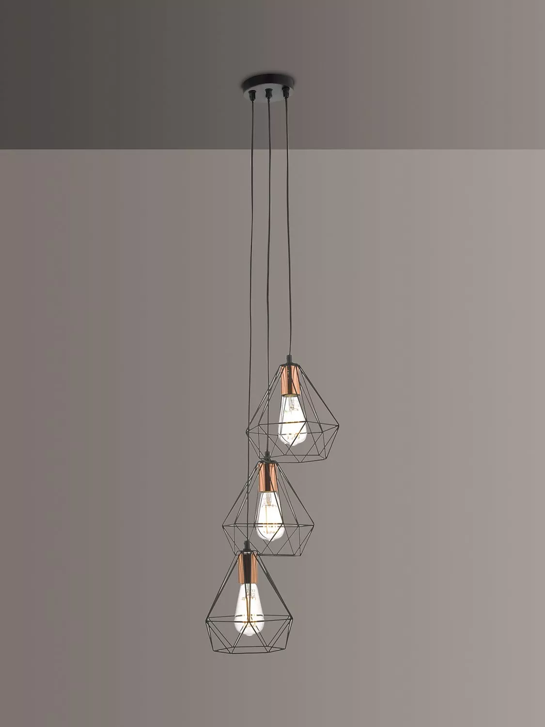 With three pendants suspended in a tiered formation, this ceiling light is a modern option with an industrial edge. Each pendant is made from metal in a geometric style and encases a copper-finished lamp holder. It needs three bulbs in total and is best paired with vintage lamps to achieve the popular, ambient light aesthetic.