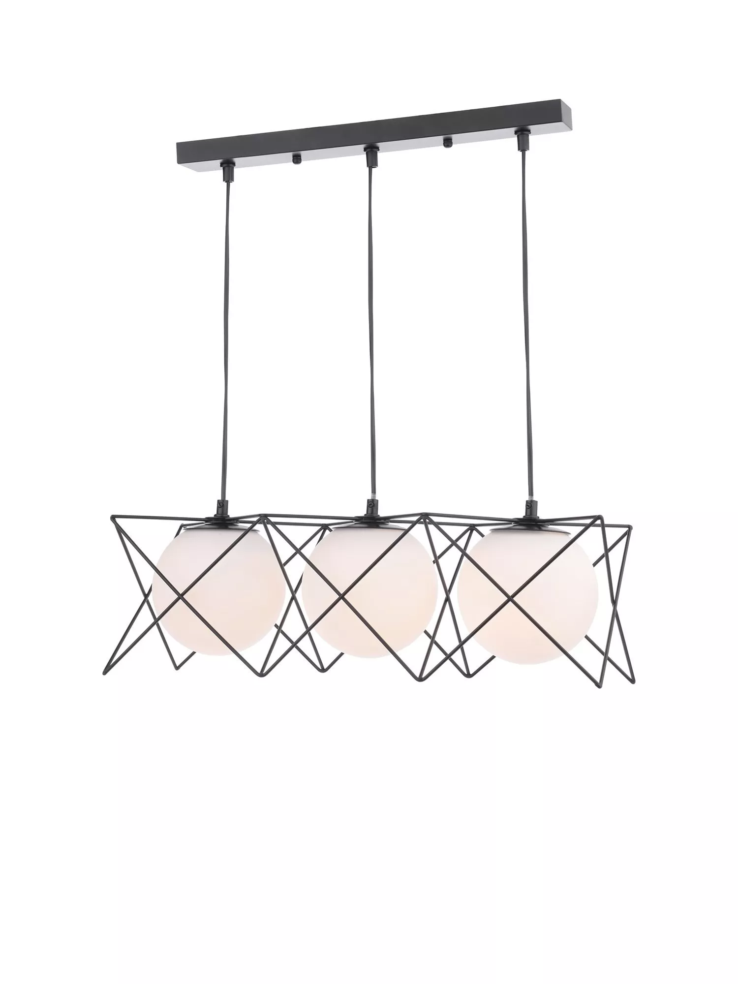 The Dreyson is a contemporary bar pendant ceiling light showcasing three spheres made in opal glass, surrounded by a matte metal frame. The light can be adjusted in height at the point of installation.