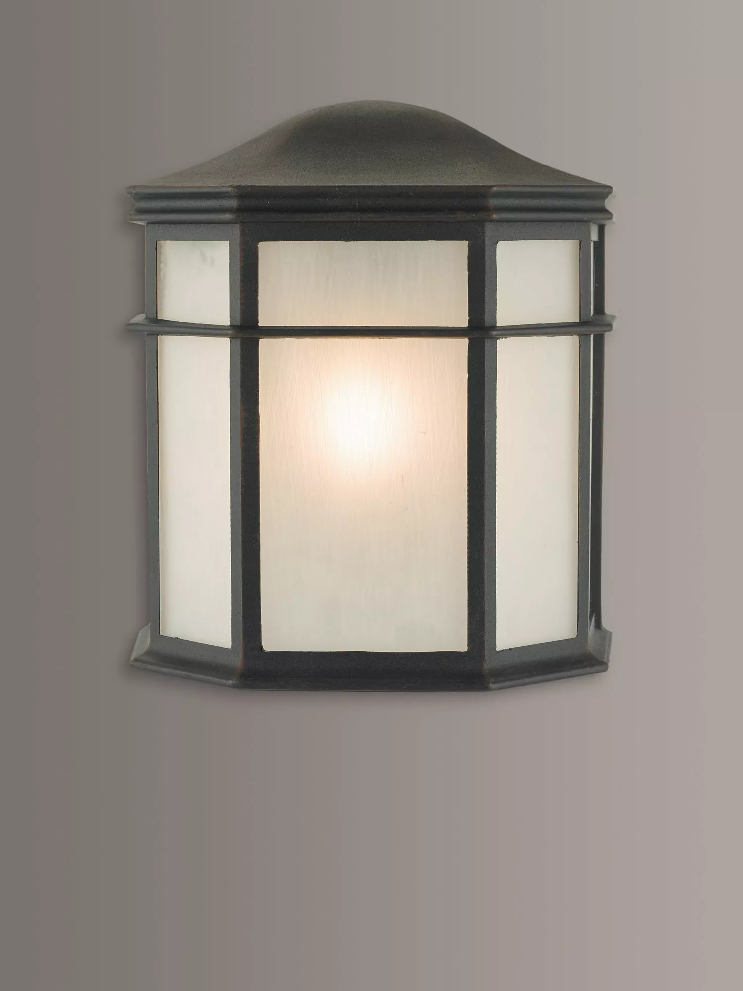 This lantern-style wall light is made from matt, cast aluminium. Three opal acrylic panels have an aged-effect finish which enhances an ambient glow of light. IP44 rated and resistant to splashing water. Each wall light is hand-finished so may vary in appearance.