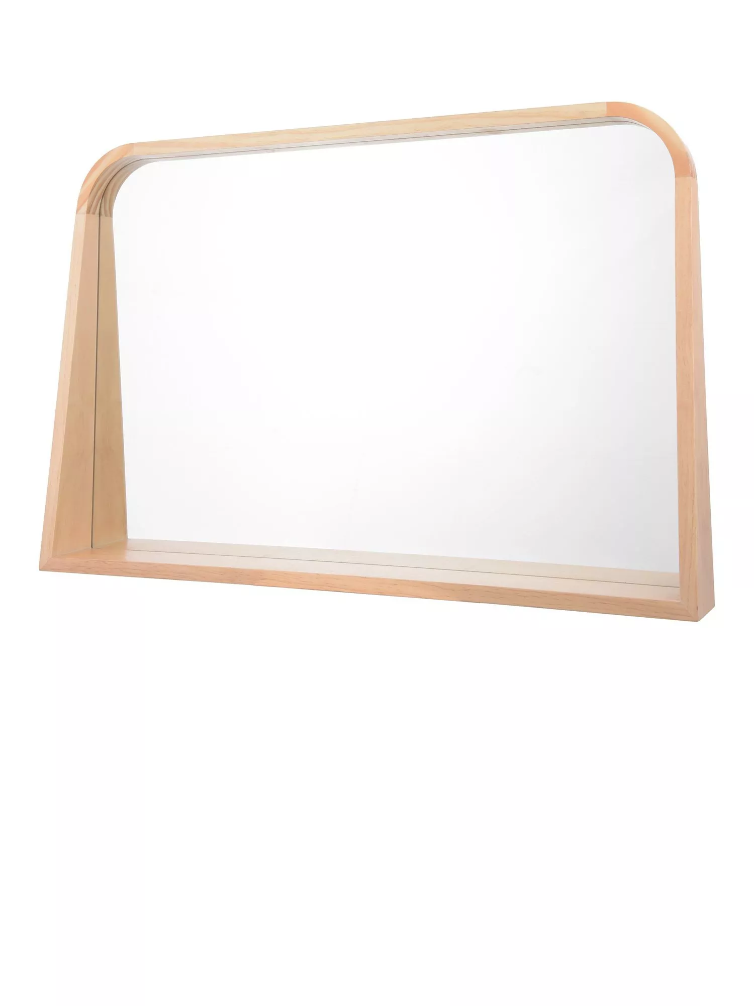 The Fulgencio wall mirror from Där features a contemporary solid wood frame with a mix of curved and angled corners in a light natural finish. Incorporated into the design, a narrow shelf can be used for small decorative objects or in a hallway for essentials.