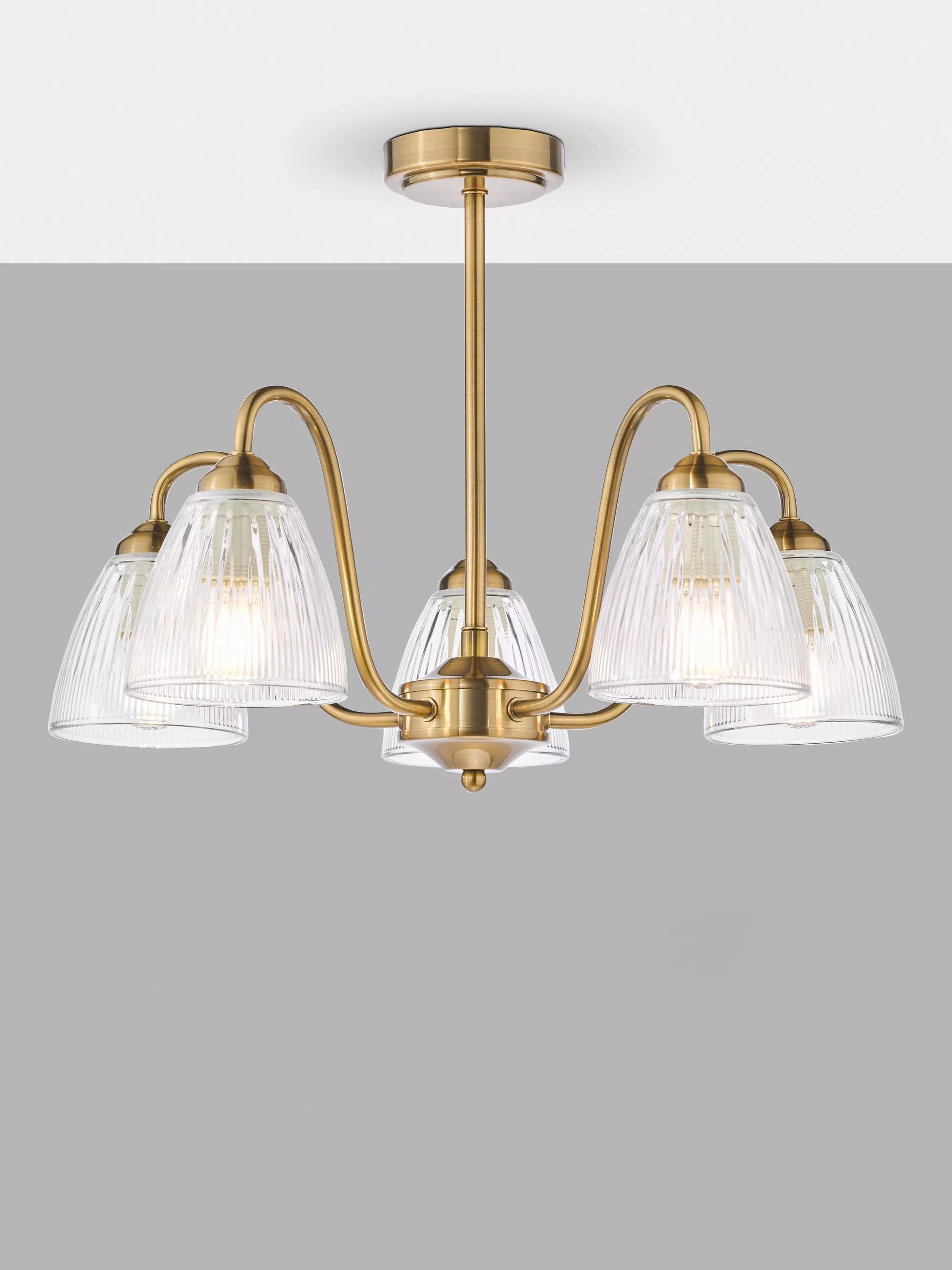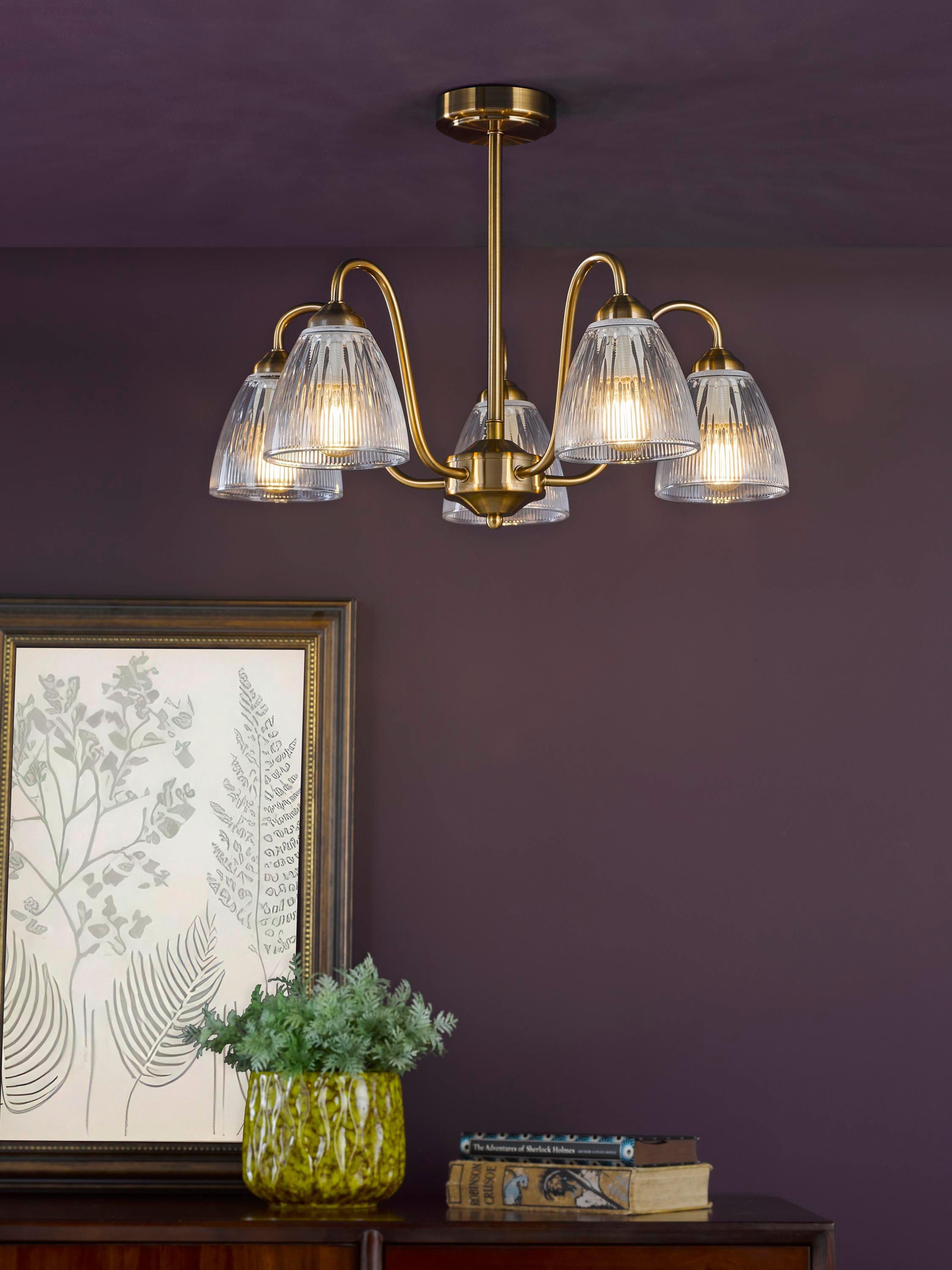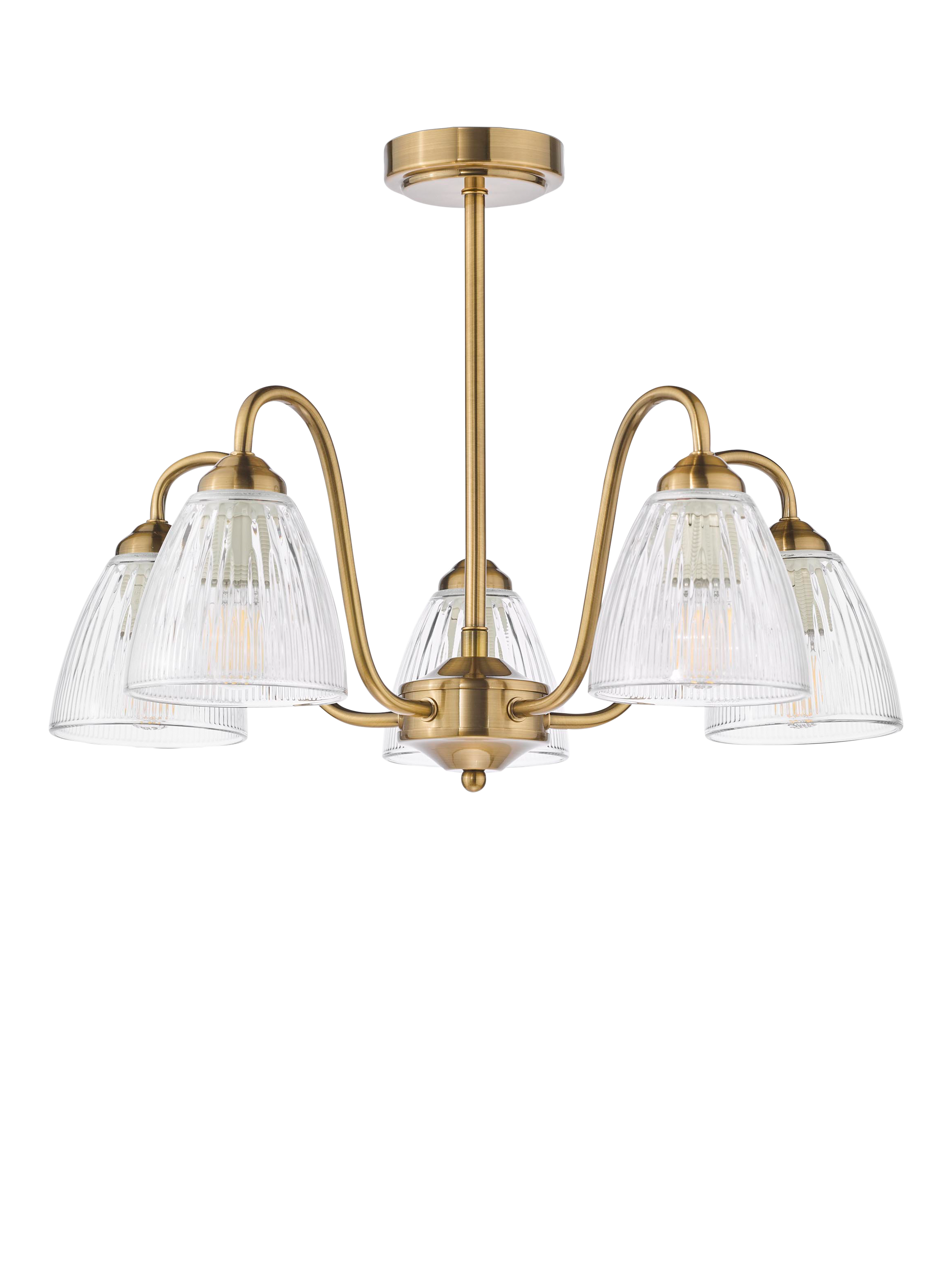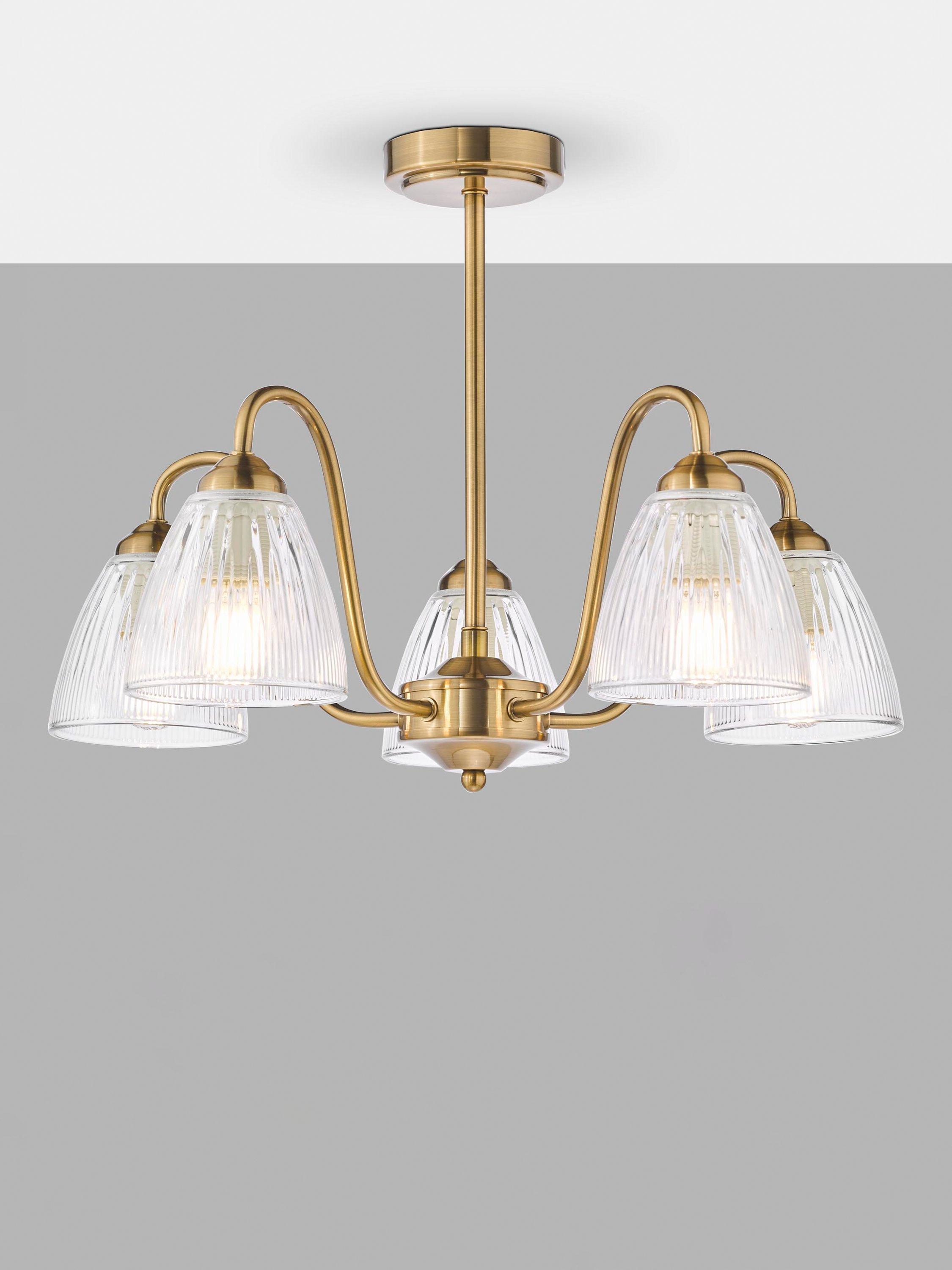 The Glynis 5 Arm Semi Flush Ceiling Light is ideal for lighting low ceilings. This traditional-style fixture features clear ribbed glass shades, adding texture and visual interest to any room. The Glynis semi-flush ceiling light creates a cosy ambience while providing ample illumination for your living areas.