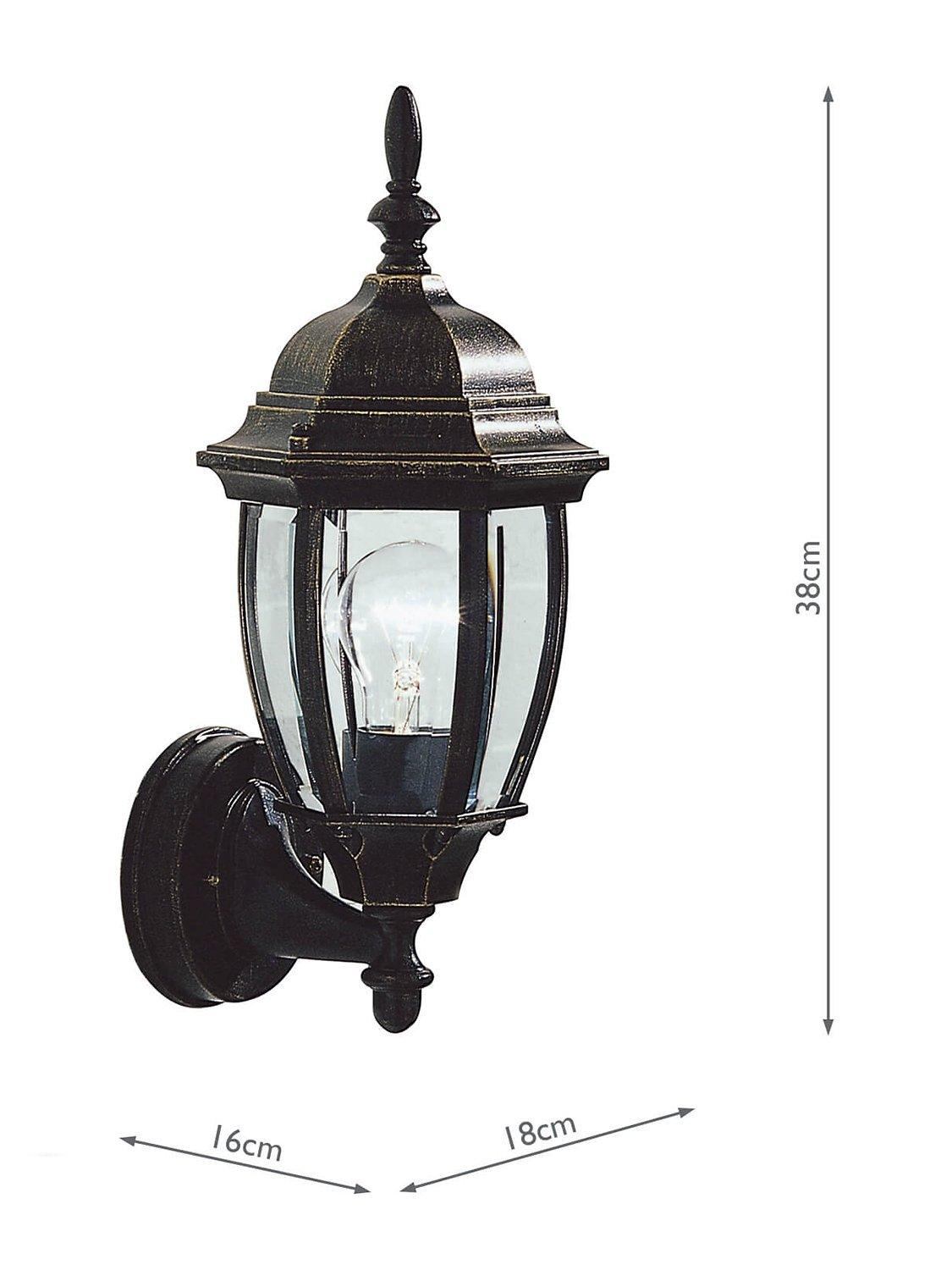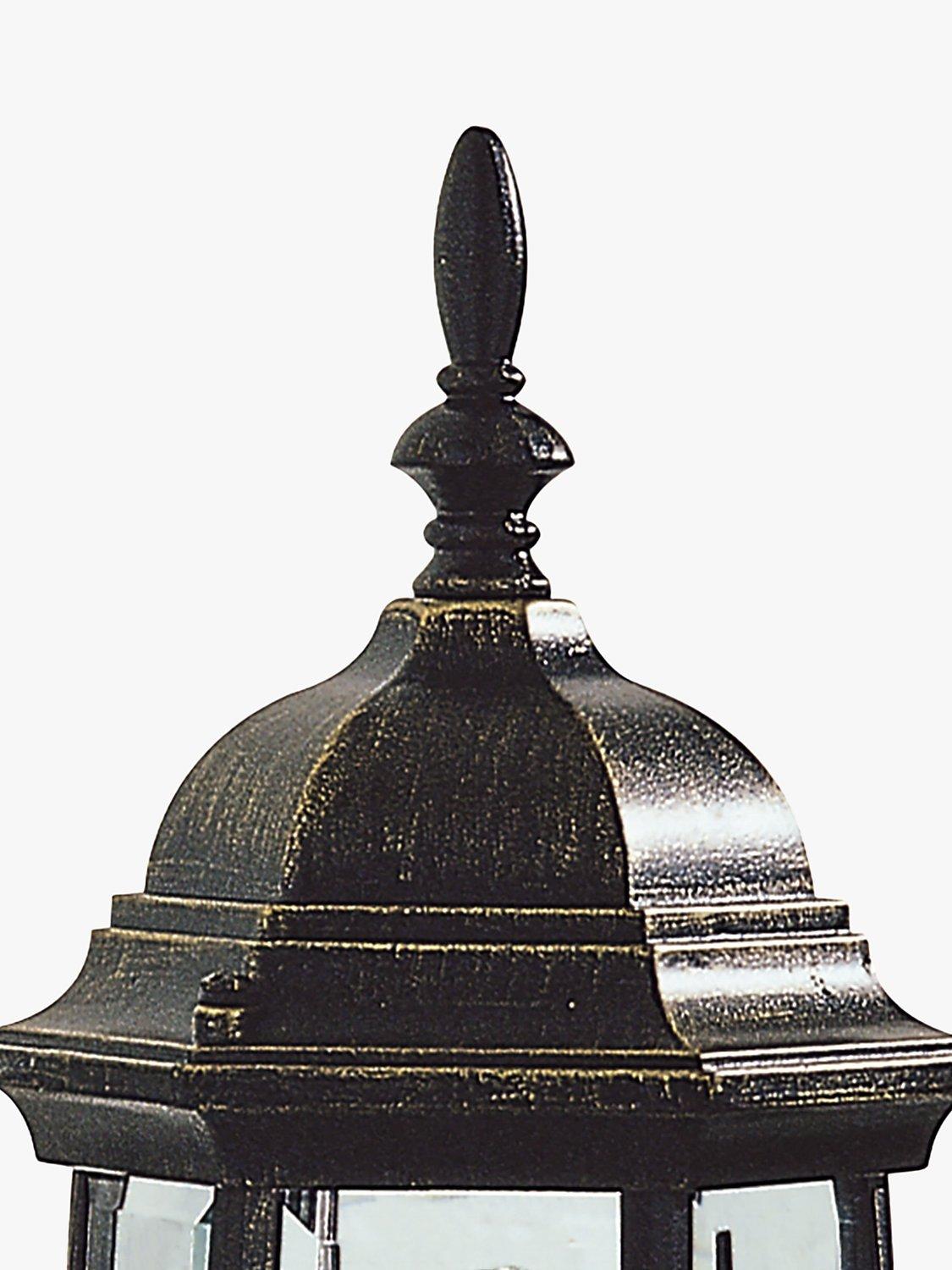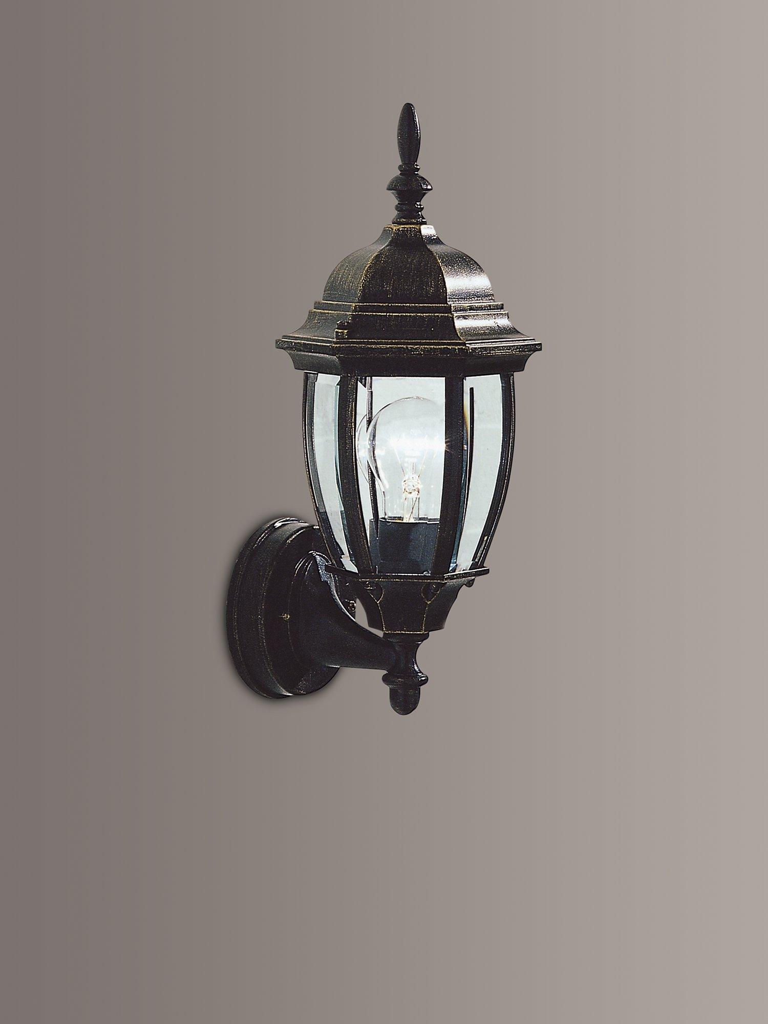 A traditional outdoor wall light made from robust cast aluminium alloy with bevelled edge glass panels. Ideal for illuminating front porches and finished with subtle gold detailing to enhance an antique look.