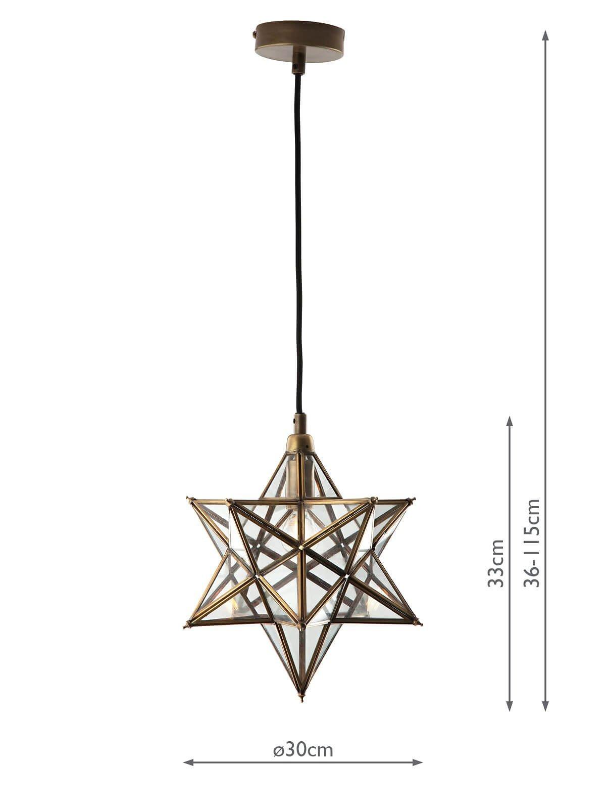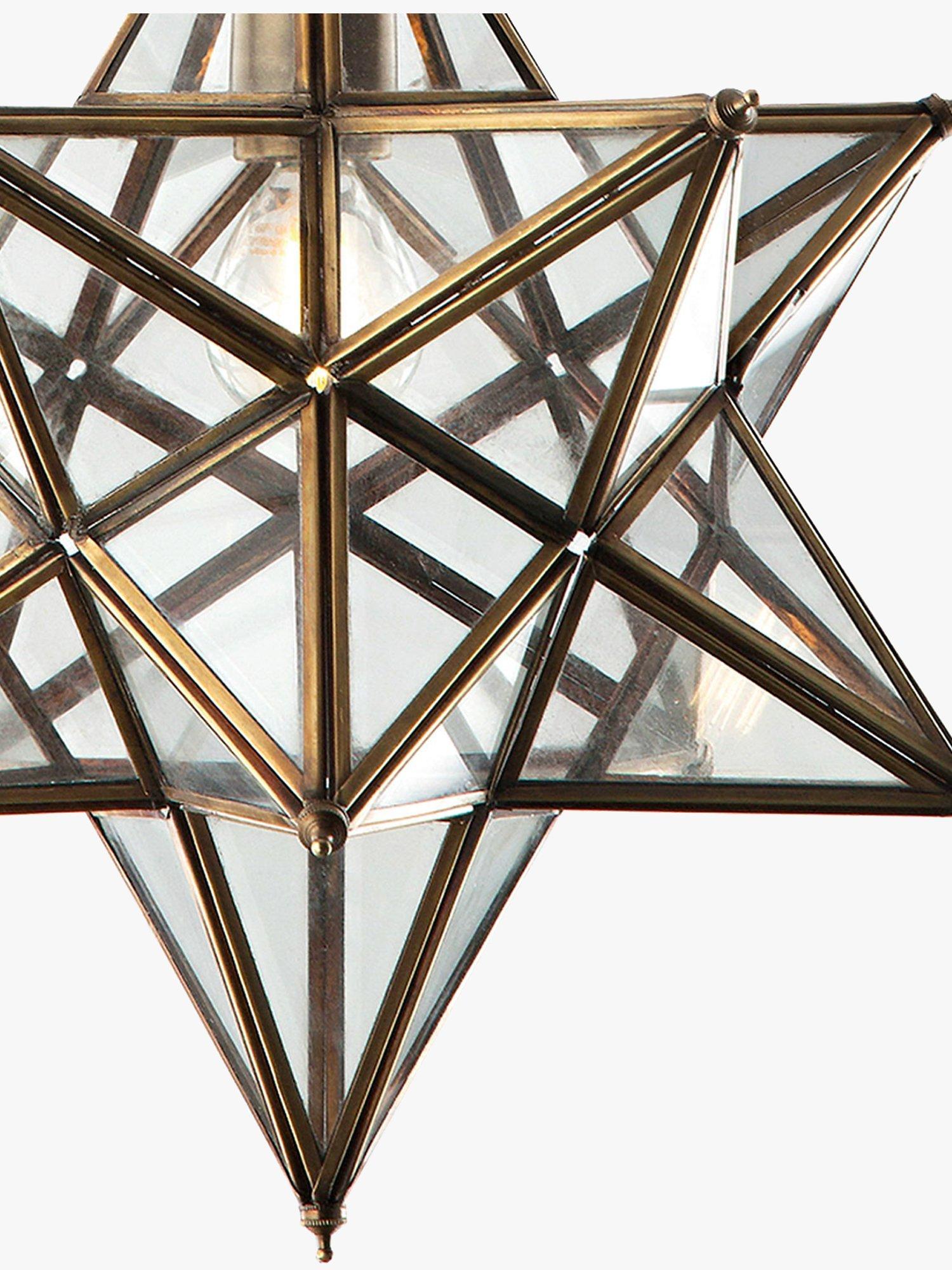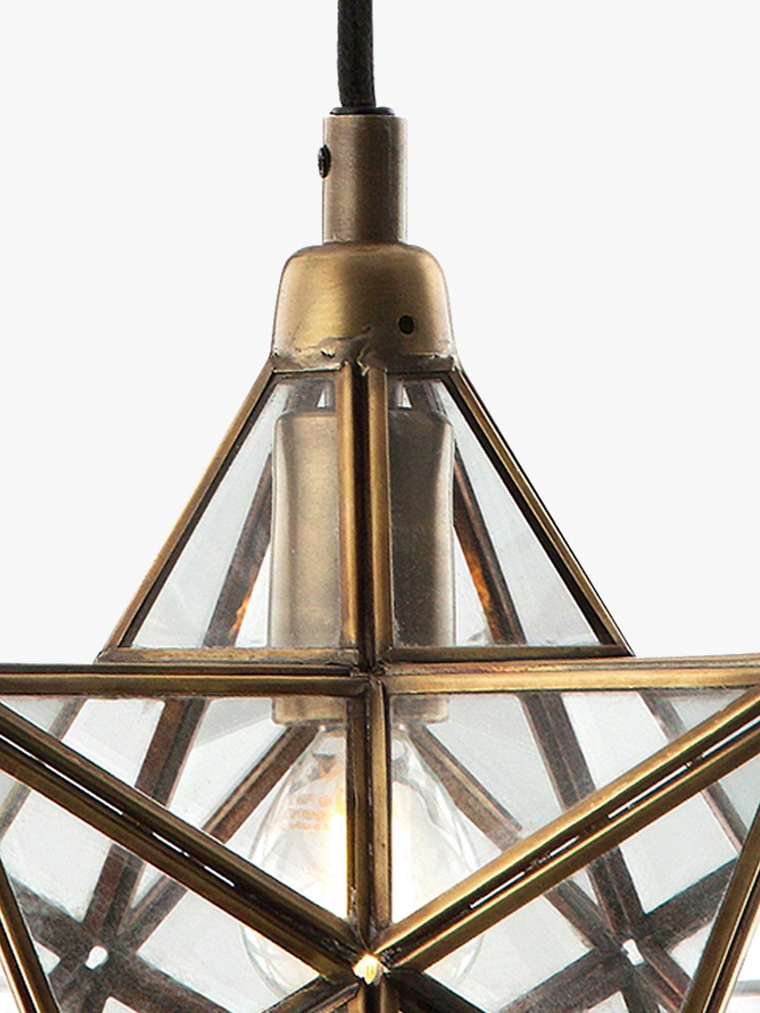Add character to your room with this charming ceiling light, made from panels of glass to create a three-dimensional star pendant. The antique brass finish gives it a rustic look and a hinged door makes it easy to add and change the bulb.