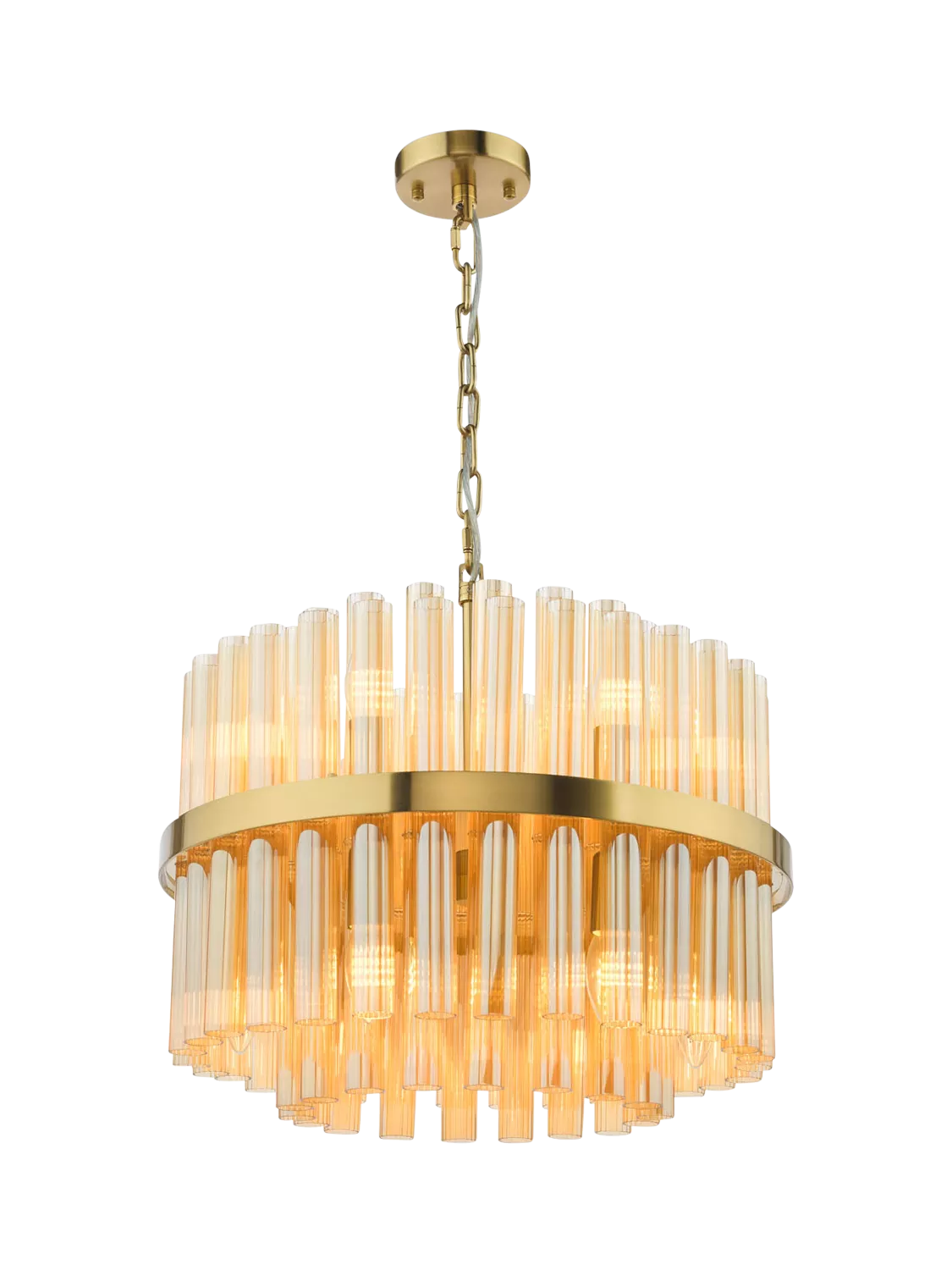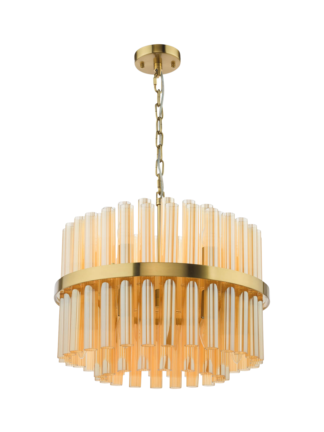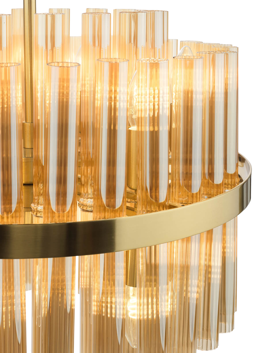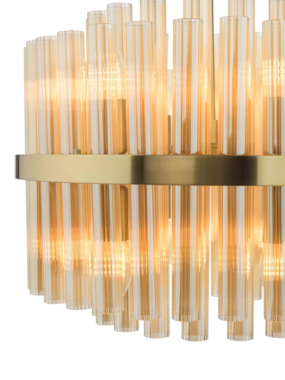The Imani 12 light pendant in natural brass and amber glass brings warmth and understated luxury to modern interiors. Oversized ribbed amber glass rods encircle a refined brass ring, diffusing a soft, inviting glow with subtle architectural presence. The polished brass interior enhances the illumination, creating the impression of floating glass and adding depth to the design.
