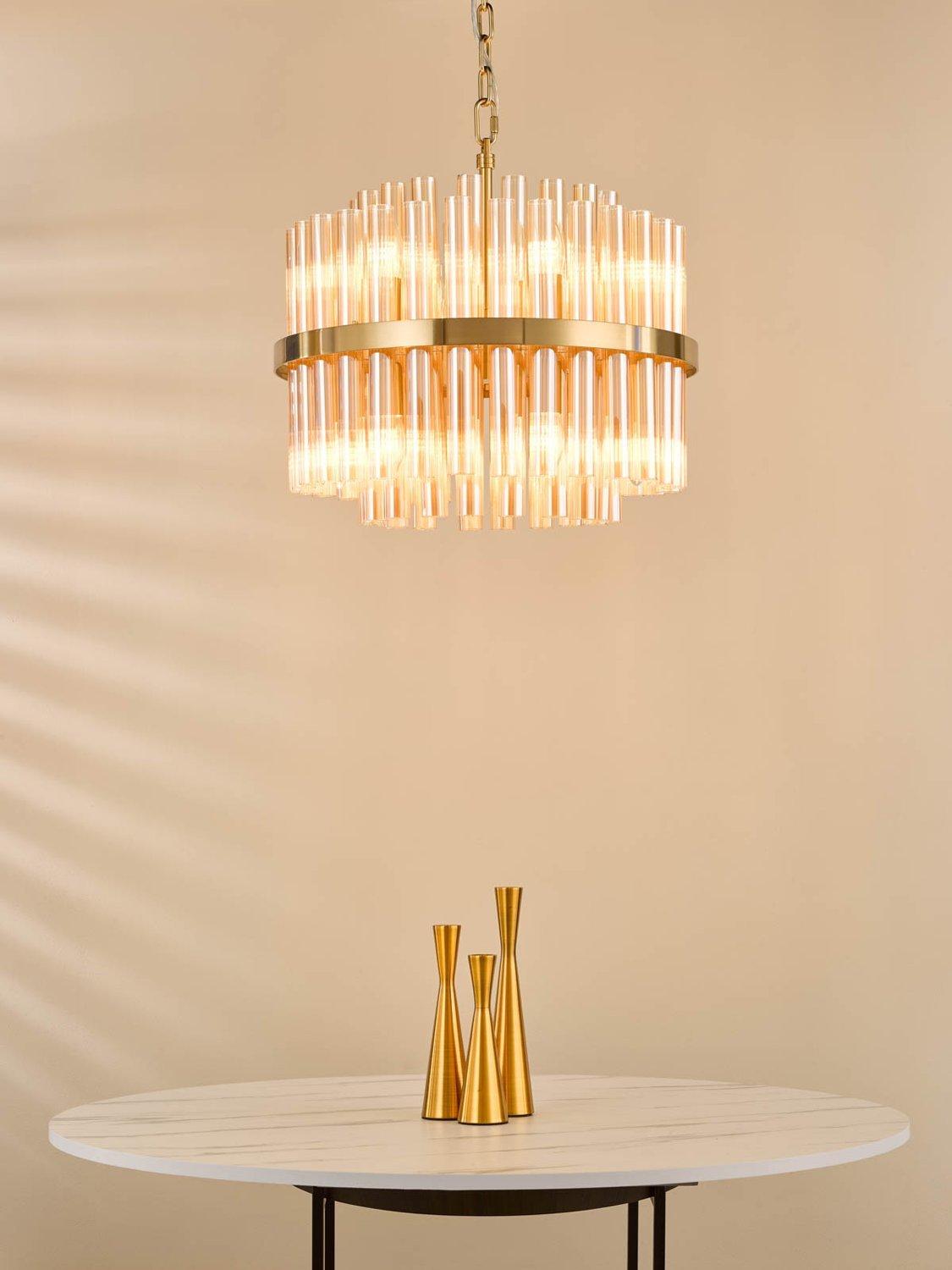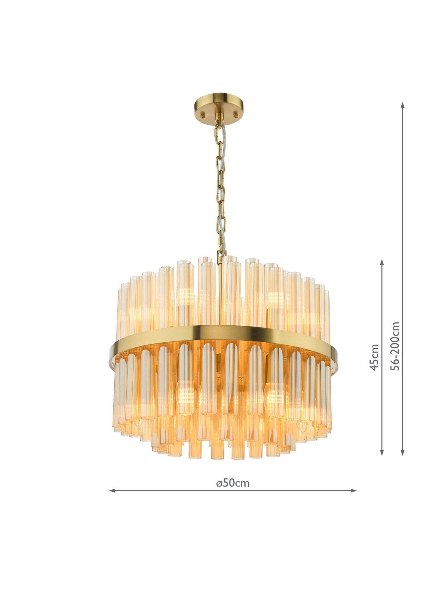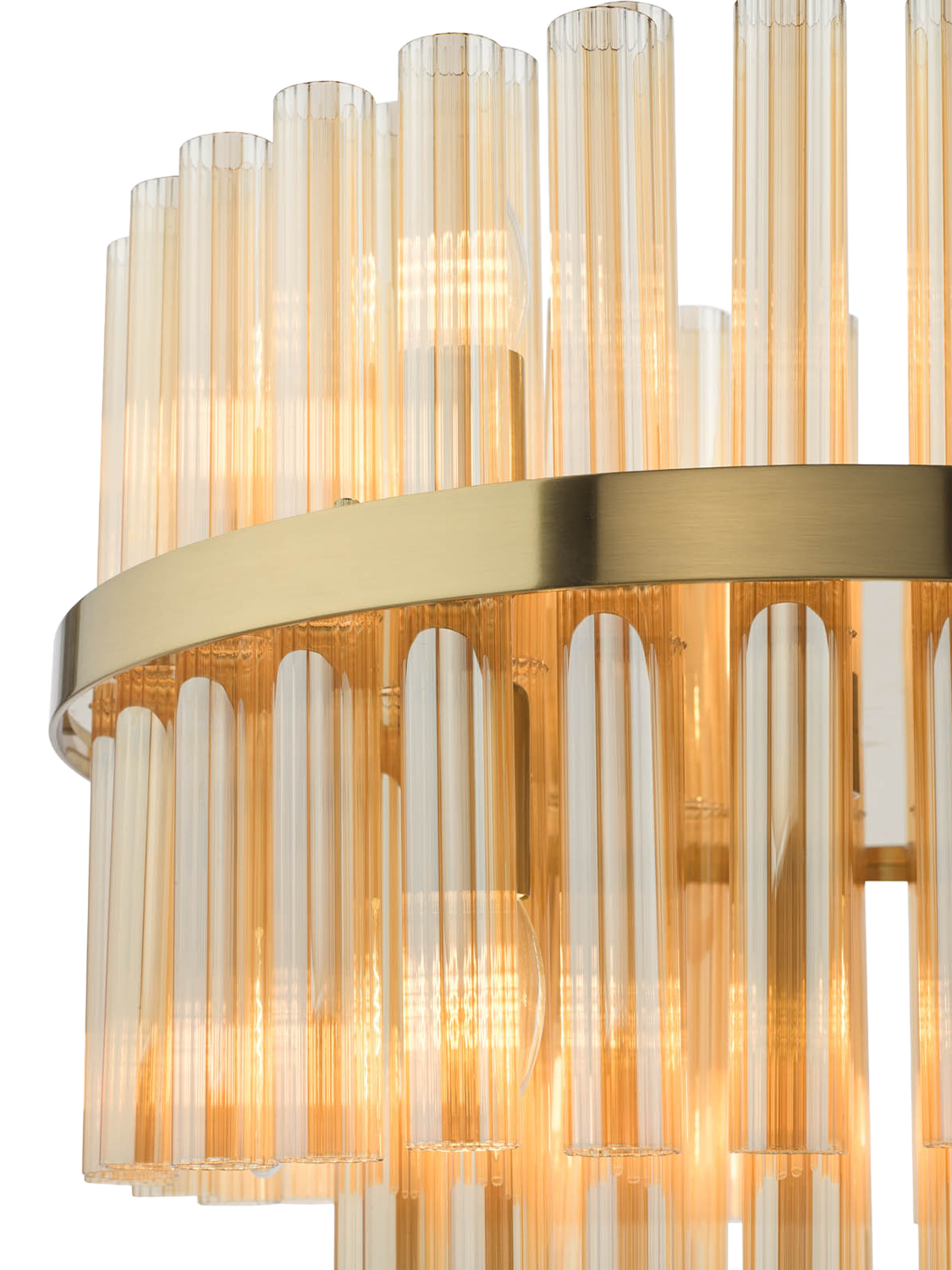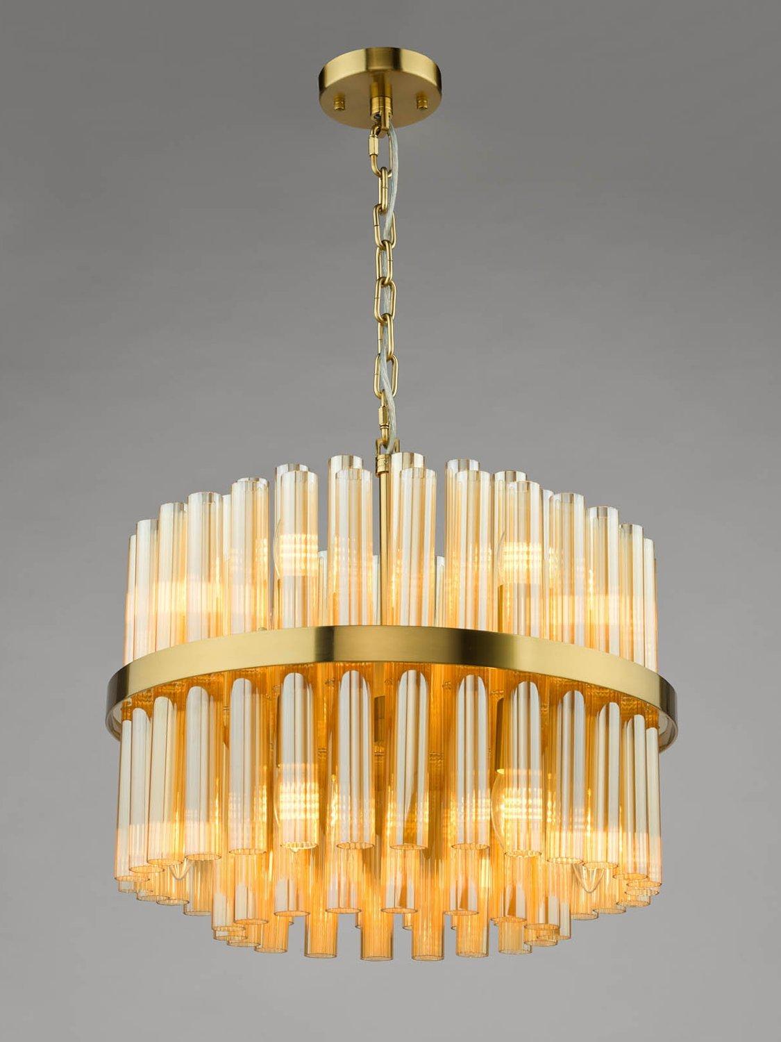 The Imani 12 light pendant in natural brass and amber glass brings warmth and understated luxury to modern interiors. Oversized ribbed amber glass rods encircle a refined brass ring, diffusing a soft, inviting glow with subtle architectural presence. The polished brass interior enhances the illumination, creating the impression of floating glass and adding depth to the design.